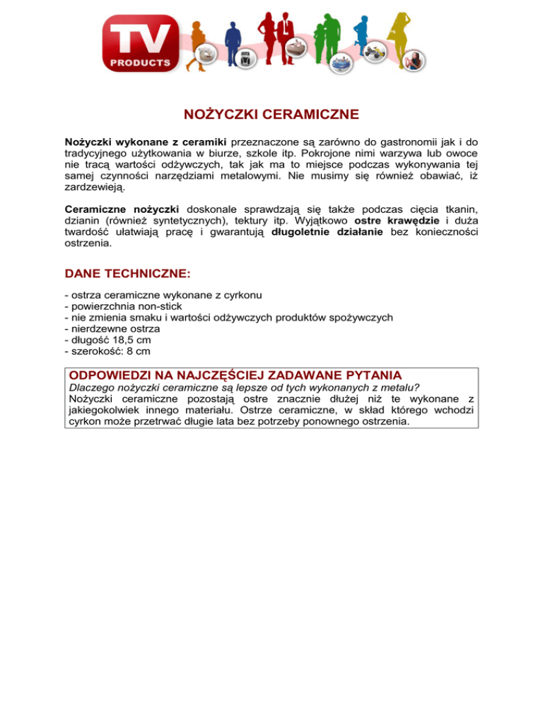 NOŻYCZKI CERAMICZNE Nożyczki wykonane z ceramiki przeznaczone są zarówno do gastronomii jak i do tradycyjnego użytkowania w biurze, szkole itp. Pokrojone nimi warzywa lub owoce nie tracą wartości odżywczych, tak jak ma to miejsce podczas wykonywania tej samej czynności narzędziami metalowymi. Nie musimy się również obawiać, iż zardzewieją. Ceramiczne nożyczki doskonale sprawdzają się także podczas cięcia tkanin, dzianin (również syntetycznych), tektury itp. Wyjątkowo ostre krawędzie i duża twardość ułatwiają pracę i gwarantują długoletnie działanie bez konieczności ostrzenia. DANE TECHNICZNE: - ostrza ceramiczne wykonane z cyrkonu - powierzchnia non-stick - nie zmienia smaku i wartości odżywczych produktów spożywczych - nierdzewne ostrza - długość 18,5 cm - szerokość: 8 cm ODPOWIEDZI NA NAJCZĘŚCIEJ ZADAWANE PYTANIA Dlaczego nożyczki ceramiczne są lepsze od tych wykonanych z metalu? Nożyczki ceramiczne pozostają ostre znacznie dłużej niż te wykonane z jakiegokolwiek innego materiału. Ostrze ceramiczne, w skład którego wchodzi cyrkon może przetrwać długie lata bez potrzeby ponownego ostrzenia.