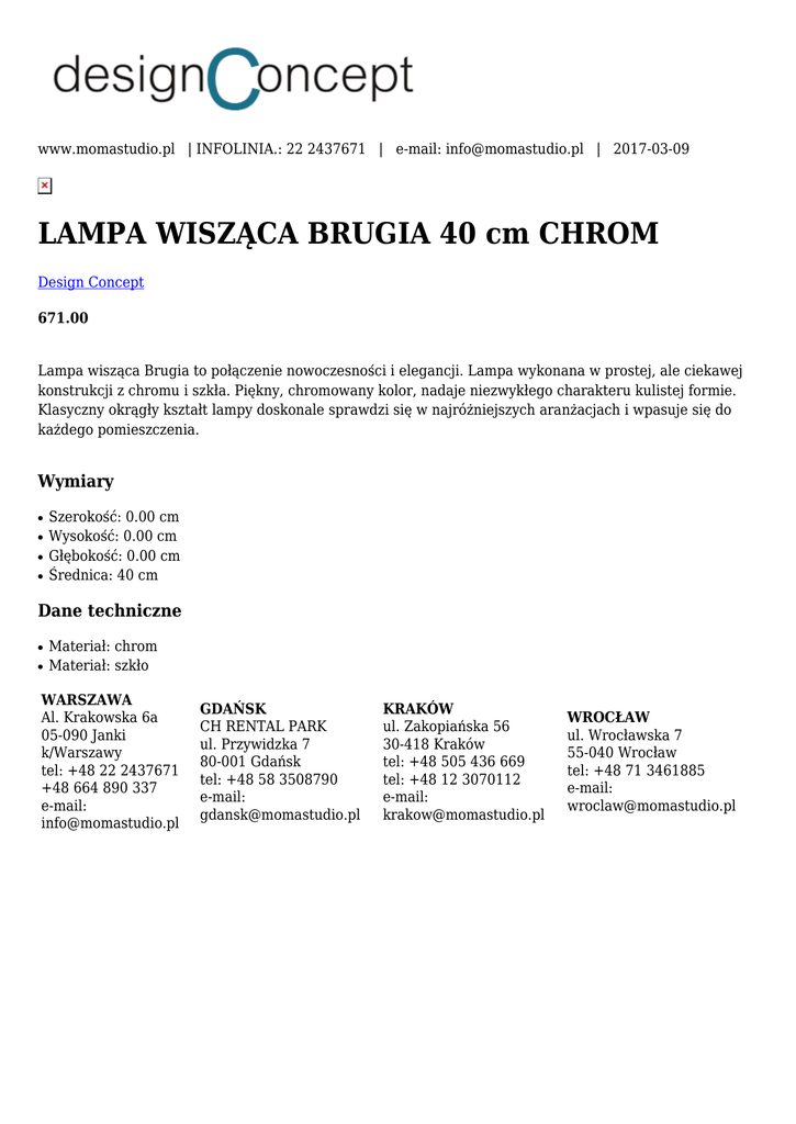 www.momastudio.pl | INFOLINIA.: 22 2437671 | e-mail: [email protected] | 2017-03-09 LAMPA WISZĄCA BRUGIA 40 cm CHROM Design Concept 671.00 Lampa wisząca Brugia to połączenie nowoczesności i elegancji. Lampa wykonana w prostej, ale ciekawej konstrukcji z chromu i szkła. Piękny, chromowany kolor, nadaje niezwykłego charakteru kulistej formie. Klasyczny okrągły kształt lampy doskonale sprawdzi się w najróżniejszych aranżacjach i wpasuje się do każdego pomieszczenia. Wymiary ● ● ● ● Szerokość: 0.00 cm Wysokość: 0.00 cm Głębokość: 0.00 cm Średnica: 40 cm Dane techniczne ● ● Materiał: chrom Materiał: szkło WARSZAWA Al. Krakowska 6a 05-090 Janki k/Warszawy tel: +48 22 2437671 +48 664 890 337 e-mail: [email protected] GDAŃSK CH RENTAL PARK ul. Przywidzka 7 80-001 Gdańsk tel: +48 58 3508790 e-mail: [email protected] KRAKÓW ul. Zakopiańska 56 30-418 Kraków tel: +48 505 436 669 tel: +48 12 3070112 e-mail: [email protected] WROCŁAW ul. Wrocławska 7 55-040 Wrocław tel: +48 71 3461885 e-mail: [email protected]