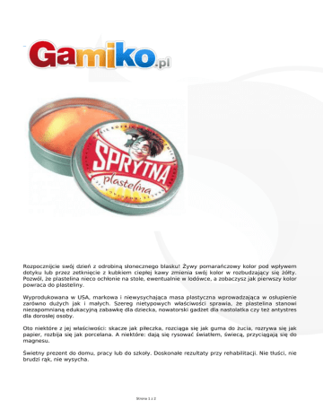 Rozpocznijcie swój dzień z odrobiną słonecznego blasku! Żywy pomarańczowy kolor pod wpływem dotyku lub przez zetknięcie z kubkiem ciepłej kawy zmienia swój kolor w rozbudzający się żółty. Pozwól, że plastelina nieco ochłonie na stole, ewentualnie w lodówce, a zobaczysz jak pierwszy kolor powraca do plasteliny. Wyprodukowana w USA, markowa i niewysychająca masa plastyczna wprowadzająca w osłupienie zarówno dużych jak i małych. Szereg nietypowych właściwości sprawia, że plastelina stanowi niezapomnianą edukacyjną zabawkę dla dziecka, nowatorski gadżet dla nastolatka czy też antystres dla dorosłej osoby. Oto niektóre z jej właściwości: skacze jak piłeczka, rozciąga się jak guma do żucia, rozrywa się jak papier, rozbija się jak porcelana. A niektóre: dają się rysować światłem, świecą, przyciągają się do magnesu. Świetny prezent do domu, pracy lub do szkoły. Doskonałe rezultaty przy rehabilitacji. Nie tłuści, nie brudzi rąk, nie wysycha. Strona 1 z 2 Wiek 8+ Producent Sprytna Plastelina Strona 2 z 2