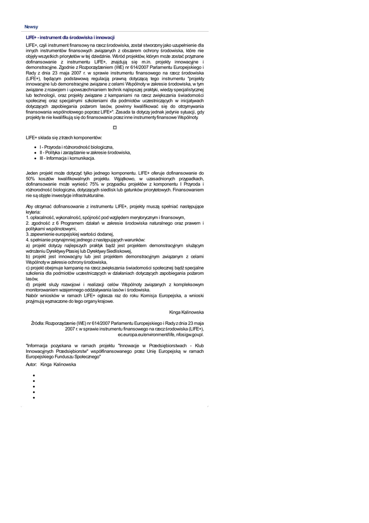 Newsy LIFE+ - instrument dla środowiska i innowacji LIFE+, czyli instrument finansowy na rzecz środowiska, został stworzony jako uzupełnienie dla innych instrumentów finansowych związanych z obszarem ochrony środowiska, które nie objęły wszystkich priorytetów w tej dziedzinie. Wśród projektów, którym może zostać przyznane dofinansowanie z instrumentu LIFE+, znajdują się m.in. projekty innowacyjne i demonstracyjne. Zgodnie z Rozporządzeniem (WE) nr 614/2007 Parlamentu Europejskiego i Rady z dnia 23 maja 2007 r. w sprawie instrumentu finansowego na rzecz środowiska (LIFE+), będącym podstawową regulacją prawną dotyczącą tego instrumentu "projekty innowacyjne lub demonstracyjne związane z celami Wspólnoty w zakresie środowiska, w tym związane z rozwojem i upowszechnianiem technik najlepszej praktyki, wiedzy specjalistycznej lub technologii, oraz projekty związane z kampaniami na rzecz zwiększania świadomości społecznej oraz specjalnymi szkoleniami dla podmiotów uczestniczących w inicjatywach dotyczących zapobiegania pożarom lasów, powinny kwalifikować się do otrzymywania finansowania wspólnotowego poprzez LIFE+". Zasada ta dotyczy jednak jedynie sytuacji, gdy projekty te nie kwalifikują się do finansowania przez inne instrumenty finansowe Wspólnoty. LIFE+ składa się z trzech komponentów: I - Przyroda i różnorodność biologiczna, II - Polityka i zarządzanie w zakresie środowiska, III - Informacja i komunikacja. Jeden projekt może dotyczyć tylko jednego komponentu. LIFE+ oferuje dofinansowanie do 50% kosztów kwalifikowalnych projektu. Wyjątkowo, w uzasadnionych przypadkach, dofinansowanie może wynieść 75% w przypadku projektów z komponentu I Przyroda i różnorodność biologiczna, dotyczących siedlisk lub gatunków priorytetowych. Finansowaniem nie są objęte inwestycje infrastrukturalne. Aby otrzymać dofinansowanie z instrumentu LIFE+, projekty muszą spełniać następujące kryteria: 1. opłacalność, wykonalność, spójność pod względem merytorycznym i finansowym, 2. zgodność z 6 Programem działań w zakresie środowiska naturalnego oraz prawem i politykami wspólnotowymi, 3. zapewnienie europejskiej wartości dodanej, 4. spełnianie przynajmniej jednego z następujących warunków: a) projekt dotyczy najlepszych praktyk bądź jest projektem demonstracyjnym służącym wdrożeniu Dyrektywy Ptasiej lub Dyrektywy Siedliskowej, b) projekt jest innowacyjny lub jest projektem demonstracyjnym związanym z celami Wspólnoty w zakresie ochrony środowiska, c) projekt obejmuje kampanię na rzecz zwiększania świadomości społecznej bądź specjalne szkolenia dla podmiotów uczestniczących w działaniach dotyczących zapobiegania pożarom lasów, d) projekt służy rozwojowi i realizacji celów Wspólnoty związanych z kompleksowym monitorowaniem wzajemnego oddziaływania lasów i środowiska. Nabór wniosków w ramach LIFE+ ogłasza raz do roku Komisja Europejska, a wnioski przyjmują wyznaczone do tego organy krajowe. Kinga Kalinowska Źródła: Rozporządzenie (WE) nr 614/2007 Parlamentu Europejskiego i Rady z dnia 23 maja 2007 r. w sprawie instrumentu finansowego na rzecz środowiska (LIFE+), ec.europa.eu/environment/life, nfosigw.gov.pl. "Informacja pozyskana w ramach projektu "Innowacje w Przedsiębiorstwach - Klub Innowacyjnych Przedsiębiorstw" współfinansowanego przez Unię Europejską w ramach Europejskiego Funduszu Społecznego" Autor: Kinga Kalinowska