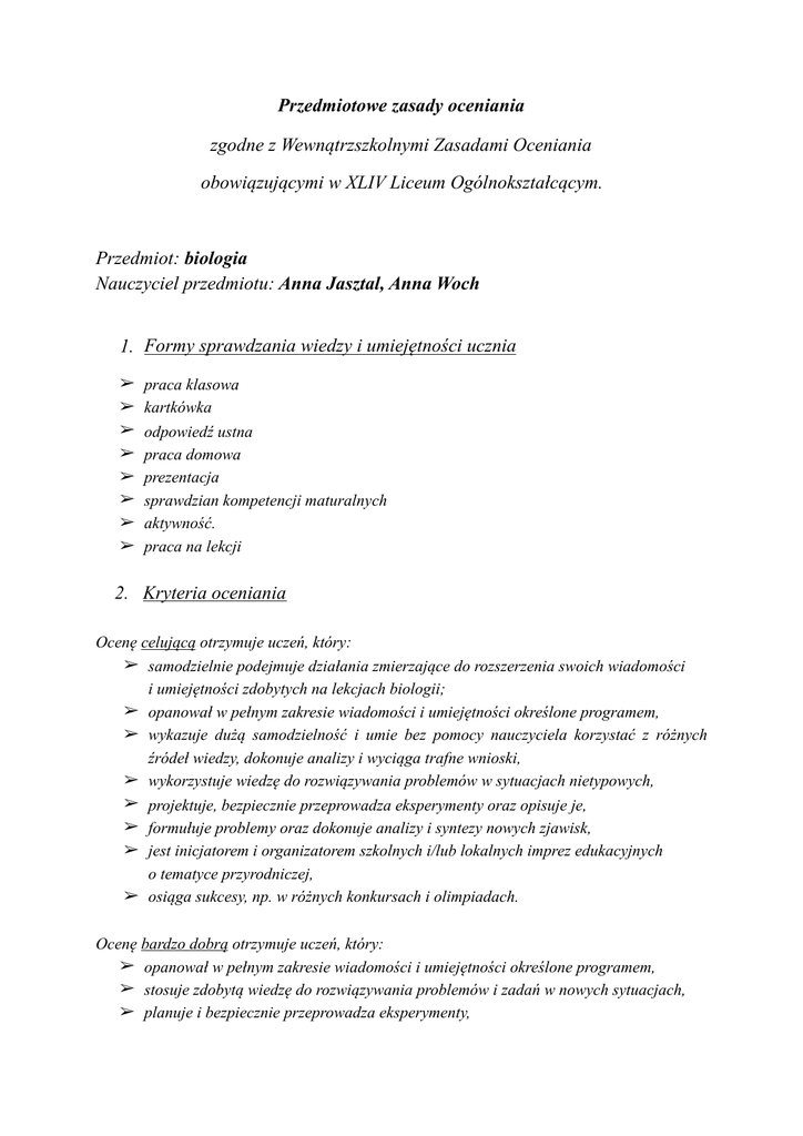 Przedmiotowe zasady oceniania zgodne z Wewnątrzszkolnymi Zasadami Oceniania obowiązującymi w XLIV Liceum Ogólnokształcącym. Przedmiot: biologia Nauczyciel przedmiotu: Anna Jasztal, Anna Woch 1. Formy sprawdzania wiedzy i umiejętności ucznia ➢ ➢ ➢ ➢ ➢ ➢ ➢ ➢ praca klasowa kartkówka odpowiedź ustna praca domowa prezentacja sprawdzian kompetencji maturalnych aktywność. praca na lekcji 2. Kryteria oceniania Ocenę celującą otrzymuje uczeń, który: ➢ samodzielnie podejmuje działania zmierzające do rozszerzenia swoich wiadomości ➢ ➢ ➢ ➢ ➢ ➢ ➢ i umiejętności zdobytych na lekcjach biologii; opanował w pełnym zakresie wiadomości i umiejętności określone programem, wykazuje dużą samodzielność i umie bez pomocy nauczyciela korzystać z różnych źródeł wiedzy, dokonuje analizy i wyciąga trafne wnioski, wykorzystuje wiedzę do rozwiązywania problemów w sytuacjach nietypowych, projektuje, bezpiecznie przeprowadza eksperymenty oraz opisuje je, formułuje problemy oraz dokonuje analizy i syntezy nowych zjawisk, jest inicjatorem i organizatorem szkolnych i/lub lokalnych imprez edukacyjnych o tematyce przyrodniczej, osiąga sukcesy, np. w różnych konkursach i olimpiadach. Ocenę bardzo dobrą otrzymuje uczeń, który: ➢ opanował w pełnym zakresie wiadomości i umiejętności określone programem, ➢ stosuje zdobytą wiedzę do rozwiązywania problemów i zadań w nowych sytuacjach, ➢ planuje i bezpiecznie przeprowadza eksperymenty, ➢ ➢ ➢ ➢ ➢ korzysta z różnych źródeł wiedzy, podczas pracy grupowej często pełni funkcję lidera, analizuje i ocenia informacje pochodzące z różnych źródeł, prawidłowo wyjaśnia zależności przyczynowo-skutkowe pomiędzy faktami, wyraża opinię na temat omawianych zagadnień współczesnej biologii, zagadnień ekologicznych i środowiskowych, ➢ jest aktywny w czasie zajęć, ➢ podejmuje aktywne działania w ramach edukacji rówieśniczej, Ocenę dobrą otrzymuje uczeń, który: ➢ opanował w dużym zakresie wiadomości i umiejętności określone programem, ➢ bezpiecznie wykonuje doświadczenia, ➢ poprawnie stosuje wiadomości i umiejętności do samodzielnego rozwiązywania typowych zadań i problemów, ➢ podczas pracy grupowej podejmuje się pełnienia różnych funkcji, np. lidera, strażnika czasu, prezentera itp., ➢ wykonuje prawidłowo wszystkie zadane przez nauczyciela zadania domowe, ➢ wykonuje samodzielnie i prawidłowo większość zadań poleconych przez nauczyciela w czasie lekcji, ➢ analizuje i interpretuje informacje, ➢ dostrzega zależności przyczynowo-skutkowe pomiędzy faktami, ➢ formułuje prawidłowe wnioski. Ocenę dostateczną uzyskuje uczeń, który: ➢ opanował w podstawowym zakresie wiadomości i umiejętności, ➢ sprawnie wyszukuje informacje według określonego kryterium, ➢ z pomocą nauczyciela bezpiecznie wykonuje doświadczenia, ➢ dobrze współpracuje w grupie, ➢ wykonuje prawidłowo większość zadanych przez nauczyciela zadań domowych, ➢ podejmuje skuteczne próby wykonania różnych zadań w czasie lekcji, ➢ posługuje się podstawowymi pojęciami w zakresie omawianych tematów. Ocenę dopuszczającą uzyskuje uczeń, który: ➢ opanował wiadomości i umiejętności na poziomie koniecznym, ➢ odtwarza podstawowe pojęcia wymagane w podstawie programowej, ➢ korzysta z pomocą nauczyciela z różnych źródeł wiedzy, ➢ z pomocą nauczyciela bezpiecznie wykonuje doświadczenia, ➢ z pomocą nauczyciela rozwiązuje typowe zadania teoretyczne i praktyczne o niewielkim stopniu trudności, ➢ wykonuje, nawet błędnie, zadane przez nauczyciela zadania domowe, ➢ poprawnie współpracuje w grupie. Ocenę niedostateczną otrzymuje uczeń, który: ➢ nie opanował wiadomości i umiejętności określonych programem, które są konieczne do dalszego kształcenia, 3. Ocenianie osiągnięć ucznia Ocenianie prac pisemnych Przy rozwiązywaniu zadań i problemów podczas pracy pisemnej ocenie podlega % poprawność udzielonych odpowiedzi: Na poziomie podstawowym: 0% - 39% niedostateczny 40% - 59% dopuszczający 60% - 74% dostateczny 75% - 89% dobry 90% - 97% bardzo dobry 98% - 100% celujący Na poziomie rozszerzonym: 0% - 44% niedostateczny 45% - 59% dopuszczający 60% - 74% dostateczny 75% - 89% dobry 90% - 97% bardzo dobry 98% - 100% celujący Ocenianie wiadomości i umiejętności podczas odpowiedzi ustnej Ocenie podlega opanowanie terminologii przedmiotu, stopień opanowania omówionego materiału, swoboda w umiejętności formułowania wniosków płynących z doświadczeń, umiejętność rozwiązywania problemów biologicznych, umiejętność syntezy w oparciu o znajomość całego omówionego materiału. Ocenianie prezentacji Ocenie podlegają: zgodność z tematem, poziom merytoryczny, poprawność językowa, posługiwanie się słownictwem właściwym dla tematu i zrozumiałym dla innych, operowanie głosem (poprawna dykcja, odpowiednia intonacja i modulacja głosu), odpowiednie tempo prezentacji, uporządkowany i logiczny układ prezentacji (trójdzielna budowa– wstęp, rozwinięcie, zakończenie), estetyka wykonania pracy, oryginalna i pomysłowa forma prezentacji. Ocenianie sprawdzianu kompetencji maturalnych Sprawdzian kompetencji maturalnych – jest oceniany wg następujących kryteriów: ocena dopuszczająca od 30 % pkt., dostateczna od 50 % pkt., dobra od 70 % pkt., bardzo dobra od 90 % pkt., celująca od 98 % pkt. Ocenianie zadań domowych i pracy na lekcji W zależności od charakteru pracy domowej może być ona sprawdzana w sposób ustny lub jako kontrola pracy pisemnej. Ocenie podlegają: poprawność pracy i jej zgodność z tematem, swoboda w umiejętności formułowania wniosków, wkład pracy, zaangażowanie oraz samodzielność. Ocenianie aktywności oraz konkursy Zaangażowanie ucznia na lekcji, jak też jego aktywność pozalekcyjna podlegają ocenie na bieżąco tzn. pod koniec