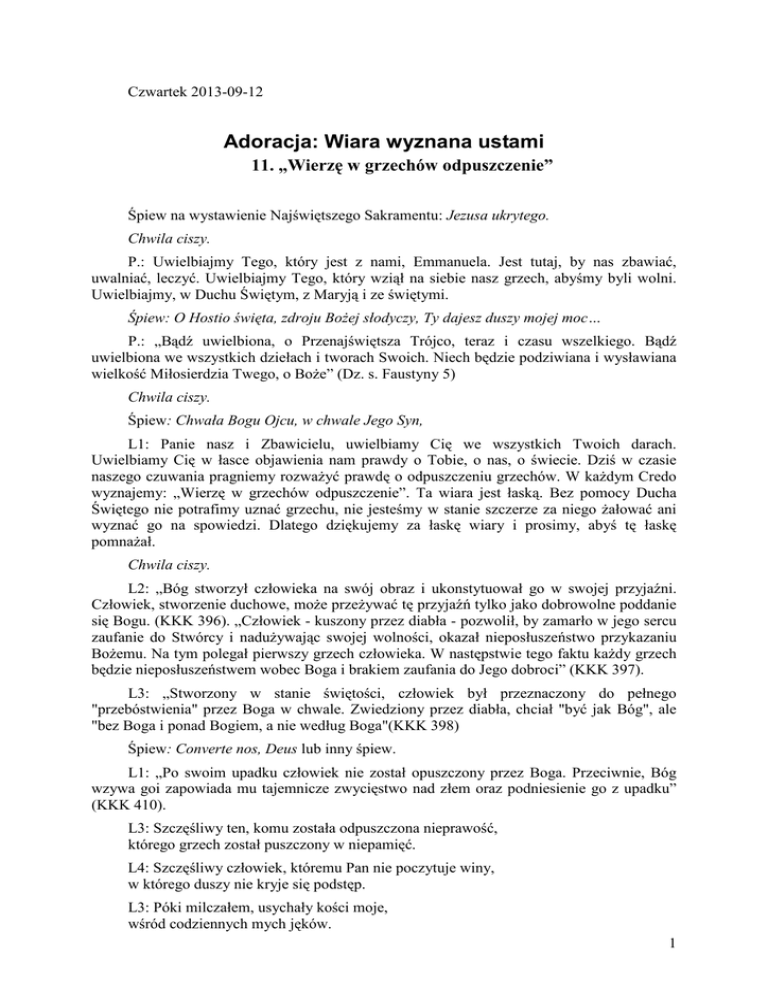 Czwartek 2013-09-12 Adoracja: Wiara wyznana ustami 11. „Wierzę w grzechów odpuszczenie” Śpiew na wystawienie Najświętszego Sakramentu: Jezusa ukrytego. Chwila ciszy. P.: Uwielbiajmy Tego, który jest z nami, Emmanuela. Jest tutaj, by nas zbawiać, uwalniać, leczyć. Uwielbiajmy Tego, który wziął na siebie nasz grzech, abyśmy byli wolni. Uwielbiajmy, w Duchu Świętym, z Maryją i ze świętymi. Śpiew: O Hostio święta, zdroju BoŜej słodyczy, Ty dajesz duszy mojej moc… P.: „Bądź uwielbiona, o Przenajświętsza Trójco, teraz i czasu wszelkiego. Bądź uwielbiona we wszystkich dziełach i tworach Swoich. Niech będzie podziwiana i wysławiana wielkość Miłosierdzia Twego, o BoŜe” (Dz. s. Faustyny 5) Chwila ciszy. Śpiew: Chwała Bogu Ojcu, w chwale Jego Syn, L1: Panie nasz i Zbawicielu, uwielbiamy Cię we wszystkich Twoich darach. Uwielbiamy Cię w łasce objawienia nam prawdy o Tobie, o nas, o świecie. Dziś w czasie naszego czuwania pragniemy rozwaŜyć prawdę o odpuszczeniu grzechów. W kaŜdym Credo wyznajemy: „Wierzę w grzechów odpuszczenie”. Ta wiara jest łaską. Bez pomocy Ducha Świętego nie potrafimy uznać grzechu, nie jesteśmy w stanie szczerze za niego Ŝałować ani wyznać go na spowiedzi. Dlatego dziękujemy za łaskę wiary i prosimy, abyś tę łaskę pomnaŜał. Chwila ciszy. L2: „Bóg stworzył człowieka na swój obraz i ukonstytuował go w swojej przyjaźni. Człowiek, stworzenie duchowe, moŜe przeŜywać tę przyjaźń tylko jako dobrowolne poddanie się Bogu. (KKK 396). „Człowiek - kuszony przez diabła - pozwolił, by zamarło w jego sercu zaufanie do Stwórcy i naduŜywając swojej wolności, okazał nieposłuszeństwo przykazaniu BoŜemu. Na tym polegał pierwszy grzech człowieka. W następstwie tego faktu kaŜdy grzech będzie nieposłuszeństwem wobec Boga i brakiem zaufania do Jego dobroci” (KKK 397). L3: „Stworzony w stanie świętości, człowiek był przeznaczony do pełnego "przebóstwienia" przez Boga w chwale. Zwiedziony przez diabła, chciał "być jak Bóg", ale "bez Boga i ponad Bogiem, a nie według Boga"(KKK 398) Śpiew: Converte nos, Deus lub inny śpiew. L1: „Po swoim upadku człowiek nie został opuszczony przez Boga. Przeciwnie, Bóg wzywa goi zapowiada mu tajemnicze zwycięstwo nad złem oraz podniesienie go z upadku” (KKK 410). L3: Szczęśliwy ten, komu została odpuszczona nieprawość, którego grzech został puszczony w niepamięć. L4: Szczęśliwy człowiek, któremu Pan nie poczytuje winy, w którego duszy nie kryje się podstęp. L3: Póki milczałem, usychały kości moje, wśród codziennych mych jęków. 1 L4: Bo dniem i nocą ciąŜyła nade mną Twa ręka, język mój ustawał jak w letnich upałach. L3: Grzech mój wyznałem Tobie i nie ukryłem mej winy. Rzekłem: "Wyznaję nieprawość moją wobec Pana", a Tyś darował winę mego grzechu. /Ps 32,1-5/ Śpiew: Converte nos, Deus lub inny śpiew. Chwila ciszy. L2: Grzech to jedyna i najpotworniejsza niewola; przeciwieństwo: świętość – jest prawdziwą wolnością dzieci BoŜych (L. Krakowiecka Dialogi 82). L1: Tylko Bóg przebacza grzech. PoniewaŜ Jezus jest Synem BoŜym, mówi o sobie: "Syn Człowieczy ma na ziemi władzę odpuszczania grzechów" (Mk 2, 10), i wykonuje tę Boską władzę: "Odpuszczone są twoje grzechy"- mówi Ewangelia./Mk2,5; Łk 7,48/ (KKK 1441) L3: Z listu św. Pawła Apostoła do Rzymian: Przez jednego człowieka grzech wszedł na świat, a przez grzech śmierć i w ten sposób śmierć przeszła na wszystkich ludzi, poniewaŜ wszyscy zgrzeszyli (Rz 5, 19); Jak przestępstwo jednego sprowadziło na wszystkich ludzi wyrok potępiający, tak czyn sprawiedliwy Jednego (Chrystusa) sprowadza na wszystkich ludzi usprawiedliwienie dające Ŝycie. (Rz 5,18). Chwila ciszy. Śpiew: Misericordias Domini in aeternum cantabo. L1: Odpuszczenie grzechów w Kościele ma miejsce przede wszystkim, gdy po raz pierwszy wyznaje się wiarę. Z wodą chrzcielną zostaje bowiem udzielone pełne przebaczenie i nie pozostaje juŜ Ŝadna wina: ani pierworodna, ani inna popełniona później; nie pozostaje teŜ Ŝadna kara do odpokutowania, by zadośćuczynić za te grzechy.(KKK 978) Chwila ciszy. Śpiew: Miłosierny Pan i łaskawy, nieskory do gniewu i bardzo cierpliwy /zwrotki 2 i 6/ On odpuszcza wszystkie twoje winy i leczy wszystkie choroby. On twoje Ŝycie ratuje od zguby, obdarza cię łaską i zmiłowaniem. Miłosierny Pan i łaskawy… Jak odległy jest wschód od zachodu tak daleko odsuwa od nas nasze winy. Jak ojciec lituje się nad dziećmi, tak Pan się lituje nad tymi, którzy cześć Mu oddają Miłosierny Pan i łaskawy… Chwila ciszy. L3: Z Listu św. Pawła Apostoła do Kolosan (2,12-14): … jako razem z Nim pogrzebani w chrzcie, w którym teŜ razem zostaliście wskrzeszeni przez wiarę w moc Boga, który Go wskrzesił. I was, umarłych na skutek występków i "nieobrzezania" waszego [grzesznego] ciała, razem z Nim przywrócił do Ŝycia. Darował nam wszystkie występki, skreślił zapis dłuŜny obciąŜający nas nakazami. To właśnie, co było naszym przeciwnikiem, usunął z drogi, przygwoździwszy do krzyŜa. Chwila ciszy/ 2 L1: Chrzest jest pierwszym i podstawowym sakramentem przebaczenia grzechów: jednoczy nas z Chrystusem, który umarł i zmartwychwstał, oraz daje nam Ducha Świętego.(KKK 985) Śpiew: Chrystus, Chrystus to nadzieja cała nasza L3: Jezus powiedział: PoŜyteczne jest dla was moje odejście. Bo jeŜeli nie odejdę, Pocieszyciel nie przyjdzie do was. A jeŜeli odejdę, poślę Go do was. On zaś, gdy przyjdzie, przekona świat o grzechu, o sprawiedliwości i o sądzie. O grzechu - bo nie wierzą we Mnie; o sprawiedliwości zaś - bo idę do Ojca i juŜ Mnie nie ujrzycie; wreszcie o sądzie - bo władca tego świata został osądzony./J16, 5- 11/ Chwila ciszy. Śpiew: Duchu Miłości wylewaj się na nas z przebitego Serca Jezusa lub inny śpiew. P.: Prośmy Ducha Świętego, by