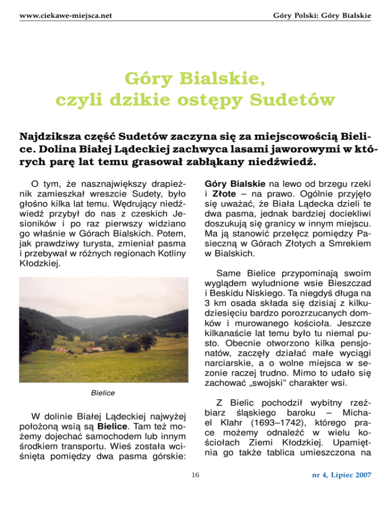 www.ciekawe-miejsca.net Góry Polski: Góry Bialskie Góry Bialskie, czyli dzikie ostępy Sudetów Najdziksza część Sudetów zaczyna się za miejscowością Bielice. Dolina Białej Lądeckiej zachwyca lasami jaworowymi w których parę lat temu grasował zabłąkany niedźwiedź. O tym, że nasznajwiększy drapieżnik zamieszkał wreszcie Sudety, było głośno kilka lat temu. Wędrujący niedźwiedź przybył do nas z czeskich Jesioników i po raz pierwszy widziano go właśnie w Górach Bialskich. Potem, jak prawdziwy turysta, zmieniał pasma i przebywał w różnych regionach Kotliny Kłodzkiej. Góry Bialskie na lewo od brzegu rzeki i Złote – na prawo. Ogólnie przyjęło się uważać, że Biała Lądecka dzieli te dwa pasma, jednak bardziej dociekliwi doszukują się granicy w innym miejscu. Ma ją stanowić przełęcz pomiędzy Pasieczną w Górach Złotych a Smrekiem w Bialskich. Same Bielice przypominają swoim wyglądem wyludnione wsie Bieszczad i Beskidu Niskiego. Ta niegdyś długa na 3 km osada składa się dzisiaj z kilkudziesięciu bardzo porozrzucanych domków i murowanego kościoła. Jeszcze kilkanaście lat temu było tu niemal pusto. Obecnie otworzono kilka pensjonatów, zaczęły działać małe wyciągi narciarskie, a o wolne miejsca w sezonie raczej trudno. Mimo to udało się zachować „swojski” charakter wsi. Bielice Z Bielic pochodził wybitny rzeźbiarz śląskiego baroku – Michael Klahr (1693–1742), którego prace możemy odnaleźć w wielu kościołach Ziemi Kłodzkiej. Upamiętnia go także tablica umieszczona na W dolinie Białej Lądeckiej najwyżej położoną wsią są Bielice. Tam też możemy dojechać samochodem lub innym środkiem transportu. Wieś została wciśnięta pomiędzy dwa pasma górskie: 16 nr 4, Lipiec 2007 www.ciekawe-miejsca.net Góry Polski: Góry Bialskie skromnym barokowo–klasycystycznym kościółku z 1799 roku. Drugą tablicę poświęcono konspiracyjnym spotkaniom działaczy „Solidarności Polsko–Czechosłowackiej” w latach 80. XX wieku. południe od Kowadła przez trawiasty szczyt Pasiecznej (928 m), a potem bardzo długim i łagodnym podejściem na Smrek (1125 m). Jest to najwyższy szczyt czeskich Rychlebskich Hor, które ciągną się od przełęczy Płoszczyna do Jesenika. Na bardzo płaskim wierzchołku znajdują się wiata i krzyżówka czeskich szlaków. Od tego momentu granicą nie prowadzi żaden szlak, ale ścieżka wydeptana jest dosyć mocno. Następne szczyty, w tym najwyższy szczyt Gór Bialskich – Postawna (1125 m) mają niesamowicie płaskie wierzchołki, z których nie ujrzymy za dużo poza grzbietem góry, na której jesteśmy. Po kilku kilometrach dochodzimy do perełki – rezerwatu Puszcza Śnieżnej Białki. Chroni on fragment pierwotnego lasu z wyjątkowo dużą domieszkąjawora – stąd zresztą inna nazwa tego obszaru: Puszcza Jaworowa. Inne ciekawe drzewa to potężne buki i świerki. Wszystko to napotkamy, schodząc zielonym szlakiem, który odchodzi z granicy na Iwince (1076 m). Ścieżka prowadzi przez zarastające dzikie polany, na których obrzeżach rosną jeszcze spróchniałe stare klony jawory. Las w Górach Bialskich Wyruszając ze wsi zielonym szlakiem, w niecałą godzinę możemy zdobyć najwyższy szczyt Gór Złotych. Jego nazwa – Kowadło (lub Kowadlina; 989 m) – prawdopodobnie wywodzi się z faktu, iż teren ten był własnością kowala z Bielic. Na stromym wierzchołku znajdują się małe skałki, z których roztacza się ciekawa panorama Gór Bialskich, charakteryzujących się płaskimi wierzchołkami. To właśnie jest znacząca różnica pomiędzy oboma pasmami. Gdy z Kowadła spojrzymy na ciągnące się wzdłuż granicy Góry Złote, zauważymy, że ich wierzchołki są stromsze i bardziej trójkątne. Z Iwinki szybko i łatwo można wejść na Rudawiec (1106 m), szczyt Gór Bialskich zaliczany do Korony Gór Polski. Zastępuję on Postawną ze względu na to, że tylko na niego prowadzi znakowany szlak turystyczny. Rudawiec jest świetnym miejscem na jagody. Będąc w Bielicach, możemy spróbować „zaatakować” bardzo rzadko odwiedzane pasmo graniczne Gór Bialskich. Poruszanie się po nim jest dozwolone jednak tylko po czeskim żółtym szlaku. Prowadzi on wzdłuż granicy, na Tymczasem, zielony szlak podąża przez jaworowe lasy do doliny Białej Lądeckiej. Przy jej korycie rośnie kilka wysokich i monstrualnie grubych, prawie 17 nr 4, Lipiec 2007 www.ciekawe-miejsca.net Góry Polski: Góry Bialskie 250-letnich świerków. Jeden znajdziemy przy zetknięciu zielonego szlaku z drogą, przy Czarnym Potoku, drugi – w głębi doliny, kilkanaście metrów na wschód od drogi. Dolinę Białej Lądeckiej warto polecić przede wszystkim rowerzystom, a także osobom, które cenią sobie spokojniejsze spacery. Wzdłuż rzeki cały czas prowadzi dobrze utrzymana gruntowa droga, która kończy się dopiero po kilkunastu kilometrach. W tym rejonie nietrudno natknąć się na jelenia czy dzika. Płaskie wierzchołki są charakterystyczne dla tych gór Bielice są także punktem wyjścia na strome pasmo Czernicy (1083 m). W jej kierunku prowadzi żółty szlak z centrum miejscowości. Jeden z wyższych szczytów w okolicy słynie z widoków, które możemy jeszcze z niego podziwiać, a także z tego, że rzadko kto tu przychodzi. Można to stwierdzić zwłaszcza po szerokości ścieżki prowadzącej w stronę Nowego Gierałtowa. Góry Bialskie nie są terenem wycieczek dla każdego. Mogą się wydawać zbyt dzikie, mało zagospodarowane albo też i nudne ze względu na płaskie wierzchołki oraz niemal zupełny brak skał. To, co je wyróżnia, to jednak prawdziwie dzika przyroda i odludność dająca niesamowite wyobcowanie od szybkiego tempa życia. Tekst i zdjęcia: Jakub Jagiełło lala Informacje praktyczne: Góry Bialskie leżą w południowo-wschodnim narożniku Ziemi Kłodzkiej. Dostać się tu można samochodem lub autobusem z Lądka Zdroju. W Bi