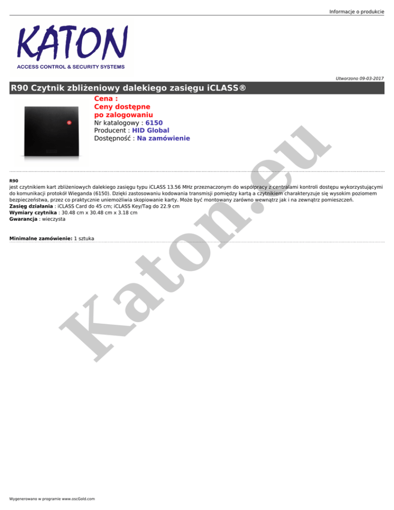 Informacje o produkcie Utworzono 09-03-2017 R90 Czytnik zbliżeniowy dalekiego zasięgu iCLASS® Cena : Ceny dostępne po zalogowaniu eu Nr katalogowy : 6150 Producent : HID Global Dostępność : Na zamówienie R90 at on . jest czytnikiem kart zbliżeniowych dalekiego zasięgu typu iCLASS 13.56 MHz przeznaczonym do współpracy z centralami kontroli dostępu wykorzystującymi do komunikacji protokół Wieganda (6150). Dzięki zastosowaniu kodowania transmisji pomiędzy kartą a czytnikiem charakteryzuje się wysokim poziomem bezpieczeństwa, przez co praktycznie uniemożliwia skopiowanie karty. Może być montowany zarówno wewnątrz jak i na zewnątrz pomieszczeń. Zasięg działania : iCLASS Card do 45 cm; iCLASS Key/Tag do 22.9 cm Wymiary czytnika : 30.48 cm x 30.48 cm x 3.18 cm Gwarancja : wieczysta K Minimalne zamówienie: 1 sztuka Wygenerowano w programie www.oscGold.com