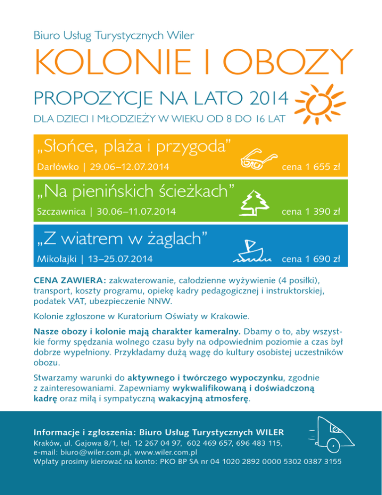 Biuro Usług Turystycznych Wiler KOLONIE I OBOZY PROPOZYCJE NA LATO 2014 DLA DZIECI I MŁODZIEŻY W WIEKU OD 8 DO 16 LAT „Słońce, plaża i przygoda” Darłówko | 29.06–12.07.2014 cena 1 655 zł „Na pienińskich ścieżkach” Szczawnica | 30.06–11.07.2014 cena 1 390 zł „Z wiatrem w żaglach” Mikołajki | 13–25.07.2014 cena 1 690 zł CENA ZAWIERA: zakwaterowanie, całodzienne wyżywienie (4 posiłki), transport, koszty programu, opiekę kadry pedagogicznej i instruktorskiej, podatek VAT, ubezpieczenie NNW. Kolonie zgłoszone w Kuratorium Oświaty w Krakowie. Nasze obozy i kolonie mają charakter kameralny. Dbamy o to, aby wszystkie formy spędzania wolnego czasu były na odpowiednim poziomie a czas był dobrze wypełniony. Przykładamy dużą wagę do kultury osobistej uczestników obozu. Stwarzamy warunki do aktywnego i twórczego wypoczynku, zgodnie z zainteresowaniami. Zapewniamy wykwalifikowaną i doświadczoną kadrę oraz miłą i sympatyczną wakacyjną atmosferę. Informacje i zgłoszenia: Biuro Usług Turystycznych WILER Kraków, ul. Gajowa 8/1, tel. 12 267 04 97, 602 469 657, 696 483 115, e-mail: [email protected], www.wiler.com.pl Wpłaty prosimy kierować na konto: PKO BP SA nr 04 1020 2892 0000 5302 0387 3155 „Słońce, plaża i przygoda” – Darłówko dla młodzieży 1115 lat ZAKWATEROWANIE: Ośrodek Wczasowy Piramida II Położony we wschodniej części Darłówka, 300m od plaży. Posiada duży, ogrodzony teren, z bogatą infrastrukturą – boiska sportowe, korty tenisowe, ścianka wspinaczkowa, kryty basen. Pokoje 3,4–osobowe z łazienkami. PROGRAM: Plażowanie, kąpiele morskie; codzienne zajęcia z instruktorami na korcie tenisowym, na ściance wspinaczkowej, na basenie; wycieczka do Słowińskiego Parku Narodowego na ruchome wydmy, wycieczka do Darłowa (zwiedzanie Zamku Książąt Pomorskich i innych zabytków Darłowa), zwiedzanie Darłówka (port, latarnia morska, most zwodzony na rzece Wieprz); rejs statkiem po morzu, zajęcia sportowe, gry i zabawy integracyjne dostosowane do wieku i zainteresowań młodzieży. „Na pienińskich ścieżkach” Szczawnica dla dzieci 812 lat ZAKWATEROWANIE: Dom Wczasowy Chemik Położony w części uzdrowiskowej Szczawnicy, w cichej, spokojnej i bezpiecznej okolicy, spełnia doskonale warunki do organizacji wypoczynku dla dzieci. Posiada 2,3,4–osobowe pokoje z łazienkami, salę klubową /TV, ping-pong/, boisko do gry w siatkówkę, miejsce na ognisko/ grill. W bezpośrednim sąsiedztwie znajduje się Dolny Park Zdrojowy ze swymi atrakcjami. Program: ABC gór – góry Atrakcyjne, Bezpieczne, Ciekawe – wędrówki po urokliwych zakątkach Pienin /Wąwóz Homole, Durbaszka, Bereśnik…/; elementy terenoznawstwa /czytanie mapy, rodzaje szlaków, itp./; wycieczka wokół J.Czorsztyńskiego /spacer po zaporze czorsztyńskiej, przejazd gondolami do zamku w Czorsztynie, zwiedzanie kościółka w Dębnie – perły architektury drewnianej/; wycieczka rowerowa; plażowanie nad rzeczką Grajcarek; folklor pieniński /spotkanie z gawędziarzem, strój górala pienińskiego/, zwiedzanie Muzeum Regionalnego w Szczawnicy, warsztaty dobrego smaku, ogniska, zabawy integracyjne dostosowane do wieku i zainteresowań dzieci, gry i zajęcia sportowe /m.in. na boisku „Orlik”/; nauka piosenek turystycznych, konkurs na piosenkę wakacyjną, jogging i dużo dobrej zabawy. „Z wiatrem w żaglach” – Mikołajki dla młodzieży 1216 lat ZAKWATEROWANIE: Ośrodek Wypoczynkowy Leśna Polana Położony na brzegu Jeziora Mikołajskiego, pokoje 3–osobowe z umywalkami, każdy z balkonem, duży ogrodzony teren z boiskiem do siatkówki i koszykówki, dwie świetlice, własna przystań sprzętu wodnego – kajaków i żaglówek. PROGRAM: Plażowanie, kąpiele w jeziorze, szkolenie z podstaw żeglarstwa (przepisy i obyczaje żeglarskie, teoria żeglowania, elementy ratownictwa i meteorologii, proste prace bosmańskie); codzienne rejsy żaglówką, codzienne kajakowanie, rowery wodne, spływ kajakowy rzeką Krutynią, wycieczki (autokarowa do Giżycka – zwiedzanie twierdzy Boyen, most zwodzony, spacer po porcie); wycieczka do stacji naukowej – hodowli konika polskiego oraz bobrów (przeprawa promem); rozgrywki sportowe, zabawy integracyjne, festiwal szant w Mikołajkach, nauka szant i wiele innych atrakcji. Wszystkie nasze wyjazdy kończą się starannie przygotowaną grą terenową będącą zarówno świetną zabawą, jak i sprawdzianem zdobytej podczas wyjazdu wiedzy oraz umiejętności. ZAPRASZAMY!