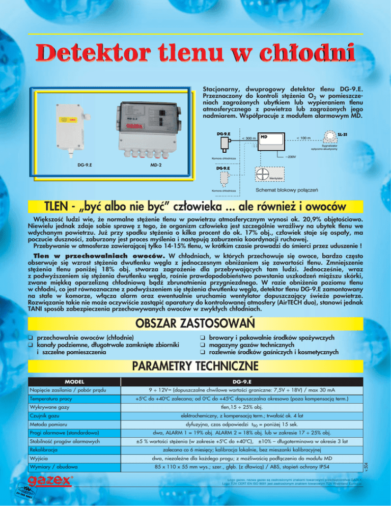 Stacjonarny, dwuprogowy detektor tlenu DG-9.E. Przeznaczony do kontroli st´˚enia O2 w pomieszczeniach zagro˚onych ubytkiem lub wypieraniem tlenu atmosferycznego z powietrza lub zagro˚onych jego nadmiarem. Wspó∏pracuje z modu∏em alarmowym MD. DG-9.E < 300 m MD SL-31 < 100 m Sygnalizator optyczno-akustyczny ~230V Komora ch∏odnicza DG-9.E MD-2 DG-9.E Wentylator Komora ch∏odnicza Schemat blokowy po∏àczeƒ TLEN - „byç albo nie byç” cz∏owieka ... ale równie˚ i owoców Wi´kszoÊç ludzi wie, ˚e normalne st´˚enie tlenu w powietrzu atmosferycznym wynosi ok. 20,9% obj´toÊciowo. Niewielu jednak zdaje sobie spraw´ z tego, ˚e organizm cz∏owieka jest szczególnie wra˚liwy na ubytek tlenu we wdychanym powietrzu. Ju˚ przy spadku st´˚enia o kilka procent do ok. 17% obj., cz∏owiek staje si´ ospa∏y, ma poczucie dusznoÊci, zaburzony jest proces myÊlenia i nast´pujà zaburzenia koordynacji ruchowej. Przebywanie w atmosferze zawierajàcej tylko 14-15% tlenu, w krótkim czasie prowadzi do Êmierci przez uduszenie ! Tlen w przechowalniach owoców. W ch∏odniach, w których przechowuje si´ owoce, bardzo cz´sto obserwuje si´ wzrost st´˚enia dwutlenku w´gla z jednoczesnym obni˚aniem si´ zawartoÊci tlenu. Zmniejszenie st´˚enia tlenu poni˚ej 18% obj. stwarza zagro˚enie dla przebywajàcych tam ludzi. JednoczeÊnie, wraz z podwy˚szeniem si´ st´˚enia dwutlenku w´gla, roÊnie prawdopodobieƒstwo powstania uszkodzeƒ mià˚szu skórki, zwane mi´kkà oparzeliznà ch∏odniowà bàd˝ zbrunatnienia przygniezdnego. W razie obni˚enia poziomu tlenu w ch∏odni, co jest równoznaczne z podwy˚szeniem si´ st´˚enia dwutlenku w´gla, detektor tlenu DG-9.E zamontowany na sta∏e w komorze, w∏àcza alarm oraz ewentualnie uruchamia wentylator dopuszczajàcy Êwie˚e powietrze. Rozwiàzanie takie nie mo˚e oczywiÊcie zastàpiç aparatury do kontrolowanej atmosfery (AirTECH duo), stanowi jednak TANI sposób zabezpieczenia przechowywanych owoców w zwyk∏ych ch∏odniach. OBSZAR ZASTOSOWA¡ q przechowalnie owoców (ch∏odnie) q kana∏y podziemne, d∏ugotrwale zamkni´te zbiorniki i szczelne pomieszczenia q browary i pakowalnie Êrodków spo˚ywczych q magazyny gazów technicznych q rozlewnie Êrodków gaÊniczych i kosmetycznych PARAMETRY TECHNICZNE Temperatura pracy Wykrywane gazy Czujnik gazu Metoda pomiaru DG-9.E 9 ÷ 12V -–- (dopuszczalne chwilowe wartoÊci graniczne: 7,5V ÷ 18V) / max 30 mA +50C do +400C zalecana; od 00C do +450C dopuszczalna okresowo (poza kompensacjà term.) tlen,15 ÷ 25% obj. elektrochemiczny, z kompensacjà term.; trwa∏oÊç ok. 4 lat dyfuzyjna, czas odpowiedzi t90 = poni˚ej 15 sek. Progi alarmowe (standardowo) dwa, ALARM 1 = 19% obj. ALARM 2 = 18% obj. lub w zakresie 17 ÷ 25% obj. StabilnoÊç progów alarmowych ±5 % wartoÊci st´˚enia (w zakresie +50C do +400C), ±10% – d∏ugoterminowa w okresie 3 lat Rekalibracja WyjÊcia Wymiary / obudowa zalecana co 6 miesi´cy; kalibracja lokalnie, bez mieszanki kalibracyjnej dwa, niezale˚ne dla ka˚dego progu; z mo˚liwoÊcià pod∏àczenia do modu∏u MD 85 x 110 x 55 mm wys.; szer., g∏´b. (z d∏awicà) / ABS, stopieƒ ochrony IP54 Logo gazex, nazwa gazex sà zastrze˝onymi znakami towarowymi przedsi´biorstwa GAZEX. Logo TÜV CERT EN ISO 9001 jest zastrze˝onym znakiem towarowym TÜV Rheinland Euroque. v.504 MODEL Napi´cie zasilania / pobór pràdu