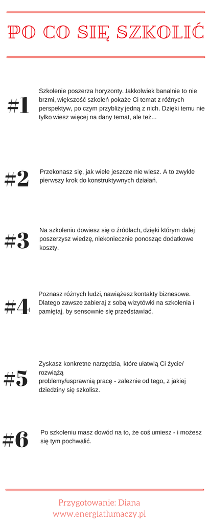 Ę SZKOLIĆ PO CO SI #1 Szkolenie poszerza horyzonty. Jakkolwiek banalnie to nie brzmi, większość szkoleń pokaże Ci temat z różnych perspektyw, po czym przybliży jedną z nich. Dzięki temu nie tylko wiesz więcej na dany temat, ale też... #2 Przekonasz się, jak wiele jeszcze nie wiesz. A to zwykle pierwszy krok do konstruktywnych działań. #3 Na szkoleniu dowiesz się o źródłach, dzięki którym dalej poszerzysz wiedzę, niekoniecznie ponosząc dodatkowe koszty. #4 Poznasz różnych ludzi, nawiążesz kontakty biznesowe. Dlatego zawsze zabieraj z sobą wizytówki na szkolenia i pamiętaj, by sensownie się przedstawiać. #5 Zyskasz konkretne narzędzia, które ułatwią Ci życie/ rozwiążą problemy/usprawnią pracę - zaleznie od tego, z jakiej dziedziny się szkolisz. #6 Po szkoleniu masz dowód na to, że coś umiesz - i możesz się tym pochwalić. Przygotowanie: Diana www.energiatlumaczy.pl Ę SZKOLIĆ PO CO SI #7 Pokażesz swoim klientom czy szefowi, że ciągle się rozwijasz - tym samym zwiększasz własną wartość w ich oczach i masz jeden z argumentów do podniesienia stawek czy wniosku o podwyżkę. #8 Poddasz w wątpliwość status quo - a tego nigdy za mało. Tkwienie w stałej, sielankowej rzeczywistości (bo stabilizacja jest przyjemna), to pułapka, przez którą nigdy nie zamienisz się z pracownika czy usługodawcy w przedsiębiorcę trzymającego los we własnych rękach. #9 W praktyce sprawdzisz swoje umiejętności. Najlepsze szkolenia składają się w dużej mierze z praktyki, dyskusji, wymiany doświadczeń i szukania rozwiązań dla Twoich problemów. Wybieraj takie, a będziesz zadowolona. #10 Przekonasz się, że ten wybrany temat w ogóle nie jest dla Ciebie - a to też ma sporą wartość. Lepiej wydać 200 zł na szkolenie i poczuć, że nie, co jak co, ale w ten temat brnąć nie będziesz, niż zacząć przyjmować zlecenia czy zmienić pracę, a potem męczyć się tygodniami. Przygotowanie: Diana www.energiatlumaczy.pl