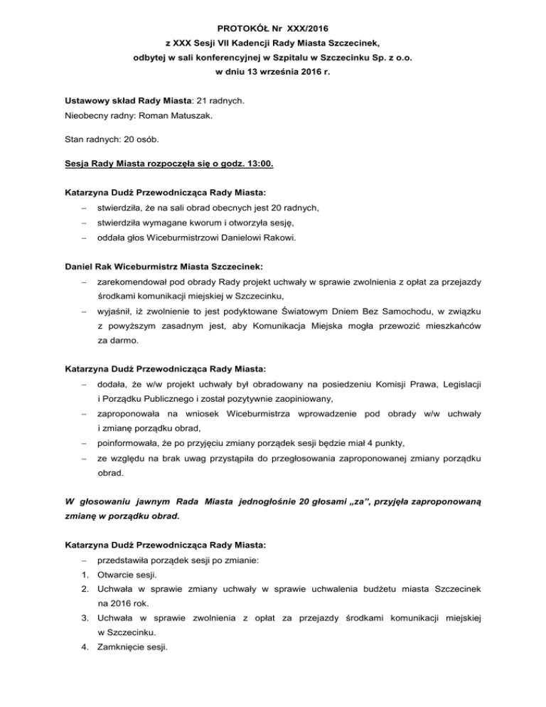 PROTOKÓŁ Nr XXX/2016 z XXX Sesji VII Kadencji Rady Miasta Szczecinek, odbytej w sali konferencyjnej w Szpitalu w Szczecinku Sp. z o.o. w dniu 13 września 2016 r. Ustawowy skład Rady Miasta: 21 radnych. Nieobecny radny: Roman Matuszak. Stan radnych: 20 osób. Sesja Rady Miasta rozpoczęła się o godz. 13:00. Katarzyna Dudź Przewodnicząca Rady Miasta: − stwierdziła, że na sali obrad obecnych jest 20 radnych, − stwierdziła wymagane kworum i otworzyła sesję, − oddała głos Wiceburmistrzowi Danielowi Rakowi. Daniel Rak Wiceburmistrz Miasta Szczecinek: − zarekomendował pod obrady Rady projekt uchwały w sprawie zwolnienia z opłat za przejazdy środkami komunikacji miejskiej w Szczecinku, − wyjaśnił, iż zwolnienie to jest podyktowane Światowym Dniem Bez Samochodu, w związku z powyższym zasadnym jest, aby Komunikacja Miejska mogła przewozić mieszkańców za darmo. Katarzyna Dudź Przewodnicząca Rady Miasta: − dodała, że w/w projekt uchwały był obradowany na posiedzeniu Komisji Prawa, Legislacji i Porządku Publicznego i został pozytywnie zaopiniowany, − zaproponowała na wniosek Wiceburmistrza wprowadzenie pod obrady w/w uchwały i zmianę porządku obrad, − poinformowała, że po przyjęciu zmiany porządek sesji będzie miał 4 punkty, − ze względu na brak uwag przystąpiła do przegłosowania zaproponowanej zmiany porządku obrad. W głosowaniu jawnym Rada Miasta jednogłośnie 20 głosami „za”, przyjęła zaproponowaną zmianę w porządku obrad. Katarzyna Dudź Przewodnicząca Rady Miasta: − przedstawiła porządek sesji po zmianie: 1. Otwarcie sesji. 2. Uchwała w sprawie zmiany uchwały w sprawie uchwalenia budżetu miasta Szczecinek na 2016 rok. 3. Uchwała w sprawie zwolnienia z opłat za przejazdy środkami komunikacji miejskiej w Szczecinku. 4. Zamknięcie sesji. Ad.2. Katarzyna Dudź Przewodnicząca Rady Miasta: − otworzyła dyskusję. Jerzy Kania Przewodniczący Komisji Budżetowo-Ekonomicznej: − przedstawił projekt uchwały wraz z uzasadnieniem, − poinformował, że Komisja obradowała na posiedzeniu w dniu 12 września 2016r.; zaopiniowała projekt uchwały pozytywnie, rekomendując go pod obrady na Sesji RM. Katarzyna Dudź Przewodnicząca Rady Miasta: − otworzyła dyskusję. Krzysztof Zawada Przewodniczący Komisji Edukacji, Kultury, Sportu i Turystyki: − przedstawił wniosek formalny o zamknięcie dyskusji na temat w/w projektu uchwały, − wniosek uzasadnił faktem, iż radni dokładnie omówili temat uchwały na poprzedniej sesji Rady Miasta. Katarzyna Dudź Przewodnicząca Rady Miasta: − w związku ze zgłoszonym wnioskiem formalnym dopuściła dwa głosy za tym wnioskiem oraz dwa głosy przeciwne. Jacek Pawłowicz radny: − stwierdził, iż jest przeciwko wnioskowi, − uważa, że są to ważne sprawy dla budżetu i nie tylko. Katarzyna Dudź Przewodnicząca Rady Miasta: − nie zgadza się ze stanowiskiem radnego Jacka Pawłowicza, − przypomniała, że na poprzedniej sesji Rady Miasta odbyła się obszerna dyskusja na temat uchwały. Katarzyna Dudź Przewodnicząca Rady Miasta: − ze względu na brak dalszych uwag dotyczących wniosku formalnego przystąpiła do głosowania nad nim. W głosowaniu jawnym Rada Miasta 15 głosami „za”, 4 głosami „przeciw”, przy 1 głosie „wstrzymał się” zdecydowała o zakończeniu dyskusji nad projektem uchwały. Katarzyna Dudź Przewodnicząca Rady Miasta: − przystąpiła do głosowania nad projektem uchwały. W głosowaniu jawnym Rada Miasta 16 głosami „za” , przy 4 głosach „wstrzymał się” podjęła uchwałę: Nr XXX/263/2016 w sprawie zmiany uchwały w sprawie uchwalenia budżetu miasta Szczecinek na 2016 rok Ad.3. Katarzyna Dudź Przewodnicząca Rady Miasta: − otworzyła dyskusję. Jacek Brynkiewicz Przewodniczący Komisji Budżetowo-Ekonomicznej: − przedstawił projekt uchwały wraz z uzasadnieniem, − poinformował, że Komisja opiniowała projekt uchwały pozytywnie i rekomenduje go pod obrady Rady Miasta. Katarzyna Dudź Przewodnicząca Rady Miasta: − w związku z brakiem uwag, przystąpiła do głosowania nad projektem uchwały. W głosowaniu jawnym Rada Miasta jednogłośnie 20 głosami „za” podjęła uchwałę: Nr XXX/264/2016 w sprawie zwolnienia z opłat za przejazdy środkami komunikacji miejskiej w Szczecinku Ad.4. Katarzyna Dudź Przewodnicząca Rady Miasta: − stwierdziła wyczerpanie porządku obrad. − zamknęła Sesję Rady Miasta Szczecinek. Obrady Sesji Rady Miasta zakończono o godz. 13:07. Na tym protokół zakończono. Protokołowała: Przewodnicząca Rady Miasta: Katarzyna Mołczun Katarzyna Dudź