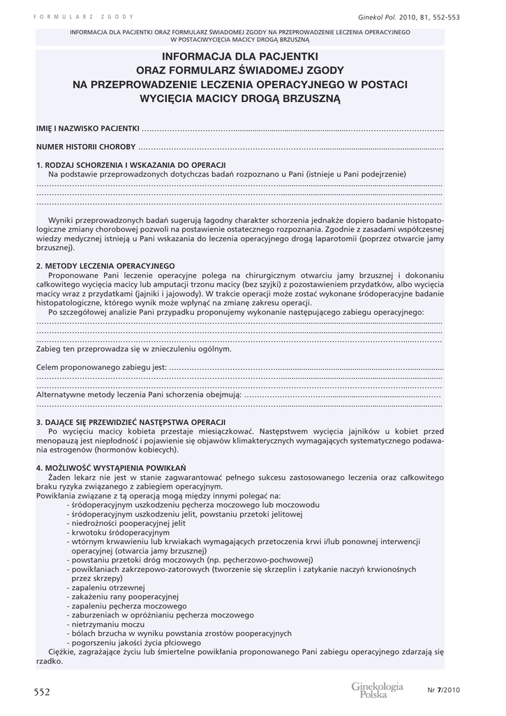 F O R M U L A R Z Z G O D Y Ginekol Pol. 2010, 81, 552-553 INFORMACJA DLA PACJENTKI ORAZ FORMULARZ ÂWIADOMEJ ZGODY NA PRZEPROWADZENIE LECZENIA OPERACYJNEGO W POSTACIWYCI¢CIA MACICY DROGÑ BRZUSZNÑ INFORMACJA DLA PACJENTKI ORAZ FORMULARZ ŚWIADOMEJ ZGODY NA PRZEPROWADZENIE LECZENIA OPERACYJNEGO W POSTACI WYCIĘCIA MACICY DROGĄ BRZUSZNĄ IMI¢ I NAZWISKO PACJENTKI ………………………………......................................................……………………………….. NUMER HISTORII CHOROBY ………………………………………………………………......................................................… 1. RODZAJ SCHORZENIA I WSKAZANIA DO OPERACJI Na podstawie przeprowadzonych dotychczas badaƒ rozpoznano u Pani (istnieje u Pani podejrzenie) ……………………………………………………………………………………............................................................................ ……………………………………………………………………………………............................................................................ ………………………………………………………………………………………………………………………………....………… Wyniki przeprowadzonych badaƒ sugerujà ∏agodny charakter schorzenia jednak˝e dopiero badanie histopatologiczne zmiany chorobowej pozwoli na postawienie ostatecznego rozpoznania. Zgodnie z zasadami wspó∏czesnej wiedzy medycznej istniejà u Pani wskazania do leczenia operacyjnego drogà laparotomii (poprzez otwarcie jamy brzusznej). 2. METODY LECZENIA OPERACYJNEGO Proponowane Pani leczenie operacyjne polega na chirurgicznym otwarciu jamy brzusznej i dokonaniu ca∏kowitego wyci´cia macicy lub amputacji trzonu macicy (bez szyjki) z pozostawieniem przydatków, albo wyci´cia macicy wraz z przydatkami (jajniki i jajowody). W trakcie operacji mo˝e zostaç wykonane Êródoperacyjne badanie histopatologiczne, którego wynik mo˝e wp∏ynàç na zmian´ zakresu operacji. Po szczegó∏owej analizie Pani przypadku proponujemy wykonanie nast´pujàcego zabiegu operacyjnego: ……………………………………………………………………………………............................................................................ ……………………………………………………………………………………............................................................................ ………………………………………………………………………………………………………………………………....………… Zabieg ten przeprowadza si´ w znieczuleniu ogólnym. Celem proponowanego zabiegu jest: …………………………………….......................................................……................. ……………………………………………………………………………………............................................................................ ………………………………………………………………………………………………………………………………....………… Alternatywne metody leczenia Pani schorzenia obejmujà: ……………………………..............................................…… ……………………………………………………………………………………............................................................................ 3. DAJÑCE SI¢ PRZEWIDZIEå NAST¢PSTWA OPERACJI Po wyci´ciu macicy kobieta przestaje miesiàczkowaç. Nast´pstwem wyci´cia jajników u kobiet przed menopauzà jest niep∏odnoÊç i pojawienie si´ objawów klimakterycznych wymagajàcych systematycznego podawania estrogenów (hormonów kobiecych). 4. MO˚LIWOÂå WYSTÑPIENIA POWIK¸A¡ ˚aden lekarz nie jest w stanie zagwarantowaç pe∏nego sukcesu zastosowanego leczenia oraz ca∏kowitego braku ryzyka zwiàzanego z zabiegiem operacyjnym. Powik∏ania zwiàzane z tà operacjà mogà mi´dzy innymi polegaç na: - Êródoperacyjnym uszkodzeniu p´cherza moczowego lub moczowodu - Êródoperacyjnym uszkodzeniu jelit, powstaniu przetoki jelitowej - niedro˝noÊci pooperacyjnej jelit - krwotoku Êródoperacyjnym - wtórnym krwawieniu lub krwiakach wymagajàcych przetoczenia krwi i/lub ponownej interwencji operacyjnej (otwarcia jamy brzusznej) - powstaniu przetoki dróg moczowych (np. p´cherzowo-pochwowej) - powik∏aniach zakrzepowo-zatorowych (tworzenie si´ skrzeplin i zatykanie naczyƒ krwionoÊnych przez skrzepy) - zapaleniu otrzewnej - zaka˝eniu rany pooperacyjnej - zapaleniu p´cherza moczowego - zaburzeniach w opró˝nianiu p´cherza moczowego - nietrzymaniu moczu - bólach brzucha w wyniku powstania zrostów pooperacyjnych - pogorszeniu jakoÊci ˝ycia p∏ciowego Ci´˝kie, zagra˝ajàce ˝yciu lub Êmiertelne powik∏ania proponowanego Pani zabiegu operacyjnego zdarzajà si´ rzadko. 552 Nr 7/2010 Ginekol Pol. 2010, 81, 552-553 F O R M U L A R Z Z G O D Y INFORMACJA DLA PACJENTKI ORAZ FORMULARZ ÂWIADOMEJ ZGODY NA PRZEPROWADZENIE LECZENIA OPERACYJNEGO W POSTACIWYCI¢CIA MACICY DROGÑ BRZUSZNÑ 5. ROKOWANIE Prawdopodobieƒstwo powodzenia proponowanej operacji jest w Pani przypadku: [ ] du˝e [ ] Êrednie [ ] ograniczone Je˝eli nie wyrazi Pani zgody na proponowany zabieg rokowanie co do Pani stanu zdrowia w przysz∏oÊci jest nast´pujàce: ………………………………………….......................................................................................................…….. ……………………………………………………………………………………............................................................................ 6. ROZMOWA Z LEKARZEM Prosimy, aby Pani zapyta∏a nas o wszystko co chcia∏aby Pani wiedzieç w zwiàzku z planowanym leczeniem. Wszelkie informacje dodatkowe dotyczàce planowan