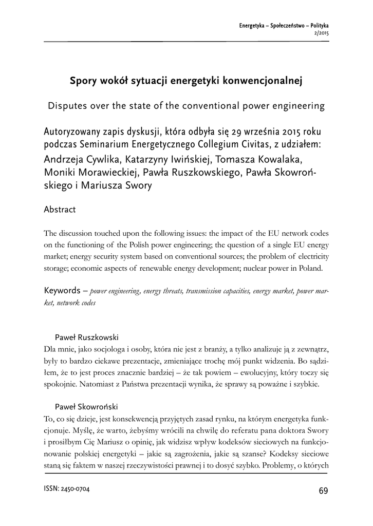 Energetyka – Społeczeństwo – Polityka 2/2015 Spory wokół sytuacji energetyki konwencjonalnej Disputes over the state of the conventional power engineering Autoryzowany zapis dyskusji, która odbyła się 29 września 2015 roku podczas Seminarium Energetycznego Collegium Civitas, z udziałem: Andrzeja Cywlika, Katarzyny Iwińskiej, Tomasza Kowalaka, Moniki Morawieckiej, Pawła Ruszkowskiego, Pawła Skowrońskiego i Mariusza Swory Abstract The discussion touched upon the following issues: the impact of the EU network codes on the functioning of the Polish power engineering; the question of a single EU energy market; energy security system based on conventional sources; the problem of electricity storage; economic aspects of renewable energy development; nuclear power in Poland. Keywords – power engineering, energy threats, transmission capacities, energy market, power market, network codes Paweł Ruszkowski Dla mnie, jako socjologa i osoby, która nie jest z branży, a tylko analizuje ją z zewnątrz, były to bardzo ciekawe prezentacje, zmieniające trochę mój punkt widzenia. Bo sądziłem, że to jest proces znacznie bardziej – że tak powiem – ewolucyjny, który toczy się spokojnie. Natomiast z Państwa prezentacji wynika, że sprawy są poważne i szybkie. Paweł Skowroński To, co się dzieje, jest konsekwencją przyjętych zasad rynku, na którym energetyka funkcjonuje. Myślę, że warto, żebyśmy wrócili na chwilę do referatu pana doktora Swory i prosiłbym Cię Mariusz o opinię, jak widzisz wpływ kodeksów sieciowych na funkcjonowanie polskiej energetyki – jakie są zagrożenia, jakie są szanse? Kodeksy sieciowe staną się faktem w naszej rzeczywistości prawnej i to dosyć szybko. Problemy, o których ISSN: 2450-0704 69 Dyskusja podczas Seminarium Energetycznego Collegium Civitas – 29 września 2015 roku dzisiaj mówiliśmy, to sprawy generalnie znane w branży. Jednak wielu ludzi, również ze środowiska tak zwanych „decydentów”, po prostu nie zdaje sobie sprawy z tego, jakie procesy ekonomiczne zachodzą dzisiaj w polskiej energetyce. Mariusz Swora Tak, myślę, że rzeczywiście czegoś nie dopowiedziałem w trakcie tego swojego krótkiego wystąpienia. Przede wszystkim taka ogólna refleksja – patrząc na tą naszą rzeczywistość od strony politycznej, ona się zasadniczo rozmija z tym, co się dzieje, jeżeli chodzi o ekonomikę wytwarzania rynku, o której wspominała pani dyrektor Morawiecka, z tymi procesami, które wpływają w pośredni bądź bezpośredni sposób na to, co dzieje i będzie dziać w polskiej energetyce. One będą wpływały nie tylko na to, co się dzieje w zakresie obrotu transgranicznego, ale również w zakresie krajowym. Zobaczmy chociażby na przyjęte rozporządzenie komisji dotyczące wytycznych w zakresie alokacji zdolności przesyłowych i zarządzania ograniczeniami przesyłowymi. Ma obejmować następujący zakres przedmiotowy: po pierwsze będą to szczegółowe wytyczne dotyczące alokacji transgranicznych zdolności przesyłowych i zarządzania ograniczeniami przesyłowymi na rynkach, dnia następnego i dnia bieżącego, w tym wymogi ustanowienia wspólnych metod wyznaczenia wolumenu zdolności przesyłowych dostępnych równolegle między obszarami rynkowymi, kryteria umożliwiające ocenę efektywności, a także proces przeglądu dla celów definiowania obszarów rynkowych. Myślę, że wpływ przyjęcia chociażby tego kodeksu, będzie taki, że prędzej czy później w wymiarze regionalnym będą likwidowane bariery w zakresie wymiany transgranicznej, takie, jakie funkcjonują nadal na granicy austriacko-niemieckiej. Ich istnienie generuje koszty, które idą w dziesiątki milionów euro. Będzie to miało bezpośredni wpływ na proces w łączeniu się rynków, na wdrażanie systemów łączenia się rynków, na „flow base market coupling”, które może stać się powszechne w takiej perspektywie kilku lat w zakresie łączenia tych rynków, gdzie jeszcze ten mechanizm nie funkcjonuje. No i to w jasny sposób będzie też odbijało się na ekonomice krajowego sektora. Tutaj wróciłbym do tego bardzo obrazowego slajdu pani dyrektor Morawieckiej, który pokazywał, jak struktura kosztowa tego, co się dzieje w Niemczech, wpływa na opłacalność inwestycji w polskim sektorze elektro-energetycznym i na bezpieczeństwo. Ponownie trzeba będzie przemyśleć definicję bezpieczeństwa, tj. tego, w jakim stopniu mamy się opierać na źródłach krajowych, jakie to mają być źródła, tak, żeby sprostać tej strukturze kosztów za naszą zachodnią granicą. Póki co, ten poziom wymiany trans granicznej jest w sumie jeszcze, przynajmniej zdaniem Komisji Europejskiej, w przypadku 70 Spory wokół sytuacji energetyki konwencjonalnej Polski, niewielki. Ale co się stanie na przestrzeni następnych miesięcy, to uruchomienie połączenia Polska-Litwa, no i plany operatora dotyczące zachodniej granicy. Nierozwiązaną kwestią jest natomiast sprawa przepływów kołowych i relacji z systemem niemieckim. Także to są istotne znaki zapytania i te kodeksy sieciowe stanowią podbudowę regulacyjną tych procesów rynkowych, które mają w efekcie doprowadzić do zwiększenia wymiany transgranicznej. Tutaj „Pakiet Letni” Komisji Europejskiej, a co za tym idzie, również rozwiązania regulacyjne, które Komisja zapowiada, mogą iść nawet tak daleko, że, w sytuacjach zagrożenia będą definiowały podmioty, które mają być w pierwszej kolejności odłączone w przypadku awarii systemu, więc to sięga bardzo daleko, jeżeli chodzi o strukturę, jeżeli chodzi nie tylko o funkcjonowanie naszego systemu, w wymiarze transgranicznym, ale również na poziomie krajowym. Krótko mówiąc, przyjęcie tych kodeksów sieciowych doprowadzi do pogłębienia procesu regionalizacji rynku energii. Na nowo zostaną zdefiniowane, zdefiniowane pewne role rynkowe w tym kodeksie, który już został przyjęty 