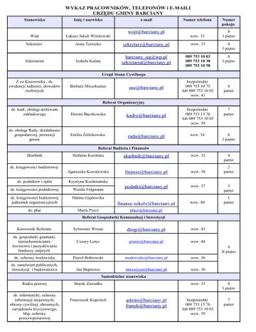 WYKAZ PRACOWNIKÓW, TELEFONÓW i E-MAILI URZĘDU GMINY BARCIANY Stanowisko Imię i nazwisko e-mail Wójt Łukasz Jakub Wiśniewski Sekretarz Anna Tereszko [email protected] wew. 33 8 I piętro Sekretariat Izabela Kalata [email protected] [email protected] 089 753 10 03 089 753 10 38 089 753 10 58 8 I piętro [email protected] Numer telefonu wew. 35 Numer pokoju 8 I piętro Urząd Stanu Cywilnego Z-ca Kierownika , ds. ewidencji ludności, dowodów osobistych Barbara Mieszkuniec [email protected] bezpośredni 089 753 10 75 lub 089 753 10 03 wew. 41 6 parter Referat Organizacyjny ds. kadr, obsługi archiwum zakładowego ds. obsługi Rady, działalności gospodarczej, promocji gminy Dorota Bączkowska Emilia Żelichowska [email protected] bezpośredni 089 753 15 76 lub 089 753 10 03 wew. 39 7 parter [email protected] wew. 34 8 I piętro [email protected] wew. 32 4 parter [email protected] wew. 38 [email protected] wew. 37 [email protected] wew. 40 Referat Budżetu i Finansów Skarbnik Stefania Kosińska ds. księgowości budżetowej Agnieszka Kowalewska ds. podatków i opłat Krystyna Kochmańska ds. księgowości podatkowej Wanda Folgmann ds. księgowości budżetowej jednostek organizacyjnych Halina Gajdowska ds. płac Maria Pyrcz 2 parter 3 parter 1 parter [email protected] Referat Gospodarki Komunalnej i Inwestycji Kierownik Referatu ds. gospodarki gruntami, nieruchomościami, łowiectwa i pozyskiwania funduszy unijnych Sylwester Wrona [email protected] wew. 42 Cezary Łotys [email protected] wew. 44 9 II piętro ds. ochrony środowiska Paweł Bobrowski [email protected] wew. 36 ds. zamówień publicznych, inwestycji i budownictwa Jan Bepirszcz [email protected] wew. 36 Samodzielne stanowiska Radca prawny ds. informatyki, ochrony informacji niejawnych, obrony cywilnej, obronnych, zarządzania kryzysowego, bhp, ochrony przeciwpożarowej Marek Zawadka Franciszek Kopciuch [email protected] [email protected] wew. 33 8 I piętro bezpośredni 089 753 15 76 lub 089 753 10 03 wew. 39 7 parter