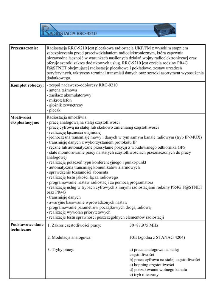 Przeznaczenie: Radiostacja RRC-9210 jest plecakową radiostacją UKF/FM z wysokim stopniem zabezpieczenia przed przeciwdziałaniem radioelektronicznym, która zapewnia niezawodną łączność w warunkach nasilonych działań wojny radioelektronicznej oraz oferuje szeroki zakres dodatkowych usług. RRC-9210 jest częścią rodziny PR4G F@STNET obejmującej radiostacje plecakowe i pokładowe, zestaw urządzeń peryferyjnych, taktyczny terminal transmisji danych oraz szeroki asortyment wyposażenia dodatkowego. Komplet roboczy: - zespół nadawczo-odbiorczy RRC-9210 - antena taśmowa - zasilacz akumulatorowy - mikrotelefon - głośnik zewnętrzny - plecak Możliwości eksploatacyjne: Radiostacja umożliwia: - pracę analogową na stałej częstotliwości - pracę cyfrową na stałej lub skokowo zmienianej częstotliwości - realizację łączności utajnionej - jednoczesną transmisję mowy i danych w tym samym kanale radiowym (tryb IP-MUX) - transmisję danych z wykorzystaniem protokołu IP - ręczne lub automatyczne przesyłanie pozycji z wbudowanego odbiornika GPS - stałe monitorowanie pracy na stałych częstotliwościach przeznaczonych do pracy analogowej - realizację połączeń typu konferencyjnego i punkt-punkt - automatyczną transmisję komunikatów alarmowych - sprawdzenie tożsamości abonenta - realizację testu jakości łącza radiowego - programowanie nastaw radiostacji za pomocą programatora - realizację usług w trybach cyfrowych z innymi radiostacjami rodziny PR4G F@STNET oraz PR4G - transmisję danych - awaryjne kasowanie wprowadzonych nastaw - programowanie parametrów początkowych drogą radiową - realizację wywołań priorytetowych - realizacje testu sprawności poszczególnych elementów radiostacji Podstawowe dane 1. Zakres częstotliwości pracy: techniczne: 30÷87,975 MHz 2. Modulacja analogowa: F3E (zgodna z STANAG 4204) 3. Tryby pracy: a) praca analogowa na stałej częstotliwości b) praca cyfrowa na stałej częstotliwości c) hopping częstotliwości d) poszukiwanie wolnego kanału e) tryb mieszany 4. Rodzaje transmisji: a) cyfrowa transmisja mowy: modulacja DELTA z prędkością 16 kbit/s lub z wykorzystaniem wbudowanego wokodera z prędkościami: 800 bit/s, 2400 bit/s lub 4800 bit/s b) transmisja danych: - synchroniczna: do 42,66 kbit/s - asynchroniczna: do 38,4 kbit/s - pakietowa (interfejs IP): do 19,2 kbit/s - tryb IP-MUX: 5. Znamionowe napięcie zasilania: 15V 6. Interfejs danych: Ethernet 10 Mbit/s i RS-232 7. Znamionowa moc wyjściowa w.cz.: 10/5/0,28 W 8. Czułość odbiornika: ≥ 0,5 µV 9. Dane klimatyczne: a) zakres temperatur pracy: b) hermetyczność: - 40oC, + 70oC do 1m
