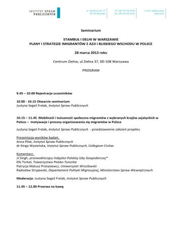 Seminarium STAMBUŁ I DELHI W WARSZAWIE PLANY I STRATEGIE IMIGRANTÓW Z AZJI I BLISKIEGO WSCHODU W POLSCE 28 marca 2013 roku Centrum Zielna, ul Zielna 37, 00-108 Warszawa PROGRAM 9.45 – 10.00 Rejestracja uczestników 10.00 - 10.15 Otwarcie seminarium Justyna Segeš Frelak, Instytut Spraw Publicznych 10.15 – 11.45 Mobilność i tożsamość społeczna migrantów z wybranych krajów azjatyckich w Polsce – motywacje i procesy organizowania się migrantów w Polsce Justyna Segeš Frelak, Instytut Spraw Publicznych - przedstawienie założeń projektu Prezentacja wyników badań: Anna Piłat, Instytut Spraw Publicznych dr Kinga Wysieńska, Instytut Spraw Publicznych, Collegium Civitas Komentarz: JJ Singh, przewodniczący Indyjsko-Polskiej Izby Gospodarczej* Efe Türkel, Towarzystwo Polsko-Tureckie Patrycja Matusz Protasiewcz, Uniwersytet Wrocławski Radosław Stryjewski, Departament Polityki Migracyjnej, Ministerstwo Spraw Wewnętrznych Moderacja: Justyna Segeš Frelak, Instytut Spraw Publicznych 11.45 – 12.00 Przerwa na kawę 12.00 – 13.30 Imigranci z Azji i Bliskiego Wschodu - pracownicy i przedsiębiorcy Prezentacja wyników badań: dr Kinga Wysieńska, Instytut Spraw Publicznych, Collegium Civitas Komentarz: Anna Piłat, Instytut Etnologii Spraw Publicznych Monika Szulecka, Stowarzyszenie Interwencji Prawnej Andrzej Zaręba, Wójt Gminy Raszyn* Ksenia Naranovich, Fundacja Rozwoju „Oprócz Granic” Moderacja: Karolina Grot, Instytut Spraw Publicznych 13.30 - 14.30 Lunch *Obecność nie została ostatecznie potwierdzona Seminarium odbywa się w ramach projektu „Tygiel kulturowy czy getta narodowościowe? – wzory integracji i wzajemne relacje imigrantów z Azji i Bliskiego Wschodu w Polsce” współfinansowanego ze środków Europejskiego Funduszu na rzecz Integracji Obywateli Państw trzecich oraz budżetu państwa. Projekt „Migration to the Centre” jest finansowany z funduszy Komisji Europejskiej w ramach programu “Europe for Citizens” oraz Międzynarodowego Funduszu Wyszehradzkiego.