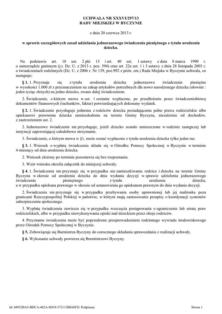 UCHWAŁA NR XXXVI/297/13 RADY MIEJSKIEJ W BYCZYNIE z dnia 20 czerwca 2013 r. w sprawie szczegółowych zasad udzielania jednorazowego świadczenia pieniężnego z tytułu urodzenia dziecka. Na podstawie art. 18 ust. 2 pkt 15 i art. 40 ust. 1 ustawy z dnia 8 marca 1990 r. o samorządzie gminnym (j.t. Dz. U. z 2013 r. poz. 594) oraz art. 22a ust. 1 i 3 ustawy z dnia 28 listopada 2003 r. o świadczeniach rodzinnych (Dz. U. z 2006 r. Nr 139, poz.992 z późn. zm.) Rada Miejska w Byczynie uchwala, co następuje: § 1. 1. Przyznaje się z tytułu urodzenia dziecka jednorazowe świadczenie pieniężne w wysokości 1.000 zł z przeznaczeniem na zakup artykułów potrzebnych dla nowo narodzonego dziecka (słownie : jeden tysiąc złotych) na jedno dziecko, zwane dalej świadczeniem. 2. Świadczenie, o którym mowa w ust. 1 zostanie wypłacone, po przedłożeniu przez świadczeniobiorcę dokumentów finansowych (rachunków, faktur) potwierdzających dokonany wydatek. § 2. 1. Świadczenie przysługuje jednemu z rodziców dziecka posiadającemu pełne prawa rodzicielskie albo opiekunowi prawnemu dziecka zamieszkałemu na terenie Gminy Byczyna, niezależnie od dochodów, z zastrzeżeniem ust. 2. 2. Jednorazowe świadczenie nie przysługuje, jeżeli dziecko zostało umieszczone w rodzinie zastępczej lub instytucji zapewniającej całodobowe utrzymanie. 3. Świadczenie, o którym mowa w §1, może zostać wypłacone z tytułu urodzenia dziecka tylko jeden raz. § 3. 1. Wniosek o wypłatę świadczenia składa się w Ośrodku Pomocy Społecznej w Byczynie w terminie 4 miesięcy od dnia urodzenia dziecka. 2. Wniosek złożony po terminie pozostawia się bez rozpoznania. 3. Wzór wniosku określa załącznik do niniejszej uchwały. § 4. 1. Świadczenia nie przyznaje się w przypadku nie zamieszkiwania rodzica i dziecka na terenie Gminy Byczyna w okresie od urodzenia dziecka do dnia wydania decyzji w sprawie udzielenia jednorazowego świadczenia pieniężnego z tytułu urodzenia dziecka, a w przypadku opiekuna prawnego w okresie od ustanowienia go opiekunem prawnym do dnia wydania decyzji. 2. Świadczenia nie przyznaje się w przypadku przebywania osoby uprawnionej lub jej małżonka poza granicami Rzeczypospolitej Polskiej w państwie, w którym mają zastosowanie przepisy o koordynacji systemów zabezpieczenia społecznego. 3. Wypłatę świadczenia zawiesza się w przypadku wszczęcia postępowania o ograniczenie lub utratę praw rodzicielskich, albo w przypadku niewykonywania opieki nad dzieckiem przez oboje rodziców. 4. Przyznanie świadczenia może być poprzedzone przeprowadzeniem rodzinnego wywiadu środowiskowego przez Ośrodek Pomocy Społecznej w Byczynie. § 5. Zobowiązuje się Burmistrza Byczyny do corocznego składania sprawozdania z realizacji uchwały. § 6. Wykonanie uchwały powierza się Burmistrzowi Byczyny. Id: 68952BA5-BDCA-462A-8D18-572115BE68FD. Podpisany Strona 1 § 7. Uchwała podlega ogłoszeniu w Dzienniku Urzędowym Województwa Opolskiego i wchodzi w życie z dniem 01.01.2014r. Przewodniczący Rady Miejskiej w Byczynie Grzegorz Kapica Id: 68952BA5-BDCA-462A-8D18-572115BE68FD. Podpisany Strona 2 Załącznik do Uchwały Nr XXXVI/297/13 Rady Miejskiej w Byczynie z dnia 20 czerwca 2013r. WNIOSEK O USTALENIE UPRAWNIEŃ DO JEDNORAZOWEGO ŚWIADCZENIA PIENIĘśNEGO Z TYTUŁU URODZENIA DZIECKA Część I. Imię i nazwisko osoby ubiegającej się: ................................................................................................... PESEL : …....…..…..…...…..…..…..…...….…..….. Stan cywilny: ………………....................................... M-ce zamieszkania: ................................................................................................... ............................... (pełna nazwa ulicy) kod pocztowy Obywatelstwo: ............................................ Telefon : ............................................................................................... Imię i nazwisko drugiego rodzica dziecka: ............................................................................................. PESEL ….....…...…...…..…..…..…..…...……..….. Stan cywilny: ………………...................................... Miejsce zamieszkania: ............................................................................................................................... Obywatelstwo: ............................................. Wnoszę o przyznanie jednorazowego świadczenia pienięŜnego z tytułu urodzenia dziecka: Imię i nazwisko dziecka: ........................................................................................................................... Data urodzenia: …….…...….….……… PESEL : ….....…..…..…...….…..…..…...….…..………………….. Obywatelstwo: .......................................................... Miejsce zamieszkania: ................................................................................................................................ Część II. Oświadczenie słuŜące ustaleniu prawa do przyznania jednorazowego świadczenia pienięŜnego z tytułu urodzenia dziecka. Oświadczam, Ŝe: powyŜsze dane są prawdziwe; zapoznałem/am się z warunkami uprawniającymi do przyznania jednorazowego świadczenia pienięŜnego z tytułu urodzenia dziecka; jednorazowe świadczenie pienięŜne z tytułu urodzenia dziecka nie zostało wypłacone przez inną instytucję. ........................................................................ (data i podpis osoby ubiegającej się) Id: 68952BA5-BDCA-462A-8D18-572115BE68FD. Podpisany Strona 3 DO WNIOSKU DOŁĄCZAM: 1) kserokopię dokumentu toŜsamości 2) kserokopię aktu urodzenia dziecka 3) rachunki, faktury potwierdzające zakup artykułów potrzebnych dla nowo narodzonego dziecka. Oświadczam, Ŝe jestem świadoma/świadomy odpowiedzialności karnej za złoŜenie fałszywego oświadczenia. .