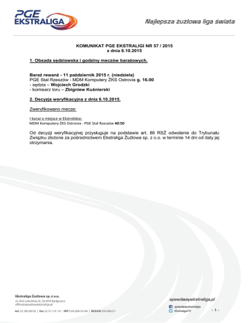 Komunikat PGE Ekstraligi 57/2015 06.10.2015