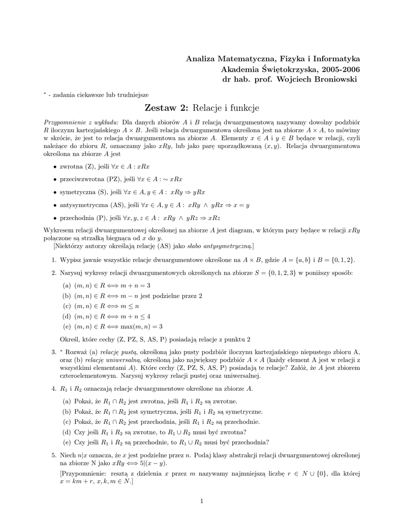 Przypomnienie z wykladu: Dla danych zbiorów A i B relacja‘ dwuargumentowa‘ nazywamy dowolny podzbiór