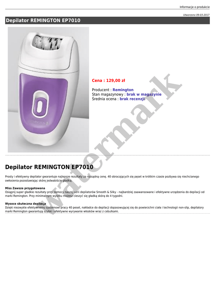 Informacje o produkcie Utworzono 09-03-2017 Depilator REMINGTON EP7010 er m ar k Cena : 129,00 zł Producent : Remington Stan magazynowy : brak w magazynie Średnia ocena : brak recenzji Depilator REMINGTON EP7010 at Prosty i efektywny depilator gwarantuje najlepsze rezultaty za rozsądną cenę. 40 obracających się pęset w krótkim czasie pozbywa się niechcianego owłosienia pozostawiając skórę jedwabiście gładką. w Miss Zawsze przygotowana Osiągnij super gładkie rezultaty przy pomocy naszej serii depilatorów Smooth & Silky - najbardziej zaawansowane i efektywne urządzenia do depilacji od marki Remington. Przy minimalnym wysiłku możesz cieszyć się gładką skórą do 4 tygodni. Wysoce skuteczna depilacja Dzięki niezwykle efektywnemu systemowi pracy 40 peset, nakładce do depilacji dopasowującej się do powierzchni ciała i technologii non-slip, depilatory marki Remington gwarantują szybki i efektywne wyrywanie włosków wraz z cebulkami.