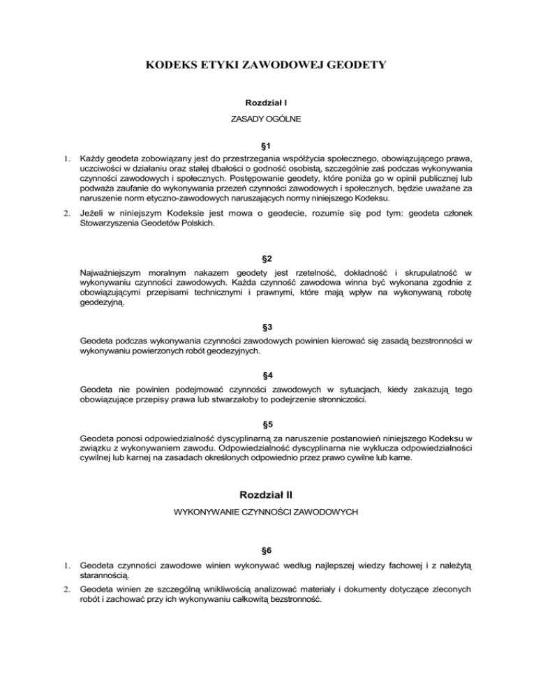 KODEKS ETYKI ZAWODOWEJ GEODETY Rozdział I ZASADY OGÓLNE §1 1. Każdy geodeta zobowiązany jest do przestrzegania współżycia społecznego, obowiązującego prawa, uczciwości w działaniu oraz stałej dbałości o godność osobistą, szczególnie zaś podczas wykonywania czynności zawodowych i społecznych. Postępowanie geodety, które poniża go w opinii publicznej lub podważa zaufanie do wykonywania przezeń czynności zawodowych i społecznych, będzie uważane za naruszenie norm etyczno-zawodowych naruszających normy niniejszego Kodeksu. 2. Jeżeli w niniejszym Kodeksie jest mowa o geodecie, rozumie się pod tym: geodeta członek Stowarzyszenia Geodetów Polskich. §2 Najważniejszym moralnym nakazem geodety jest rzetelność, dokładność i skrupulatność w wykonywaniu czynności zawodowych. Każda czynność zawodowa winna być wykonana zgodnie z obowiązującymi przepisami technicznymi i prawnymi, które mają wpływ na wykonywaną robotę geodezyjną. §3 Geodeta podczas wykonywania czynności zawodowych powinien kierować się zasadą bezstronności w wykonywaniu powierzonych robót geodezyjnych. §4 Geodeta nie powinien podejmować czynności zawodowych w sytuacjach, kiedy zakazują tego obowiązujące przepisy prawa lub stwarzałoby to podejrzenie stronniczości. §5 Geodeta ponosi odpowiedzialność dyscyplinarną za naruszenie postanowień niniejszego Kodeksu w związku z wykonywaniem zawodu. Odpowiedzialność dyscyplinarna nie wyklucza odpowiedzialności cywilnej lub karnej na zasadach określonych odpowiednio przez prawo cywilne lub karne. Rozdział II WYKONYWANIE CZYNNOŚCI ZAWODOWYCH §6 1. Geodeta czynności zawodowe winien wykonywać według najlepszej wiedzy fachowej i z należytą starannością. 2. Geodeta winien ze szczególną wnikliwością analizować materiały i dokumenty dotyczące zleconych robót i zachować przy ich wykonywaniu całkowitą bezstronność. 3. Geodeta w wykonywaniu czynności zawodowych jest niezawisły, tzn. żadne okoliczności pozaprawne lub inne, nie mające związku z obiektywnie ocenionym stanem faktycznym sprawy, nie mogą wpływać na opinię techniczno-prawną i postępowanie geodety. 4. Otrzymane polecenia nie zwalniają geodety od obowiązku przestrzegania zasad etyki zawodowej. §7 1. Geodeta winien doskonalić stale swoją wiedzę zawodową i dbać o to aby na bieżąco wprowadzać osiągnięcia naukowe i techniczne do wykonywanego przez siebie zawodu. 2. Geodeta przy wykonywaniu czynności zawodowych nie powinien okazywać swojego osobistego stosunku do osób, których te czynności dotyczą. §8 Na geodecie ciąży również obowiązek zachowania tajemnicy odnośnie faktów, danych i informacji otrzymanych w trakcie wykonywania czynności zawodowych. §9 1. Geodeta powinien troszczyć się o należyte kształtowanie społecznej opinii o zawodzie, tzn. dbać aby w trakcie wykonywania czynności zawodowych nie narazić reputacji Stowarzyszenia, środowiska zawodowego i swojej własnej. 2. Geodeta obowiązany jest powstrzymać się od nieuczciwej konkurencji. 3. Geodeta nie może odmówić udzielenia swojemu zleceniodawcy pełnych wyjaśnień dotyczących zleconej roboty, sposobów jej wykonania oraz wszelkich uwarunkowań prawnych ciążących na danym zleceniu. §10 Geodeta jako autor opracowania dokumentacji może przy swoim nazwisku podać przynależność do Stowarzyszenia. Rozdział III ZASADY POSTĘPOWANIA GEODETY JAKO BIEGŁEGO LUB UPRAWNIONEGO PRZED SĄDAMI I INNYMI ORGANAMI ORZEKAJĄCYMI §11 W postępowaniu sądowym lub w postępowaniu przed organem orzekającym, gdzie geodeta występuje jako biegły lub świadek na okoliczności wykonywanej roboty geodezyjnej, obowiązany jest złożyć informację w zakresie opinii technicznej i prawnej. Jeśli jego zeznanie miałoby być objęte tajemnicą państwową, wówczas powinien o tym poinformować sąd lub organ orzekający. §12 1. Geodeta winien wykazywać opanowanie, takt i umiar nawet w wypadku niewłaściwego zachowania się osób biorących udział w postępowaniu. 2. Geodeta winien dbać o to, aby nie naruszać godności osób biorących udział w postępowaniu. Rozdział IV ZASADY ZACHOWANIA SIĘ GEODETY W SPOŁECZNOŚCI SGP §13 1. Stosunki między geodetami powinny być oparte o wzajemną lojalność i koleżeństwo. 2. Geodeta winien zwrócić uwagę koledze na jego naganne zachowanie, w szczególności naruszające zasady niniejszego Kodeksu. Jeżeli okaże się, że zwrócenie uwagi nie odnosi pożądanego skutku, wówczas czyniący tę uwagę winien zawiadomić o tym Sąd Koleżeński, który w zależności od rodzaju przewinienia, podejmie odpowiednie działania na podstawie niniejszego Kodeksu i regulaminu swego działania oraz zastosuje odpowiednie rygory dyscyplinarne, zgodnie ze Statutem SGP. §14 1. Geodeci powinni udzielać sobie pomocy w pracy zawodowej. 2. Geodeci winni darzyć szczególnym szacunkiem kolegów seniorów i rencistów, a w razie potrzeby służyć im pomocą koleżeńską i materialną. §15 W razie potrzeby udzielania opinii technicznej, uprzednio wydanej w tej sprawie przez innego geodetę, autor następnej opinii winien porozumieć się z autorem poprzedniej, w szczególności w przypadku wydania opinii odmiennej. Pod żadnym pozorem nie wolno używać wyrażeń naruszających godność autora poprzedniej opinii i jego dobrego imienia oraz jego kwalifikacji zawodowych. §16 Geodeta, który kieruje pracą młodszego kolegi, powinien przekazywać mu swą wiedzę i doświadczenie oraz kształtować jego postawę w duchu etyki zawodowej. §17 Opinia o pracy zawodowej geodety, oceniająca jego pracę, powinna być rzeczowa, obiektywna i ewentualnie poprzedzona wysłuchaniem zainteresowanego. §18 Publiczne negatywne wypowiadanie się przez geodetę o pracy zawodowej innego geodety jest niedopuszczalne, chyba, że wynika z obowiązków lub uprawnień służbowych. §19 1. W razie sporu między geodetami należy przede wszystki