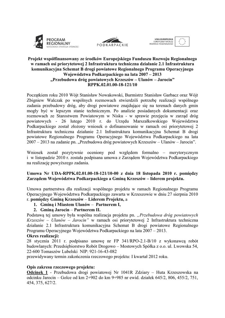 Projekt współfinansowany ze środków Europejskiego Funduszu Rozwoju Regionalnego w ramach osi priorytetowej 2 Infrastruktura techniczna działanie 2.1 Infrastruktura komunikacyjna Schemat B drogi powiatowe Regionalnego Programu Operacyjnego Województwa Podkarpackiego na lata 2007 – 2013 „Przebudowa dróg powiatowych Krzeszów – Ulanów – Jarocin” RPPK.02.01.00-18-121/10 Początkiem roku 2010 Wójt Stanisław Nowakowski, Burmistrz Stanisław Garbacz oraz Wójt Zbigniew Walczak po wspólnych rozmowach stwierdzili potrzebę realizacji wspólnego zadania przebudowy dróg, aby drogi powiatowe znajdujące się na terenach danych gmin mogły być w lepszym stanie technicznym. Po analizie posiadanych dokumentacji oraz rozmowach ze Starostwem Powiatowym w Nisku - w sprawie przejęcia w zarząd dróg powiatowych - 26 lutego 2010 r. do Urzędu Marszałkowskiego Województwa Podkarpackiego został złożony wniosek o dofinansowanie w ramach osi priorytetowej 2 Infrastruktura techniczna działanie 2.1 Infrastruktura komunikacyjna Schemat B drogi powiatowe Regionalnego Programu Operacyjnego Województwa Podkarpackiego na lata 2007 – 2013 na zadanie pn. „Przebudowa dróg powiatowych Krzeszów – Ulanów – Jarocin”. Wniosek został pozytywnie oceniony pod względem formalno – merytorycznym i w listopadzie 2010 r. została podpisana umowa z Zarządem Województwa Podkarpackiego na realizację powyższego zadania. Umowa Nr UDA-RPPK.02.01.00-18-121/10-00 z dnia 18 listopada 2010 r. pomiędzy Zarządem Województwa Podkarpackiego a Gminą Krzeszów – liderem projektu. Umowa partnerstwa dla realizacji wspólnego projektu w ramach Regionalnego Programu Operacyjnego Województwa Podkarpackiego zawarta w Krzeszowie w dniu 27 sierpnia 2010 r. pomiędzy Gminą Krzeszów – Liderem Projektu, a 1. Gminą i Miastem Ulanów – Partnerem I, 2. Gminą Jarocin – Partnerem II. Podstawą tej umowy była wspólna realizacja projektu pn. „Przebudowa dróg powiatowych Krzeszów – Ulanów – Jarocin” w ramach osi priorytetowej 2 Infrastruktura techniczna działanie 2.1 Infrastruktura komunikacyjna Schemat B drogi powiatowe Regionalnego Programu Operacyjnego Województwa Podkarpackiego na lata 2007 – 2013. Okres realizacji: 28 stycznia 2011 r. podpisano umowę nr FP 341/RPO-2.1-B/10 z wykonawcą robót budowlanych: Przedsiębiorstwo Robót Drogowo – Mostowych Spółka z o.o. ul. Lwowska 54, 22-600 Tomaszów Lubelski NIP: 921-16-43-082 przewidywany termin zakończenia rzeczowego projektu: I kwartał 2012 roku. Opis zakresu rzeczowego projektu: Odcinek 1 - Przebudowa drogi powiatowej Nr 1041R Zdziary – Huta Krzeszowska na odcinku Jarocin – Golce od km 2+902 do km 9+985 nr ewid. działek 645/2, 806, 455/2, 751, 454, 375, 627/2. Odcinek 2 - Przebudowa drogi powiatowej Nr 1044R Golce – Kurzyna Średnia na odcinku od km 0+015 do km 2+040 i od km 2+080 do km 4+536 nr ewid. działek 375, 27, 1012/2, 1012/3, 182/1, 371, 182/2. Odcinek 3 - Przebudowa drogi powiatowej Nr 1062R Ulanów - Podolszynka na odcinku od km 1+300 do km 10+852 nr ewid. działek 956, 443, 357, 1049, 1930. Odcinek 4 - Przebudowa drogi powiatowej Nr 1069R od dr 858 – Krzeszów na odcinku od km 10+700 do km 11+899,43 nr ewid. działki 731/2. Łączna długość odcinków ww. dróg wynosi 22 315 mb. Budowa chodnika na odcinkach: 1) od km 2+902 do km 3+125 (plus 13 mb - na początku odcinka chodnik biegnie łukiem względem jezdni) = 236 mb, 2) od km 4+686,34 do km 4+725,76 = 39,4 mb, 3) od km 5+242 do km 5+289,20 = 47,2 mb, 4) od km 6+794,66 do km 6+919,08 = 124,4 mb, 5) od km 8+481,81 do km 8+501,81 = 20 mb, 6) od km 9+546,75 do km 9+566,75 =20 mb. Przebudowa i budowa zatok autobusowych na terenie Gminy Krzeszów, Ulanów i Jarocin. Całkowite wydatki projektu: 9 302 003,56 PLN Wydatki kwalifikowane: 9 285 526,97 PLN Wydatki niekwalifikowane: 16 476,59 PLN Kwota dofinansowania z EFRR: 4 278 770,82 PLN Wkład własny: Gmina Krzeszów: 1 453 835,64 zł (w tym Powiat Niżański 722 185,80 zł) Gmina i Miasto Ulanów: 1 917 898,49 zł (w tym Powiat Niżański 950 778,56 zł) Gmina Jarocin: 1 651 498,61 zł (w tym Powiat Niżański 803 039,58 zł) Problemy szczegółowe zidentyfikowane w związku z realizowanym projektem to: konieczność modernizacji dróg powiatowych dla zwiększenia dostępności komunikacyjnej, co jest ważnym czynnikiem dla przyciągnięcia inwestorów z zewnątrz, poprawa dostępności komunikacyjnej dla mieszkańców gmin Krzeszów, Ulanów, Jarocin do szkół, miejsc pracy, służby zdrowia, instytucji kultury, placówek administracji, poprawa dostępności do większych ośrodków w regionie i kraju poprzez zwiększenia dostępności dróg nadrzędnych tj. do dróg wojewódzkich i drogi krajowej 19, poprawa dostępności do miejsc atrakcyjnych turystycznie. Celem projektu jest poprawa infrastruktury drogowej, co spowoduje poprawę komunikacji na terenie obszaru objętego oddziaływaniem projektu. W konsekwencji podjętych działań nastąpi obniżenie kosztów utrzymania i remontów dróg, a także zwiększona przepustowość pojazdów oraz skrócenie czasu przejazdu remontowanym odcinkiem drogi. Realizacja projektu będzie miała pozytywny wpływ na: rozwój istniejących już podmiotów gospodarczych, przyciągniecie nowych inwestorów, podniesienie standardu życia lokalnej społeczności, rozwój turystyki regionu, estetykę obszaru objętego oddziaływaniem projektu, wyrównanie szans rozwojowych obszarów wiejskich województwa podkarpackiego.