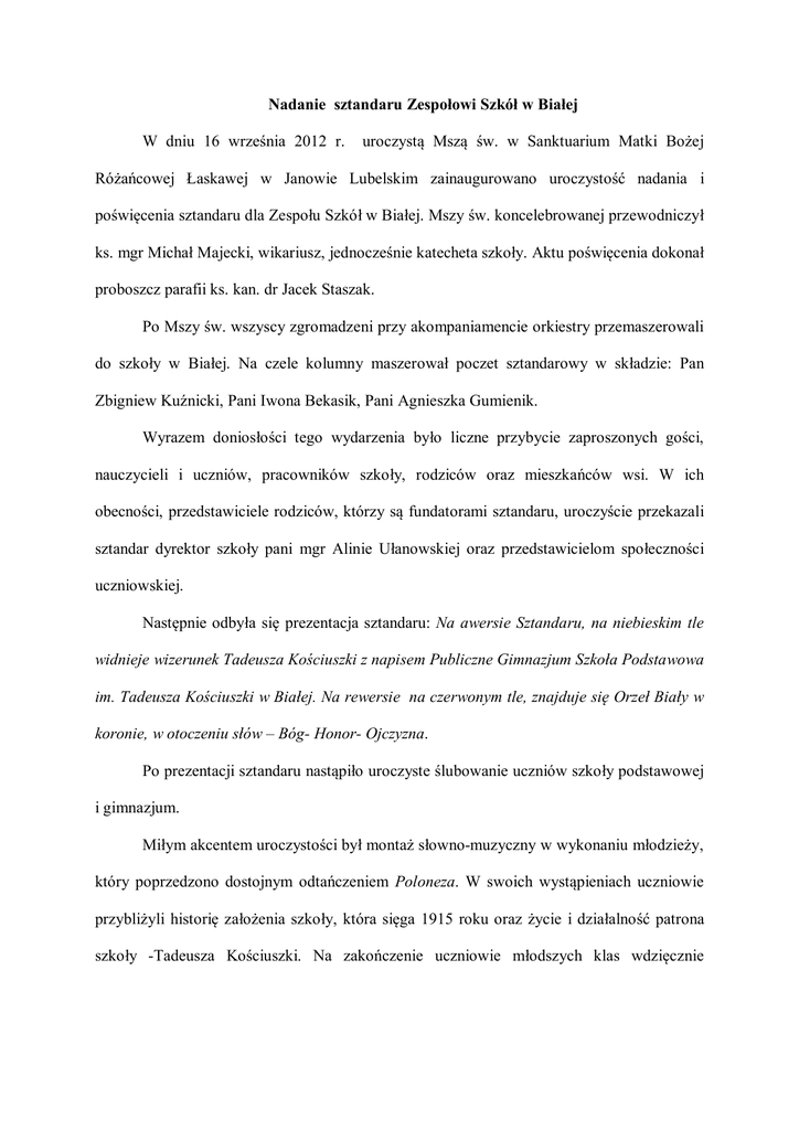Nadanie sztandaru Zespołowi Szkół w Białej W dniu 16 września 2012 r. uroczystą Mszą św. w Sanktuarium Matki Bożej Różańcowej Łaskawej w Janowie Lubelskim zainaugurowano uroczystość nadania i poświęcenia sztandaru dla Zespołu Szkół w Białej. Mszy św. koncelebrowanej przewodniczył ks. mgr Michał Majecki, wikariusz, jednocześnie katecheta szkoły. Aktu poświęcenia dokonał proboszcz parafii ks. kan. dr Jacek Staszak. Po Mszy św. wszyscy zgromadzeni przy akompaniamencie orkiestry przemaszerowali do szkoły w Białej. Na czele kolumny maszerował poczet sztandarowy w składzie: Pan Zbigniew Kuźnicki, Pani Iwona Bekasik, Pani Agnieszka Gumienik. Wyrazem doniosłości tego wydarzenia było liczne przybycie zaproszonych gości, nauczycieli i uczniów, pracowników szkoły, rodziców oraz mieszkańców wsi. W ich obecności, przedstawiciele rodziców, którzy są fundatorami sztandaru, uroczyście przekazali sztandar dyrektor szkoły pani mgr Alinie Ułanowskiej oraz przedstawicielom społeczności uczniowskiej. Następnie odbyła się prezentacja sztandaru: Na awersie Sztandaru, na niebieskim tle widnieje wizerunek Tadeusza Kościuszki z napisem Publiczne Gimnazjum Szkoła Podstawowa im. Tadeusza Kościuszki w Białej. Na rewersie na czerwonym tle, znajduje się Orzeł Biały w koronie, w otoczeniu słów – Bóg- Honor- Ojczyzna. Po prezentacji sztandaru nastąpiło uroczyste ślubowanie uczniów szkoły podstawowej i gimnazjum. Miłym akcentem uroczystości był montaż słowno-muzyczny w wykonaniu młodzieży, który poprzedzono dostojnym odtańczeniem Poloneza. W swoich wystąpieniach uczniowie przybliżyli historię założenia szkoły, która sięga 1915 roku oraz życie i działalność patrona szkoły -Tadeusza Kościuszki. Na zakończenie uczniowie młodszych klas wdzięcznie zatańczyli Krakowiaczka oraz Marsz Radeckiego, czym wzbudzili entuzjazm zebranych i otrzymali gromkie brawa. Nastąpiła ceremonia wbijania symbolicznych gwoździ przez gości i przyjaciół szkoły oraz wpisy do księgi pamiątkowej. Szkolną uroczystość zaszczycili: Pan Krzysztof Babisz - Lubelski Kurator Oświaty, Pan Jan Frania - Radny Sejmiku Wojewódzkiego, Pan Jerzy Bielecki - Starosta Powiatu Janowskiego Pan Krzysztof Kołtyś - Burmistrz Janowa Lubelskiego, gospodarz naszej gminy, Pani Ewa Janus - Przewodnicząca Rady Miejskiej oraz Radni: Pan Andrzej Łukasik, Pan Marek Tomczyk. Pani Lidia Tryka, Pani Iwona Zozulińska - Sowa Pan Czesław Krzysztoń - Zastępca Burmistrza Janowa Lubelskiego, Pani Bożena Czajkowska - Sekretarz Gminy, Ks. Michał Majecki – Wikariusz Sanktuarium w Janowie Lub. Pan Zbigniew Flis - Dyrektor Zakładu Obsługi Szkół i Przedszkoli, Pani Barbara Nazarewicz - Dyrektor Muzeum Regionalnego w Janowie Lubelskim, Pan Łukasz Drewniak - Dyrektor Janowskiego Ośrodka Kultury, Pani Alicja Gąbka - Dyrektor Liceum Ogólnokształcącego w Janowie Lubelskim, Pani Teresa Biernat - Dyrektor Zespołu Szkół w Janowie Lubelskim, Pan Mariusz Wieleba - Dyrektor Zespołu Szkół Zawodowych w Janowie Lubelskim, Pani Krystyna Ćwiek Dyrektor Publicznej Szkoły Podstawowej z Oddziałami Integracyjnymi w Janowie Lubelskim Pani Barbara Haliniak - Dyrektor Szkoły Podstawowej w Momotach Górnych, Pan Andrzej Tomczyk - Dyrektor Publicznego Gimnazjum w Janowie Lubelskim Pani Halina Drelich - Dyrektor Przedszkola Nr 3 w Janowie Lubelskim Pani Elżbieta Gil - Dyrektor Przedszkola Nr1 w Janowie Lubelskim Pani Bożena Pałka - Dyrektor Szkoły Podstawowej Fundacji Elementarz w Łążku Ordynackim, Pan Piotr Szabat – Prezes Kółek Rolniczych Pan Stanisław Mróz – Prywatny Przedsiębiorca Emerytowani dyrektorzy szkoły w Białej: Pan Czesław Olech, Pan Antoni Kulpa, Emerytowani nauczyciele: Pan Franciszek Bednarz, Pani Czesława Garbula, Pani Karolina Janacz, Pani Alfreda Olech, Pani Janina Tyra Sołtysi wsi Biała: Pan Stanisław Mucha, Przedstawiciele Komitetu Budowy Szkoły: Pan Bronisław Orzeł, Pani Teresa Pudło, Pani Helena Chabuda, Pani Krystyna Mazur, Pan Zbigniew Kuźnicki, Pan Stanisław Zdybel, Pani Jadwiga Pituch Prezydium Rady Rodziców przy Zespole Szkół w Białej: Pani Iwona Beksiak, Pani Barbara Flis- Kienig, Pani Ewa Kulpa, Pani Małgorzata Pudło Pani Bożena Król, W uroczystości udział wzięli aktualnie pracujący nauczyciele: Pani Alina Ułanowska – Dyrektor szkoły Pan Grzegorz Ciupak Pani Wiesława Drewniak, Pan Piotra Gąbka, Pani Lidia Hyła, Pani Ewa Jargiło, Pani Iwona Jarosz, Pani Monika Jonak, Pani Izabela Komsa, Pani Elżbieta Kozłowska Pani Anna Król, Pan Tadeusz Lachawiec, Pani Bożena Mędrek, Pani Dorota Nafalska Pani Jolanta Nieścior, Pani Marta Nowak, Pani Barbara Olech Pan Marek Sulowski, Pan Mariusz Widz, Pani Zofia Zezulińska Uczniowie wraz z Rodzicami Przedstawiciele mediów: Pani Alina Boś - Redaktor Panoramy Janowskiej, Pan Jan Machulak - Redaktor Gazety Janowskiej, Nadanie sztandaru Zespołowi Szkół w Białej było wielkim wydarzeniem dla młodzieży szkolnej i dla dorosłych mieszkańców wsi. Rodzice aktywnie włączyli się w oprawę Mszy św. w kościele, przygotowania swych dzieci do występów, organizację przemarszu i inne niezbędne czynności. Uprzednie przygotowania pod kierunkiem nauczycieli mobilizowały uczniów do bardziej szczegółowego poznania historii swej szkoły oraz życia i działalności swego Patrona, Tadeusza Kościuszki. Wyniki ogłoszonych konkursów na tematyczny utwór poetycki oraz pracę plastyczną zgromadzeni poznali podczas uroczystości. Oprawa ceremonii, dekoracje, symbolika, gesty szacunku były dla młodego pokolenia wspaniałą lekcją historii.
