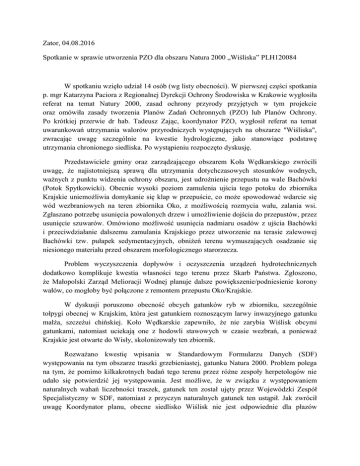 Zator, 04.08.2016 Spotkanie w sprawie utworzenia PZO dla obszaru Natura 2000 „Wiśliska” PLH120084 W spotkaniu wzięło udział 14 osób (wg listy obecności). W pierwszej części spotkania p. mgr Katarzyna Paciora z Regionalnej Dyrekcji Ochrony Środowiska w Krakowie wygłosiła referat na temat Natury 2000, zasad ochrony przyrody przyjętych w tym projekcie oraz omówiła zasady tworzenia Planów Zadań Ochronnych (PZO) lub Planów Ochrony. Po krótkiej przerwie dr hab. Tadeusz Zając, koordynator PZO, wygłosił referat na temat uwarunkowań utrzymania walorów przyrodniczych występujących na obszarze "Wiśliska", zwracając uwagę szczególnie na kwestie hydrologiczne, jako stanowiące podstawę utrzymania chronionego siedliska. Po wystąpieniu rozpoczęto dyskusję. Przedstawiciele gminy oraz zarządzającego obszarem Koła Wędkarskiego zwrócili uwagę, że najistotniejszą sprawą dla utrzymania dotychczasowych stosunków wodnych, ważnych z punktu widzenia ochrony obszaru, jest udrożnienie przepustu na wale Bachówki (Potok Spytkowicki). Obecnie wysoki poziom zamulenia ujścia tego potoku do zbiornika Krajskie uniemożliwia domykanie się klap w przepuście, co może spowodować wdarcie się wód wezbraniowych na teren zbiornika Oko, z możliwością rozmycia wału, zalania wsi. Zgłaszano potrzebę usunięcia powalonych drzew i umożliwienie dojścia do przepustów, przez usunięcie szuwarów. Omówiono możliwość usunięcia nadmiaru osadów z ujścia Bachówki i przeciwdziałanie dalszemu zamulania Krajskiego przez utworzenie na terasie zalewowej Bachówki tzw. pułapek sedymentacyjnych, obniżeń terenu wymuszających osadzanie się niesionego materiału przed obszarem morfologicznego starorzecza. Problem wyczyszczenia dopływów i oczyszczenia urządzeń hydrotechnicznych dodatkowo komplikuje kwestia własności tego terenu przez Skarb Państwa. Zgłoszono, że Małopolski Zarząd Melioracji Wodnej planuje dalsze powiększenie/podniesienie korony wałów, co mogłoby być połączone z remontem przepustu Oko/Krajskie. W dyskusji poruszono obecność obcych gatunków ryb w zbiorniku, szczególnie tołpygi obecnej w Krajskim, która jest gatunkiem roznoszącym larwy inwazyjnego gatunku małża, szczeżui chińskiej. Koło Wędkarskie zapewniło, że nie zarybia Wiślisk obcymi gatunkami, natomiast uciekają one z hodowli stawowych w czasie wezbrań, a ponieważ Krajskie jest otwarte do Wisły, skolonizowały ten zbiornik. Rozważano kwestię wpisania w Standardowym Formularzu Danych (SDF) występowania na tym obszarze traszki grzebieniastej, gatunku Natura 2000. Problem polega na tym, że pomimo kilkakrotnych badań tego terenu przez różne zespoły herpetologów nie udało się potwierdzić jej występowania. Jest możliwe, że w związku z występowaniem naturalnych wahań liczebności traszek, gatunek ten został ujęty przez Wojewódzki Zespół Specjalistyczny w SDF, natomiast z przyczyn naturalnych gatunek ten ustąpił. Jak zwrócił uwagę Koordynator planu, obecne siedlisko Wiślisk nie jest odpowiednie dla płazów ogoniastych, w związku z czym gatunek ten powinien być raczej usunięty z listy gatunków będących przedmiotem ochrony na tym obszarze. T. Zając i K. Ciężak z Towarzystwa na rzecz Ziemi krótko omówili kwestię uporządkowania brzegów zbiorników, które obrastają samowolnymi wiatami i urządzeniami, konstruowanymi przez wędkarzy, niestety często z naruszeniem naturalnego stanu brzegów. Temat ten postanowiono podjąć w czasie wizji terenowej. Omówiono również kwestię usunięcia topól mieszańcowych z północnej części zbiornika Miejsce. Eksploatacja drzew na starorzeczu Miejsce przez właściciela terenu jest możliwa za zgodą gminy. Właścicielem gruntu jest tu Regionalny Zarząd Gospodarki Wodnej w Krakowie. W odniesieniu do zadrzewień rozważano możliwość włączenia w granice obszaru lasu rosnącego na stożku napływowym Łowiczanki, jednak kwestię tę pozostawiono do rozstrzygnięcia na etapie analizy pełnej dokumentacji i po wizji terenowej. Spośród potencjalnych problemów wymieniono plany wybudowania żwirowni we wnętrzu zakola. Niestety, przedstawiciele inwestora nie byli obecni na spotkaniu. Wymieniono zakłady przeróbcze i transport jako główne zagrożenia ze strony żwirowni. Realizację tego przedsięwzięcia uznano za mało prawdopodobną, bowiem po przekazaniu terenu wnętrza starorzecza gminie Spytkowice z gminy Alwernia, może pojawić się problem z wydaną już koncesją dla żwirowni, bowiem wydana ona była przez wcześniejszego administratora terenu, gminę Alwernia. Pozostaje problem uaktualnienia "Studium uwarunkowań i kierunków zagospodarowania przestrzennego gminy" wobec zmiany granic, w odniesieniu do terenu wnętrza zakola. Ustalono, że odbędą się jeszcze dwa spotkania, następne w Spytkowicach, połączone z wizją w terenie. Ustalono również, że spotkania będą odbywały się w porze przedpołudniowej, jako wygodniejszej dla zainteresowanych osób. Na następnym spotkaniu postanowiono omówić projekt planowanej żwirowni oraz wyniki poszukiwań źródłowych informacji o traszce grzebieniastej. Protokół ze spotkania sporządziła: Anna Lipińska