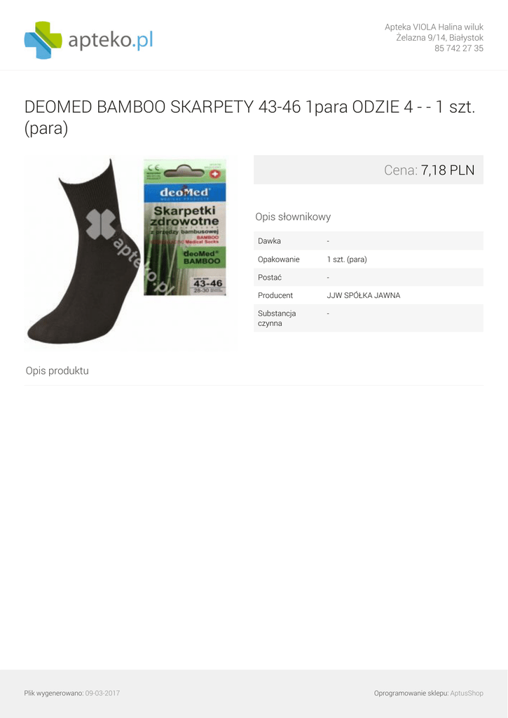 Apteka VIOLA Halina wiluk Żelazna 9/14, Białystok 85 742 27 35 DEOMED BAMBOO SKARPETY 43-46 1para ODZIE 4 - - 1 szt. (para) Cena: 7,18 PLN Opis słownikowy Dawka - Opakowanie 1 szt. (para) Postać - Producent JJW SPÓŁKA JAWNA Substancja czynna - Opis produktu Plik wygenerowano: 09-03-2017 Powered by TCPDF (www.tcpdf.org) Oprogramowanie sklepu: AptusShop