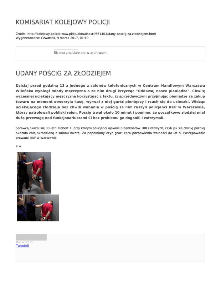 KOMISARIAT KOLEJOWY POLICJI Źródło: http://kolejowy.policja.waw.pl/kk/aktualnosci/66140,Udany-poscig-za-zlodziejem.html Wygenerowano: Czwartek, 9 marca 2017, 01:19 Strona znajduje się w archiwum. UDANY POŚCIG ZA ZŁODZIEJEM Dzisiaj przed godziną 13 z jednego z salonów telefonicznych w Centrum Handlowym Warszawa Wileńska wybiegł młody mężczyzna a za nim drugi krzycząc "Oddawaj nasze pieniądze". Chwilę wcześniej uciekający mężczyzna korzystając z faktu, iż sprzedawczyni przyjmując pieniądze za zakup towaru na moment otworzyła kasę, wyrwał z niej garść pieniędzy i rzucił się do ucieczki. Widząc uciekającego złodzieja bez chwili wahania w pościg za nim ruszyli policjanci KKP w Warszawie, którzy patrolowali pobliski rejon. Pościg trwał około 10 minut i pomimo, że początkowo złodziej miał dużą przewagę nad funkcjonariuszami Ci bez problemu go dogonili i zatrzymali. Sprawcą okazał się 33-letni Robert K. przy którym policjanci ujawnili 6 banknotów 100 złotowych, czyli jak się chwilę później okazało całą skradzioną z salonu kwotę. Za popełniony czyn grozi kara pozbawienia wolności do lat 5. Postępowanie prowadzi KKP w Warszawie. a.w. Ocena: 5/5 (5) Tweetnij