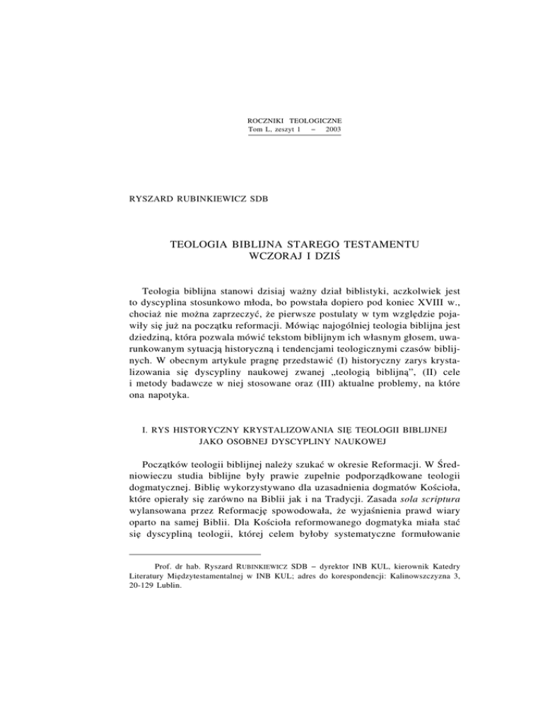 ROCZNIKI TEOLOGICZNE Tom L, zeszyt 1 − 2003 RYSZARD RUBINKIEWICZ SDB TEOLOGIA BIBLIJNA STAREGO TESTAMENTU WCZORAJ I DZIŚ Teologia biblijna stanowi dzisiaj ważny dział biblistyki, aczkolwiek jest to dyscyplina stosunkowo młoda, bo powstała dopiero pod koniec XVIII w., chociaż nie można zaprzeczyć, że pierwsze postulaty w tym wzgle˛dzie pojawiły sie˛ już na poczatku ˛ reformacji. Mówiac ˛ najogólniej teologia biblijna jest dziedzina, ˛ która pozwala mówić tekstom biblijnym ich własnym głosem, uwarunkowanym sytuacja˛ historyczna˛ i tendencjami teologicznymi czasów biblijnych. W obecnym artykule pragne˛ przedstawić (I) historyczny zarys krystalizowania sie˛ dyscypliny naukowej zwanej „teologia˛ biblijna”, ˛ (II) cele i metody badawcze w niej stosowane oraz (III) aktualne problemy, na które ona napotyka. I. RYS HISTORYCZNY KRYSTALIZOWANIA SIE˛ TEOLOGII BIBLIJNEJ JAKO OSOBNEJ DYSCYPLINY NAUKOWEJ Poczatków ˛ teologii biblijnej należy szukać w okresie Reformacji. W Średniowieczu studia biblijne były prawie zupełnie podporzadkowane ˛ teologii dogmatycznej. Biblie˛ wykorzystywano dla uzasadnienia dogmatów Kościoła, które opierały sie˛ zarówno na Biblii jak i na Tradycji. Zasada sola scriptura wylansowana przez Reformacje˛ spowodowała, że wyjaśnienia prawd wiary oparto na samej Biblii. Dla Kościoła reformowanego dogmatyka miała stać sie˛ dyscyplina˛ teologii, której celem byłoby systematyczne formułowanie Prof. dr hab. Ryszard RUBINKIEWICZ SDB − dyrektor INB KUL, kierownik Katedry Literatury Mie˛dzytestamentalnej w INB KUL; adres do korespondencji: Kalinowszczyzna 3, 20-129 Lublin. RYSZARD RUBINKIEWICZ SDB 40 nauki zawartej w Biblii. To nowe spojrzenie na Biblie˛ doprowadziło do pogłe˛bienia studiów nad oryginalnymi je˛zykami Pisma świe˛tego i do uznania roli studiów historycznych w badaniu tekstów biblijnych. Kościół protestancki podkreślał, że Biblie˛ należy interpretować z punktu widzenia historycznego, a nie alegorycznego. Jednakże ta pierwsza intuicja w badaniach nad Biblia˛ została zagubiona w okresie postreformacji. Z powrotem spojrzano na Biblie˛ jako na ksie˛ge˛, w której nie umiano dopatrzyć sie˛ jakiegokolwiek rozwoju idei teologicznych. Reakcja na ten stan rzeczy przyszła w epoce Oświecenia. Była ona tak silna, że wymkne˛ła sie˛ spod kontroli Kościoła i teologów. Roszczac ˛ sobie prawo do „pełnej obiektywności” zacze˛to interpretować Biblie˛ jako czysty produkt historii. Uważano, że jest ona kompilacja˛ starożytnych wierzeń Izraela i że do treści religijnych w niej zawartych należy podchodzić tak samo, jak do każdej innej religii. Przełomowym momentem w rozwoju teologii biblijnej był wykład J. P. Gablera wygłoszony na wydziale teologicznym w Altdorf w 1787 r. Wyróżnił on „teologie˛ biblijna”, ˛ która − jego zdaniem − ma charakter historyczny (genere historico) i teologie˛ dogmatyczna˛ majac ˛ a˛ charakter dydaktyczny (genere didactico). Według niego teologia biblijna ma wytyczać droge˛ powstawania religijnych pogladów ˛ w Izraelu i ustalać, co pisarze biblijni myśleli w sprawach religijnych. Tymczasem teologia dogmatyczna, korzystajac ˛ z wyników badań teologii biblijnej, ma wywodzić z nich idee o charakterze powszechnym odwołujac ˛ sie˛ przy tym do poje˛ć filozoficznych. Gabler był racjonalista˛ podobnie jak wielu jego naśladowców. Tacy badacze, jak G. P. Kaiser1, W. M. L. de Wette2 czy D. G. C. von Cölln3, wychodzac ˛ z racjonalistycznych przesłanek uważali, że w Biblii obecne sa˛ poglady ˛ religijne, które sa˛ zgodne z powszechnymi prawami rozumu. Racjonalizm został wyparty przez idealistyczna˛ filozofie˛ Hegla († 1813). Hegel uważał, że Idea Absolutu lub sam Absolutny Duch odwiecznie ujawnia sie˛ we wszechświecie i w ludzkich sprawach. Sadził ˛ też, że myśl ludzka rozwija sie˛ na kanwie dialektycznego wzorca tezy – antytezy i syntezy. Wpływ Hegla na teologie˛ biblijna˛ pierwszej połowy XIX w. był znaczny. Jednym 1 Die biblische Theologie oder Judaismus und Christianismus nach der grammatischhistorischen Interpretationsmethode und nach einer fremutigen Stellung in die Kritisch–vergleichende Universal–geschichte der Religionen und in die universale Religion, Bd. 1-3, Erlangen 1813-1821. 2 Biblische Dogmatik Alten und Neuen Testaments, Berlin 1813. 3 Biblische Theologie, Leipzig 1836. TEOLOGIA BIBLIJNA STAREGO TESTAMENTU WCZORAJ I DZIŚ 41 z jego zwolenników był W. Vatke4. Rozumiał on łańcuch historycznych wydarzeń opisanych w Biblii jako samoobjawianie sie˛ „absolutnego Ducha”. Idac ˛ za tym pogladem ˛ uważał, że różnego rodzaju ewolucyjne etapy rozwoju religii odpowiadały wielu etapom rozwoju świadomości. Punktem kulminacyjnym tak pojmowanej religii − zdaniem Vatkego − jest chrześcijaństwo. F. C. Baur – również pod wpływem Hegla – porzuciwszy wysiłki racjonalistów starajacych ˛ sie˛ odnaleźć ponadczasowe prawdy w NT skierował swoja˛ uwage˛ na historyczne przemiany, jakie dokonywały sie˛ w pierwotnym Kościele. Punktem wyjścia dla jego przemyśleń było nauczanie Jezusa. Jego zdaniem nie było ono jeszcze teologia, ˛ ale wyrazem religijnej świadomości. Według Baura pierwszym chrześcijańskim teologiem był Paweł, który zajał ˛ stanowisko w kwestii Prawa Mojżeszowego twierdzac, ˛ że chrześcijanin jest od niego wolny (teza). Przeciwne stanowisko zaje˛ło środowisko Jakuba i Piotra głosza˛ ce, że Prawo jest wartościa˛ stała˛ i musi pozostać istotnym elementem chrześcijańskiego Kościoła (antyteza). Z tego konfliktu miał wyróść w II w. po Chr. Kościół jako efekt pogodzenia dwóch przeciwstawnych sobie pogladów ˛ teologicznych (synteza). F. C. Baur stał sie˛ założycielem tzw. Szkoły z Tübingen, która miała ogromny wpływ na badania NT w Niemczech. Tego rodzaju poglady ˛ spotkały sie˛ ze sprzeciw