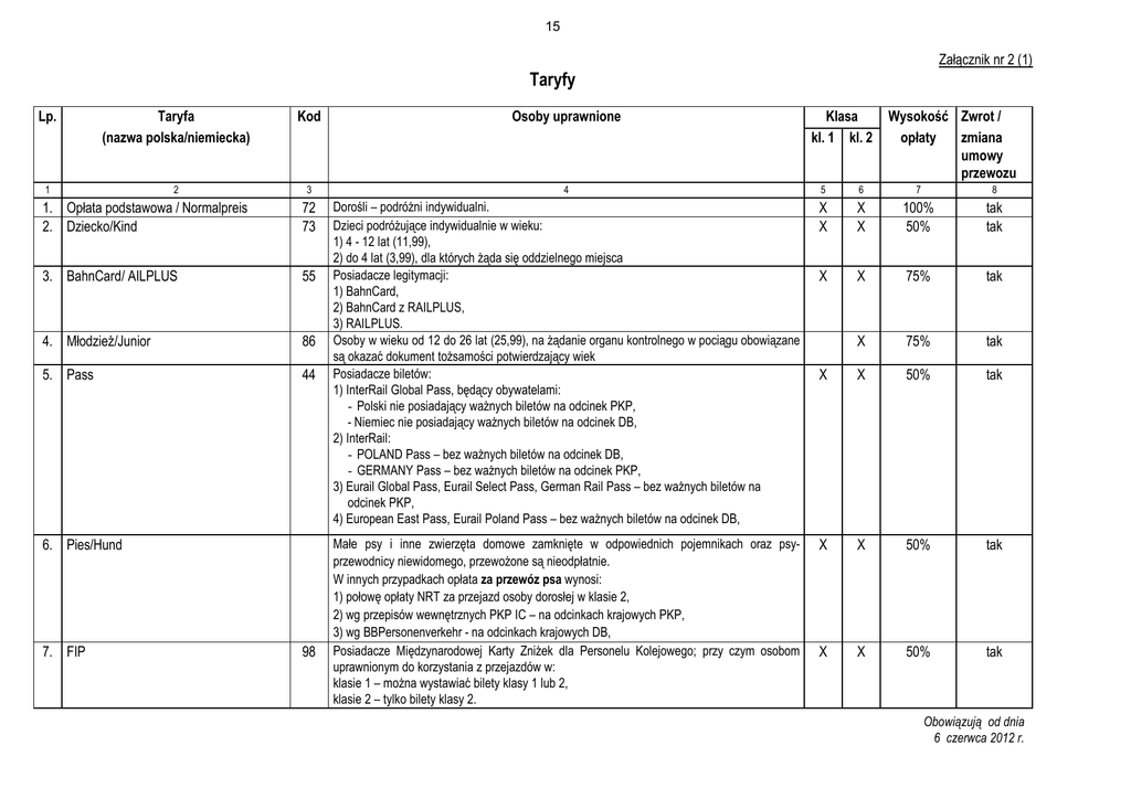 15 Załącznik nr 2 (1) Taryfy Lp. . Taryfa (nazwa polska/niemiecka) 1 2 Kod Osoby uprawnione Klasa kl. 1 kl. 2 Wysokość Zwrot / opłaty zmiana umowy przewozu 3 4 5 6 7 8 1. Opłata podstawowa / Normalpreis 2. Dziecko/Kind 72 73 X X X X 100% 50% tak tak 3. BahnCard/ AILPLUS 55 X X 75% tak 4. Młodzież/Junior 86 X 75% tak 5. Pass 44 Dorośli – podróżni indywidualni. Dzieci podróżujące indywidualnie w wieku: 1) 4 - 12 lat (11,99), 2) do 4 lat (3,99), dla których żąda się oddzielnego miejsca Posiadacze legitymacji: 1) BahnCard, 2) BahnCard z RAILPLUS, 3) RAILPLUS. Osoby w wieku od 12 do 26 lat (25,99), na żądanie organu kontrolnego w pociągu obowiązane są okazać dokument tożsamości potwierdzający wiek Posiadacze biletów: 1) InterRail Global Pass, będący obywatelami: - Polski nie posiadający ważnych biletów na odcinek PKP, - Niemiec nie posiadający ważnych biletów na odcinek DB, 2) InterRail: - POLAND Pass – bez ważnych biletów na odcinek DB, - GERMANY Pass – bez ważnych biletów na odcinek PKP, 3) Eurail Global Pass, Eurail Select Pass, German Rail Pass – bez ważnych biletów na odcinek PKP, 4) European East Pass, Eurail Poland Pass – bez ważnych biletów na odcinek DB, X X 50% tak Małe psy i inne zwierzęta domowe zamknięte w odpowiednich pojemnikach oraz psyprzewodnicy niewidomego, przewożone są nieodpłatnie. W innych przypadkach opłata za przewóz psa wynosi: 1) połowę opłaty NRT za przejazd osoby dorosłej w klasie 2, 2) wg przepisów wewnętrznych PKP IC – na odcinkach krajowych PKP, 3) wg BBPersonenverkehr - na odcinkach krajowych DB, Posiadacze Międzynarodowej Karty Zniżek dla Personelu Kolejowego; przy czym osobom uprawnionym do korzystania z przejazdów w: klasie 1 – można wystawiać bilety klasy 1 lub 2, klasie 2 – tylko bilety klasy 2. X X 50% tak X X 50% tak 6. Pies/Hund 7. FIP 98 Obowiązują od dnia 6 czerwca 2012 r. 16 Załącznik nr 2 (2) 1 8. 2 Bord Pass 3 90 4 Posiadacze biletów: 1) wg Sparpreis 25 Niemcy, w relacjach wykraczających na odcinku DB i PKP poza relacje kursowania odpowiednio pociągu BWE lub BGE, 2) InterRail Global Pass, będący obywatelami: - krajów innych niż Polska i Niemcy, - Polski posiadający ważne bilety na odcinek PKP wystawione wg przepisów wewnętrznych PKP IC, - Niemiec posiadający ważne bilety na odcinek DB wystawione wg BBP, 3) InterRail: - GERMANY Pass i POLAND Pass, - GERMANY Pass wraz z ważnymi biletami na odcinek PKP wystawionymi wg przepisów wewnętrznych PKP IC, - POLAND Pass wraz z ważnymi biletami na odcinek DB wystawionymi wg BBP, 4) Eurail Germany–Poland Pass, 5) Eurail Global Pass, Eurail Select Pass, German Rail Pass – z biletami na odc. PKP wystawionymi wg wewnętrznych przepisów PKP IC, 6) European East Pass, Eurail Poland Pass – z biletami na odc. DB wg BBP, 7) sieciowych (dotyczy również biletów sieciowych dla personelu kolejowego), ważnych na PKP i DB, 8) dokumentów FIP, tzn. Międzynarodowych Książeczek Biletowych dla Personelu Kolejowego (w przypadku personelu kolejowego niemieckiego i polskiego, podróżny jest obowiązany ponadto posiadać dokument przewozowy ważny na odcinku własnej kolei) oraz Międzynarodowych Biletów Bezpłatnych, 9) NRT wystawionych na DB, 10) NRT w relacjach wykraczających na odcinku DB i PKP poza relacje kursowania odpowiednio pociągu BWE lub BGE, wystawione przez PKP oraz koleje inne niż DB, „Bord Pass” wydaje się również: - przewodnikowi towarzyszącemu w podróży osobie niewidomej, - dzieciom w wieku do 12 lat podróżującym na całym odcinku przejazdu w towarzystwie przynajmniej jednego dorosłego (patrz również cz.I Sprzedaż na PKP, ust.9). 5 6 7 8 X X 4,00 € nie Obowiązują od dnia 6 czerwca 2012 r. 17 Załącznik nr 2 (3) 1 2 3 9. Grupa dorosłych / Gruppe Erwachsener 10 Grupa dzieci / Gruppe Kind 92 11. 94 RIT (taryfa stosowana tylko przy sprzedaży w Niemczech, bez wskazania wysokości opłaty na bilecie) 93 4 Osoby dorosłe podróżujące w grupie liczącej 6 - 48 (66) osób w klasie 2 i 6 - 18 osób w klasie 1 (patrz cz. I Sprzedaż na PKP, ust. 14), Dzieci podróżujące w grupie, zgodnie z postanowieniami SCIC-NRT (dwoje dzieci w grupie traktuje się jak jednego dorosłego). Klienci niemieckich biur podróży, na żądanie organu kontrolnego w pociągu – podczas przejazdu w kierunku „tam“ – oprócz biletu wg oferty BWE/BGE obowiązani są okazać dokument wystawiony na usługę „zakwaterowania w hotelu“. 5 6 7 8 X X 60% tak X X 30% tak X X 75% tak Obowiązują od dnia 6 czerwca 2012 r.