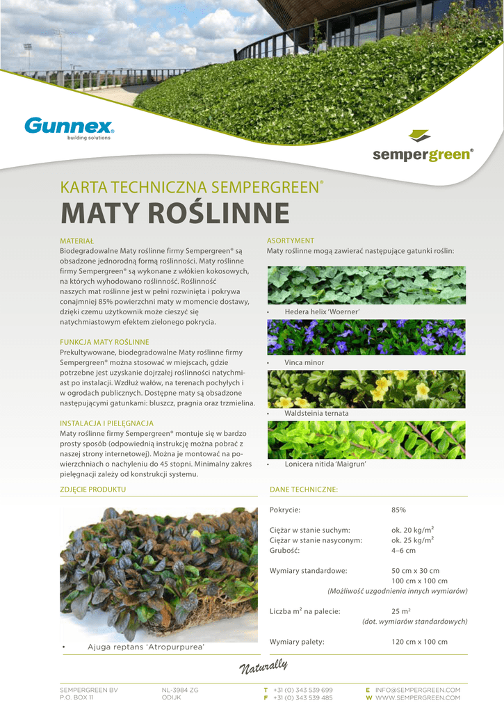 KARTA TECHNICZNA SEMPERGREEN® Maty roślinne Materiał Biodegradowalne Maty roślinne firmy Sempergreen® są obsadzone jednorodną formą roślinności. Maty roślinne firmy Sempergreen® są wykonane z włókien kokosowych, na których wyhodowano roślinność. Roślinność naszych mat roślinne jest w pełni rozwinięta i pokrywa conajmniej 85% powierzchni maty w momencie dostawy, dzięki czemu użytkownik może cieszyć się natychmiastowym efektem zielonego pokrycia. Funkcja Maty roślinne Prekultywowane, biodegradowalne Maty roślinne firmy Sempergreen® można stosować w miejscach, gdzie potrzebne jest uzyskanie dojrzałej roślinności natychmiast po instalacji. Wzdłuż wałów, na terenach pochyłych i w ogrodach publicznych. Dostępne maty są obsadzone następującymi gatunkami: bluszcz, pragnia oraz trzmielina. Instalacja i pielęgnacja Maty roślinne firmy Sempergreen® montuje się w bardzo prosty sposób (odpowiednią instrukcję można pobrać z naszej strony internetowej). Można je montować na powierzchniach o nachyleniu do 45 stopni. Minimalny zakres pielęgnacji zależy od konstrukcji systemu. Asortyment Maty roślinne mogą zawierać następujące gatunki roślin: • Hedera helix ‘Woerner’ • Vinca minor • Waldsteinia ternata • Lonicera nitida ‘Maigrun’ Dane techniczne: zdjęcie produktu Pokrycie:85% Ciężar w stanie suchym: Ciężar w stanie nasyconym: Grubość: ok. 20 kg/m² ok. 25 kg/m² 4–6 cm Wymiary standardowe: 50 cm x 30 cm 100 cm x 100 cm (Możliwość uzgodnienia innych wymiarów) Liczba m² na palecie: 25 m2 (dot. wymiarów standardowych) • Ajuga reptans ‘Atropurpurea’ Wymiary palety: 120 cm x 100 cm Naturally Sempergreen BV P.O. Box 11 NL-3984 ZG Odijk T +31 (0) 343 539 699 F +31 (0) 343 539 485 E [email protected] W www.sempergreen.com