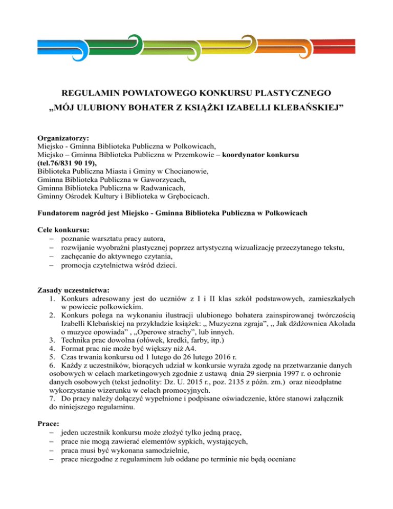 REGULAMIN POWIATOWEGO KONKURSU PLASTYCZNEGO „MÓJ ULUBIONY BOHATER Z KSIĄŻKI IZABELLI KLEBAŃSKIEJ” Organizatorzy: Miejsko - Gminna Biblioteka Publiczna w Polkowicach, Miejsko – Gminna Biblioteka Publiczna w Przemkowie – koordynator konkursu (tel.76/831 90 19), Biblioteka Publiczna Miasta i Gminy w Chocianowie, Gminna Biblioteka Publiczna w Gaworzycach, Gminna Biblioteka Publiczna w Radwanicach, Gminny Ośrodek Kultury i Biblioteka w Grębocicach. Fundatorem nagród jest Miejsko - Gminna Biblioteka Publiczna w Polkowicach Cele konkursu: poznanie warsztatu pracy autora, rozwijanie wyobraźni plastycznej poprzez artystyczną wizualizację przeczytanego tekstu, zachęcanie do aktywnego czytania, promocja czytelnictwa wśród dzieci. Zasady uczestnictwa: 1. Konkurs adresowany jest do uczniów z I i II klas szkół podstawowych, zamieszkałych w powiecie polkowickim. 2. Konkurs polega na wykonaniu ilustracji ulubionego bohatera zainspirowanej twórczością Izabelli Klebańskiej na przykładzie książek: „ Muzyczna zgraja”, „ Jak dżdżownica Akolada o muzyce opowiada” , „Operowe strachy”, lub innych. 3. Technika prac dowolna (ołówek, kredki, farby, itp.) 4. Format prac nie może być większy niż A4. 5. Czas trwania konkursu od 1 lutego do 26 lutego 2016 r. 6. Każdy z uczestników, biorących udział w konkursie wyraża zgodę na przetwarzanie danych osobowych w celach marketingowych zgodnie z ustawą dnia 29 sierpnia 1997 r. o ochronie danych osobowych (tekst jednolity: Dz. U. 2015 r., poz. 2135 z późn. zm.) oraz nieodpłatne wykorzystanie wizerunku w celach promocyjnych. 7. Do pracy należy dołączyć wypełnione i podpisane oświadczenie, które stanowi załącznik do niniejszego regulaminu. Prace: jeden uczestnik konkursu może złożyć tylko jedną pracę, prace nie mogą zawierać elementów sypkich, wystających, praca musi być wykonana samodzielnie, prace niezgodne z regulaminem lub oddane po terminie nie będą oceniane Prace należy dostarczyć osobiście lub wysłać do Miejsko – Gminnej Biblioteki Publicznej w Przemkowie pod adres: Miejsko – Gminna Biblioteka Publiczna ul. Plac Targowy 1a 59-170 Przemków do dnia 26.02.2016 r. - decyduje termin dostarczenia prac. WAŻNE: Na odwrocie prac należy umieścić dokładne informacje o autorze pracy: imię, nazwisko, wiek – klasa, adres oraz nr telefonu do kontaktu. Rozstrzygnięcie konkursu: Jury będzie oceniało uczestników pod kątem: pomysłowości prac, staranności wykonania pracy, ciekawej techniki wykonania, samodzielności wykonania przez uczestnika. O zajętych miejscach laureaci zostaną powiadomieni przez Koordynatora konkursu telefonicznie w dniu 29 lutego 2016 r. Nagrody: 1. Organizator zapewnia nagrody za zajęcie trzech pierwszych miejsc. 2. O podziale nagród ostatecznie decyduje jury konkursu. 3. Laureaci otrzymają nagrody ufundowane przez Miejsko – Gminną Bibliotekę Publiczną w Polkowicach. 4. Nagrody zostaną wręczone laureatom w bibliotekach powiatu polkowickiego podczas spotkań autorskich z panią Izabellą Klebańską, w dniach: 3 marca 2016 r. (czwartek) Radwanice (Gminna Biblioteka Publiczna, ul. Szkolna 10) godz. 8.30 – 9.30, Chocianów (filia w Parchowie, w Szkole Podstawowej) godz. 10.45 - 11.45, Przemków (Miejsko - Gminna Biblioteka Publiczna, u. Plac Targowy 1a) godz. 13.00 – 14.00, 4 marca 2016 r. (piątek) Grębocice (Gminny Ośrodek Kultury i Biblioteka, ul. Kościelna 21) godz. 9.00 -10.00, Gaworzyce (Gminna Biblioteka Publiczna, ul. Szkolna 211) godz. 11.15 - 12.15 Postanowienia ogólne: 1. Uczestnicy wyrażają zgodę na przetwarzanie danych osobowych na potrzeby konkursu (Ustawa z dnia 29 sierpnia 1997 r. o ochronie danych osobowych, tekst jednolity Dz. U. z 2015, poz. 2135 ze zm.). 2. Organizator zastrzega sobie prawo do publikacji danych osobowych oraz zdjęć uczestników konkursu. 3. Dostarczając prace na konkurs, każdy uczestnik przenosi autorskie prawa majątkowe na Organizatorów w następujących polach eksploatacji: wielokrotne eksponowanie prac, zamieszczanie fotografii prac w materiałach reklamowych i na stronach internetowych. 4. Wszelkie informacje dotyczące konkursu dostępne są pod nr telefonu: 76/ 831 90 19, lub w siedzibie Miejsko – Gminnej Biblioteki Publicznej w Przemkowie. 5. Po rozstrzygnięciu konkursu w M - GBP w Przemkowie zostanie zorganizowana wystawa pokonkursowa. Termin: marzec 2016 r. 6. Regulamin konkursu dostępny będzie w siedzibach bibliotek: Miejsko - Gminna Biblioteka Publiczna w Polkowicach, Miejsko – Gminna Biblioteka Publiczna w Przemkowie, Biblioteka Publiczna Miasta i Gminy w Chocianowie, Gminna Biblioteka Publiczna w Gaworzycach, Gminna Biblioteka Publiczna w Radwanicach, Gminny Ośrodek Kultury i Biblioteka w Grębocicach, oraz na stronach internetowych oraz stronach Fanpage bibliotek powiatu polkowickiego: www.mgbp.pl www.chocianow.pl www.gaworzyce.com.pl www.facebook.com/gbpradwanice?ref=hl www.grebocickie.pl Załącznik: - wzór oświadczenia o udostępnienie danych osobowych