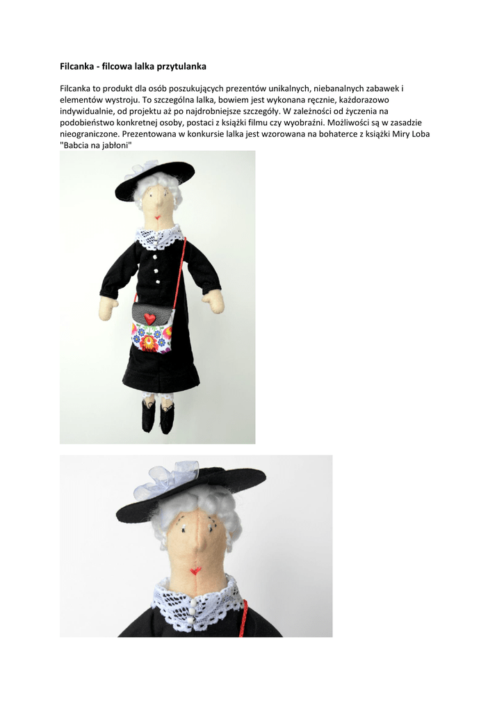 Filcanka - filcowa lalka przytulanka Filcanka to produkt dla osób poszukujących prezentów unikalnych, niebanalnych zabawek i elementów wystroju. To szczególna lalka, bowiem jest wykonana ręcznie, każdorazowo indywidualnie, od projektu aż po najdrobniejsze szczegóły. W zależności od życzenia na podobieństwo konkretnej osoby, postaci z książki filmu czy wyobraźni. Możliwości są w zasadzie nieograniczone. Prezentowana w konkursie lalka jest wzorowana na bohaterce z książki Miry Loba "Babcia na jabłoni"