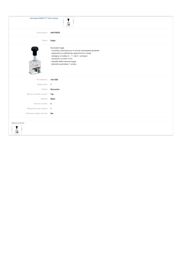 Numerator EAGLE TY 102-6 cyfrowy Kod produktu: Marka: stk0150025 Eagle Numerator Eagle - numerator automatyczny w mocnej niezawodnej obudowie - wyposażony w plastikowy ergonomiczny uchwyt - dostępny w modelu 6- , 7-, lub 8 - cyfrowym - wysokość czcionki 4 mm - posiada wkład samotuszujący - jednostka sprzedaży 1 sztuka Kod dostawcy: Opakowanie: Rodzaj: Wymienny wkład z tuszem: Materiał: 1 Numerator Tak Metal Rozmiar czcionki: 4 Maksymalna ilośc wierszy: 1 Dołączony zestaw czcionek: Zdjęcia produktu 140-1009 Nie