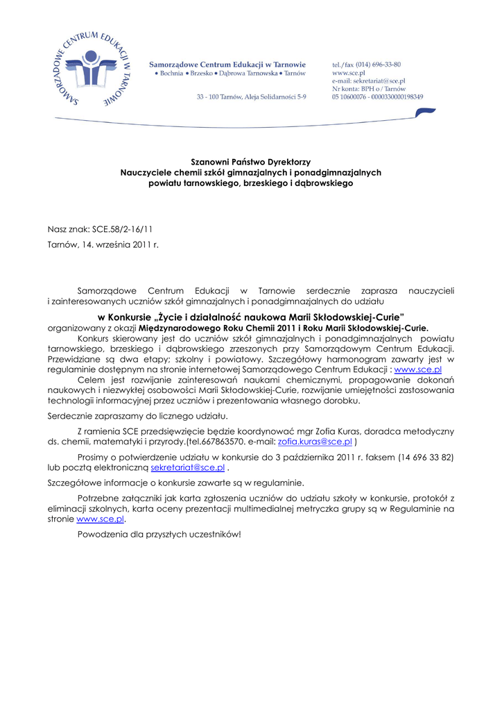 Szanowni Państwo Dyrektorzy Nauczyciele chemii szkół gimnazjalnych i ponadgimnazjalnych powiatu tarnowskiego, brzeskiego i dąbrowskiego Nasz znak: SCE.58/2-16/11 Tarnów, 14. września 2011 r. Samorządowe Centrum Edukacji w Tarnowie serdecznie zaprasza i zainteresowanych uczniów szkół gimnazjalnych i ponadgimnazjalnych do udziału nauczycieli w Konkursie „Życie i działalność naukowa Marii Skłodowskiej-Curie” organizowany z okazji Międzynarodowego Roku Chemii 2011 i Roku Marii Skłodowskiej-Curie. Konkurs skierowany jest do uczniów szkół gimnazjalnych i ponadgimnazjalnych powiatu tarnowskiego, brzeskiego i dąbrowskiego zrzeszonych przy Samorządowym Centrum Edukacji. Przewidziane są dwa etapy; szkolny i powiatowy. Szczegółowy harmonogram zawarty jest w regulaminie dostępnym na stronie internetowej Samorządowego Centrum Edukacji : www.sce.pl Celem jest rozwijanie zainteresowań naukami chemicznymi, propagowanie dokonań naukowych i niezwykłej osobowości Marii Skłodowskiej-Curie, rozwijanie umiejętności zastosowania technologii informacyjnej przez uczniów i prezentowania własnego dorobku. Serdecznie zapraszamy do licznego udziału. Z ramienia SCE przedsięwzięcie będzie koordynować mgr Zofia Kuras, doradca metodyczny ds. chemii, matematyki i przyrody.(tel.667863570. e-mail: [email protected] ) Prosimy o potwierdzenie udziału w konkursie do 3 października 2011 r. faksem (14 696 33 82) lub pocztą elektroniczną [email protected] . Szczegółowe informacje o konkursie zawarte są w regulaminie. Potrzebne załączniki jak karta zgłoszenia uczniów do udziału szkoły w konkursie, protokół z eliminacji szkolnych, karta oceny prezentacji multimedialnej metryczka grupy są w Regulaminie na stronie www.sce.pl. Powodzenia dla przyszłych uczestników! Nasz znak: SCE. 58/2-16/11 Tarnów, 14września 2011 r. REGULAMIN Konkursu dla uczniów gimnazjów i szkół ponadgimnazjalnych „Życie i działalność naukowa Marii Skłodowskiej-Curie” z okazji Międzynarodowego Roku Chemii 2011 i Roku Marii Skłodowskiej-Curie. 1. Organizatorzy: a) Samorządowe Centrum Edukacji w Tarnowie, odpowiedzialna (tel. 667 863 570 ) b) Wydział Edukacji Starostwa Powiatowego w Tarnowie. c) Wydział Edukacji Starostwa Powiatowego w Brzesku. Zofia Kuras 2. Cele konkursu: a) Rozwijanie zainteresowań naukami chemicznymi. b) Propagowanie dokonań naukowych i niezwykłej osobowości Marii Skłodowskiej-Curie. c) Rozwijanie umiejętności zastosowania technologii informacyjnej przez uczniów. d) Rozwijanie umiejętności prezentowania własnego wytworu. 3. Tematyka konkursu i zakres wymaganej wiedzy: a) Znajomość życiorysu Marii Skłodowskiej-Curie. b) Działalność naukowa Marii Skłodowskiej-Curie. c) Umiejętność wykonania prezentacji w programie PowerPoint. Przedmiotem konkursu jest: a) wykonanie prezentacji multimedialnej przez 3 osobowe zespoły uczniowskie n/t „Życie i działalność naukowa Marii Skłodowskiej-Curie” oraz jej b) publiczne zaprezentowanie przed Jury Konkursu w składzie: doradca metodyczny, nauczyciel chemii (3 osoby), nauczyciel informatyki. c) Ustne odpowiedzi na 3 wylosowane pytania z zakresu wiadomości określone regulaminem. Etap szkolny w kategorii gimnazjum i szkoła ponadgimnazjalna.) a) Umiejętności tworzenia prezentacji w PowerPoint. b) Poszukiwanie informacji na temat życia i działalności Skłodowskiej-Curie w dowolnych źródłach informacji. naukowej Marii Etap Międzypowiatowy: Dla gimnazjum. a) Publiczna prezentacja wykonanego zadania. Ponadto z treści podstawy programowej III etapu kształcenia: b) Wiedza na temat budowy atomu (jądro, protony, elektrony, neutrony, liczba masowa, liczba atomowa, masa atomowa) c) Co to jest promieniotwórczość? d) Izotopy wodoru. e) Zastosowanie izotopów. Etap Międzypowiatowy: Dla szkół ponadgimnazjalnych. a) Publiczna prezentacja wykonanego zadania. Ponadto z treści z podstawy programowej IV etapu kształcenia zakres podstawowy: b) Promieniotwórczość naturalna i sztuczna (równania przemian jądrowych). c) Przemiany : alfa, beta, gamma. d) Okres półtrwania. e) Zastosowania izotopów promieniotwórczych. f) Datowanie węglem C-14. g) Skład procentowy izotopów. h) Liczba atomowa i masowa, nuklid , nukleony(protony i neutrony) - skład jądra atomowego. i) Promieniowanie jonizujące. j) Dawki promieniowania i ich jednostki. k) Reaktor jądrowy i jego funkcje, reakcje jądrowe.(zakres podstawowy) 4. Zasady udziału w konkursie: a) Udział uczniów w konkursie jest dobrowolny. b) W etapie szkolnym bierze udział dowolna liczba grup uczniowskich. c) W etapie międzypowiatowym, uczniowie którzy uzyskali najwięcej punktów za wykonaną prezentację multimedialną. 5. Warunki które powinna spełniać prezentacja multimedialna. a) 10 – 15 slajdów ponumerowane z wstawioną stałą datą i nazwą grupy w stopce (nazwa grupy na potrzeby konkursu np.”Sportowcy”) b) Pod każdym slajdem notatki na temat źródła informacji. c) Przynajmniej wstawiony 1 film i 1 dźwięk. d) Przynajmniej 2 niestandardowe animacje. e) Prezentacja powinna być zapisana jako prezentacja programu PowerPoint na płycie CD wraz z informacją n/t grupy uczniów z danej szkoły w pliku Word (wzór w załączniku – metryczka grupy) 6. Przebieg konkursu: I etap – szkolny a) Szkoła zgłasza swój udział konkursie do dnia – 3. października 2011 r. elektronicznie na adres e-mailowy [email protected] lub fax: 14 696 33 82 b) Uczniowie wykonują prezentację multimedialną na zadany temat do dnia 10. listopada 2011 r. c) Szkolna Komisja Konkursowa powołana przez Dyrektora Szkol wybiera jedną lub dwie najlepsze prezentacje i wraz z protokołem z eliminacji szkolnych wysyła do Samorządowego Centrum Edukacji (Al. Solidarności 5-9, 33-100 Tarnów) do dnia– 17 listopada 2011 r. II etap – finał a) Ocena prac uczniowskich przez Międzypowiatową Komisję Konkursową powołaną przez Dyrektora Samorządoweg