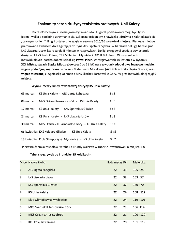 Znakomity sezon drużyny tenisistów stołowych Unii Kalety Po zeszłorocznym sukcesie jakim był awans do III ligi cel podstawowy mógł być tylko jeden - walka o spokojne utrzymanie się. Cel został osiągnięty z nawiązką , drużyna z Kalet okazała się „czarnym koniem” III ligi i ostatecznie zajęła w sezonie 2015/16 wysokie 4 miejsce. Pierwsze miejsce premiowane awansem do II ligi zajęła drużyna ATS Ligota Łabędzka. W barażach o II ligę będzie grać LKS Liswarta Lisów, która zajęła II miejsce w rozgrywkach. Do ligi okręgowej spadają trzy ostatnie drużyny: ULKS Ruch Pniów, TRS Millenium Myszków i AKS II Mikołów. W rozgrywkach indywidualnych bardzo dobrze spisał się Paweł Piech. W rozgrywanych 10 kwietnia w Bytomiu XXI Mistrzostwach Śląska Młodzieżowców ( do 21 lat) nasz zawodnik zdobył dwa brązowe medale: w grze podwójnej mężczyzn w parze z Mateuszem Misiakiem (AZS Politechnika Śląska Gliwice) oraz w grze mieszanej z Agnieszką Ochman z MKS Skarbek Tarnowskie Góry. W grze indywidualnej zajął 9 miejsce. Wyniki meczy rundy rewanżowej drużyny KS Unia Kalety: 03 marca: KS Unia Kalety - ATS Ligota Łabędzka 2:8 09 marca: MKS Orkan Chruszczobród - KS Unia Kalety 4:6 17 marca: KS Unia Kalety - SKS Spartakus Gliwice 3:7 24 marca: KS Unia Kalety - LKS Liswarta Lisów 1:9 30 marca: MKS Skarbek II Tarnowskie Góry - KS Unia Kalety 9:1 06 kwietnia: KKS Kolejarz Gliwice - KS Unia Kalety 5:5 13 kwietnia: Klub Olimpijczyka Mysłowice - KS Unia Kalety 3:7 Pierwsza ósemka zespołów w tabeli z I rundy walczyła w rundzie rewanżowej o miejsca 1-8. Tabela rozgrywek po I rundzie (15 kolejkach): M-ce Nazwa klubu Ilość meczy Pkt. Małe pkt. 1 ATS Ligota Łabędzka 22 43 195 : 25 2 LKS Liswarta Lisów 22 38 163 : 57 3 SKS Spartakus Gliwice 22 37 150 : 70 4 KS Unia Kalety 22 24 108 : 112 5 Klub Olimpijczyka Mysłowice 22 24 119 : 101 6 MKS Skarbek II Tarnowskie Góry 22 23 106 :114 7 MKS Orkan Chruszczobród 22 21 100 : 120 8 KKS Kolejarz Gliwice 22 20 101 : 119 9 MKS Skarbek III Tarnowskie Góry 22 26 113 : 107 10 LKS Strażak Mikołów 22 24 112 : 108 11 UKS Wolej Ruda Śląska 22 22 119 : 101 12 KU AZS UŚ Katowice 22 22 117 : 103 13 UKS Huragan II Sosnowiec 22 10 62 : 158 14 ULKS Ruch Pniów 22 8 70 : 150 15 TRS Millenium Myszków 22 6 64 : 156 16 AKS II Mikołów 22 4 61 : 159 Drużyna Unii Kalety ma tą sama ilość pkt co Klub Olimpijczyka Mysłowice - 24 pkt, więc zgodnie z regulaminem rozgrywek o kolejności w tabeli zdecydowały bezpośrednie mecze miedzy nimi, obydwa wygrane przez Unię 6 : 4 i 7 :3 Wyniki indywidualne zawodników w całym sezonie 2015/16: Paweł Piech – 42 rozegrane mecze: 28 zwycięstw, 14 porażek (skuteczność: 66,7%) Jakub Michalski –44 mecze: 24 zw, 20 por (54,5%) Krystian Mnich – 41 meczy: 17 zw,24 por (41,5%) Antoni Jeż – 21 meczy: 9 zw, 12 por (42,9%) Mateusz Piech – 27 meczy: 6 zw, 21 por (22,2%) Paweł Jonik – 1 mecz: 1 por.