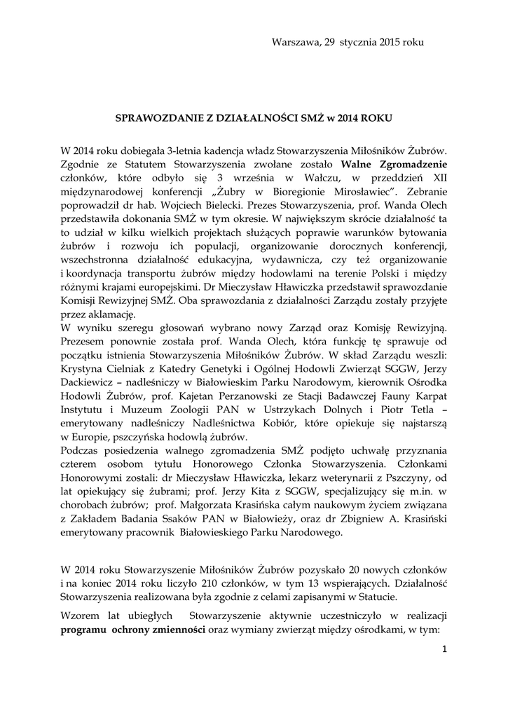 Warszawa, 29 stycznia 2015 roku SPRAWOZDANIE Z DZIAŁALNOŚCI SMŻ w 2014 ROKU W 2014 roku dobiegała 3-letnia kadencja władz Stowarzyszenia Miłośników Żubrów. Zgodnie ze Statutem Stowarzyszenia zwołane zostało Walne Zgromadzenie członków, które odbyło się 3 września w Wałczu, w przeddzień XII międzynarodowej konferencji „Żubry w Bioregionie Mirosławiec”. Zebranie poprowadził dr hab. Wojciech Bielecki. Prezes Stowarzyszenia, prof. Wanda Olech przedstawiła dokonania SMŻ w tym okresie. W największym skrócie działalność ta to udział w kilku wielkich projektach służących poprawie warunków bytowania żubrów i rozwoju ich populacji, organizowanie dorocznych konferencji, wszechstronna działalność edukacyjna, wydawnicza, czy też organizowanie i koordynacja transportu żubrów między hodowlami na terenie Polski i między różnymi krajami europejskimi. Dr Mieczysław Hławiczka przedstawił sprawozdanie Komisji Rewizyjnej SMŻ. Oba sprawozdania z działalności Zarządu zostały przyjęte przez aklamację. W wyniku szeregu głosowań wybrano nowy Zarząd oraz Komisję Rewizyjną. Prezesem ponownie została prof. Wanda Olech, która funkcję tę sprawuje od początku istnienia Stowarzyszenia Miłośników Żubrów. W skład Zarządu weszli: Krystyna Cielniak z Katedry Genetyki i Ogólnej Hodowli Zwierząt SGGW, Jerzy Dackiewicz – nadleśniczy w Białowieskim Parku Narodowym, kierownik Ośrodka Hodowli Żubrów, prof. Kajetan Perzanowski ze Stacji Badawczej Fauny Karpat Instytutu i Muzeum Zoologii PAN w Ustrzykach Dolnych i Piotr Tetla – emerytowany nadleśniczy Nadleśnictwa Kobiór, które opiekuje się najstarszą w Europie, pszczyńska hodowlą żubrów. Podczas posiedzenia walnego zgromadzenia SMŻ podjęto uchwałę przyznania czterem osobom tytułu Honorowego Członka Stowarzyszenia. Członkami Honorowymi zostali: dr Mieczysław Hławiczka, lekarz weterynarii z Pszczyny, od lat opiekujący się żubrami; prof. Jerzy Kita z SGGW, specjalizujący się m.in. w chorobach żubrów; prof. Małgorzata Krasińska całym naukowym życiem związana z Zakładem Badania Ssaków PAN w Białowieży, oraz dr Zbigniew A. Krasiński emerytowany pracownik Białowieskiego Parku Narodowego. W 2014 roku Stowarzyszenie Miłośników Żubrów pozyskało 20 nowych członków i na koniec 2014 roku liczyło 210 członków, w tym 13 wspierających. Działalność Stowarzyszenia realizowana była zgodnie z celami zapisanymi w Statucie. Wzorem lat ubiegłych Stowarzyszenie aktywnie uczestniczyło w realizacji programu ochrony zmienności oraz wymiany zwierząt między ośrodkami, w tym: 1 - 27 marca do nowej zagrody pokazowej w Jabłonowie, w woj. zachodniopomorskim, przyjechały z Gołuchowa 4 młode żubry: dwuletnie krowy Polesia i Polonka oraz dwa byki – trzyletni Polasek i roczny Popłoch. W dwa dni później dołączyły do nich dwie samice z Pszczyny: czteroletnia Potynka i trzyletnia Pordawa oraz dwa roczne samce Pomelo II i Platan II. Samce zostały wypuszczone na wolność a w zagrodzie zostały cztery samice i cielę urodzone w Jabłonowie – razem 5 żubrów. - 20 maja wypuszczono do zagrody Libeň w Novym Strašeci w Czechach cztery żubry z Polski: 3 krowy – Polena, Poranna III i Poldawska, wszystkie urodzone w 2011 r. Pochodzą z Ośrodka Hodowli Żubrów w Niepołomicach. Czwartym osobnikiem był samiec – pięcioletni Pokrop – z Pszczyny. Przed wyjazdem wszystkie zwierzęta zostały dokładnie przebadane i wystawiono im europejskie świadectwo zdrowia. Zarówno załadunek żubrów, jak i transport przebiegły bez żadnych komplikacji. Nowe miejsce żubry szybko zaakceptowały. Zagroda Libeň ma 113 ha powierzchni, w większości jest to obszar zalesiony ale jest także woda i łąki. - W listopadzie do zagrody aklimatyzacyjnej w Woli Michowej w Nadleśnictwie Komańcza przywieziono ze szwedzkiej hodowli Eriksberg trzy młode żubrzyce (urodzone w 2010 r.) o imionach Entre, Energi i Endora. Po miesięcznej kwarantannie zostały wypuszczone na wolność, by wzbogacić pulę genową wolnej populacji żubrów w Bieszczadach, liczącą ok. 270 osobników. Żubrzyce mają wszczepione mikroczipy oraz zaopatrzone zostały w obroże telemetryczne. - W grudniu do zagrody aklimatyzacyjnej w Woli Michowej w Bieszczadach przetransportowano 2,5-letniego byka - Pukom. Przyjechał z zagrody pokazowej w Mucznem w Nadleśnictwie Stuposiany (które transport zorganizowało). Byk ma połączyć się z wcześniej przywiezionymi szwedzkimi krowami. W ramach współpracy z hodowcami zagranicznymi - W styczniu Stowarzyszenie Miłośników Żubrów podpisało umowę o współpracy z czeską organizacją ochrony przyrody Česka Krajina. Współpraca będzie polegała na pomocy naszym południowym sąsiadom w realizacji programu reintrodukcji żubrów. Wybrano teren poligonu, na którym ma w przyszłości zamieszkać stado wolnościowe. SMŻ zobowiązało się do wybrania osobników, które zapoczątkują hodowlę, następnie będzie służyć daleko idącym doradztwem w sprawach dotyczących reintrodukcji, hodowli i opieki weterynaryjnej, dostarczy też wszelkiego typu analizy rodowodowe nt. żubrów oraz materiały edukacyjne. Česka Krajina zobowiązuje się do realizacji Strategii Ochrony Żubra (IUCN; Status Survey and Conservation Action Plan), współpracy z SMŻ i podejmowania działalności edukacyjnej w zakresie ochrony żubra. Hodowla wolnościowa ma rozpocząć się od 5 osobników. - 14 lutego prof. Wanda Olech i dr Zuza Nowak wzięły udział w spotkaniu hodowców żubrów z południowych Niemiec, okręgu będącego pod opieką Regionalnego Biura EBCC w Donaumoos. Przyjechali także hodowcy z Austrii 2 i Szwajcarii. Mówiono o aktualnej sytuacji żubrów, organizacji hodowli, ale tematem wiodącym było prowadzenie monitoringu genetycznego i pobieranie prób do analiz. Profesor Wanda Olech, współprowadząca spotkanie, przedstawiła prace i zadania EBCC, natomia