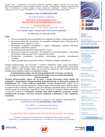 Wydział Nauk o Wychowaniu Uniwersytetu Łódzkiego organizuje bezpłatne szkolenia dla osób spoza społeczności akademickiej w ramach projektu „Edukacja – Regiony – Regionalizacja: Program rozwoju Wydziału Nauk o Wychowaniu w ramach strategii rozwoju Uniwersytetu Łódzkiego”, w ramach Priorytetu IV: „Szkolnictwo wyŜsze i nauka”, Poddziałania 4.1.1: „Wzmocnienie potencjału dydaktycznego uczelni”. SERDECZNIE ZAPRASZAMY do wzięcia udziału w szkoleniu TRENING INTERPERSONANY / KOMUNIKACJI INTERPERSONALNEJ I kwartał 2010 roku I dzień, godz. 10.00 – 17.00; II dzień, godz. 9.00 – 16.00 Na Wydziale Nauk o Wychowaniu Uniwersytetu Łódzkiego 91-408 Łódź, ul. Pomorska 46/48 Cele: • Wzrost zrozumienia przez uczestników ich wzajemnych relacji i sytuacji grupowych; • Stwarzanie okazji dla uczestników do wyraŜania osobistych treści dotyczących ich funkcjonowania w grupie i w Ŝyciu; • Rozwijanie wzajemnej komunikacji w grupie, obejmującej wymianę informacji zwrotnych i udzielenie wsparcia; • Koncentracja na komunikacji dotyczącej Tu i Teraz ; • Stworzenie okazji dla uczestników do dzielenia się doświadczeniami i wraŜeniami dotyczących sytuacji grupowych i wzajemnych relacji; • Zwiększenie zrozumienia uczestników dotyczącego procesów zachodzących w grupie; • Nauka posługiwania się językiem uczuć w kontakcie z drugim człowiekiem. Trening interpersonalny jest procesem, w którym członkowie grupy mogą doświadczyć swoich reakcji na zachowania innych członków grupy oraz na niedyrektywne zachowanie trenera. Główna część treningu opiera się na procesie grupowym, jaki zachodzi podczas dwudniowego spotkania między uczestnikami treningu. Trening interpersonalny nie jest formą szkolenia lub warsztatu, na którym przekazywana jest wiedza teoretyczna lub odgrywane są scenki komunikacji interpersonalnej. Trening interpersonalny opiera się na pracy z grupą dotyczącej relacji między jej członkami i komunikacji interpersonalnej skoncentrowanej na procesach grupowych zachodzących Tu i Teraz (podczas spotkania). Trening interpersonalny opiera się na 5 siłach tworzących dynamikę grupową: zdolność grupy do tworzenia więzi, zdolność grupy do kontrolowania zachowań, zdolność grupy do wspólnego określenia obrazu rzeczywistości, zdolność grupy do wzbudzania i łagodzenia uczuć, zdolność do tworzenia układu odniesienia i porównań osobistych. Członkowie treningu będą mieli moŜliwość „poczucia” etapów kształtowania się grupy, czyli fazy otwarcia, adaptacji, wchodzenia w role, współpracy i rozstania. OSOBY ZAINTERESOWANE PROSIMY O PRZESŁANIE KARTY ZGŁOSZENIA NAJPÓŹNIEJ DO 9 PAŹDZIERNIKA 2009 ROKU NA ADRES: [email protected] EDUAKCJA REGIONY REGIONALIZACJIA Program Rozwoju Wydziału Nauk o Wychowaniu w ramach strategii rozwoju Uniwersytetu Łódzkiego www.err.uni.lodz.pl Biuro realizacji projektu: UNIWERSYTET ŁÓDZKI WYDZIAŁ NAUK O WYCHOWANIU 91 – 408 Łódź, ul. Pomorska 46/48 +48 42 665 50 24 +48 42 665 50 25 Kierownik projektu: dr Marek Kulesza [email protected] Sekretariat: Karolina Frąckiewicz [email protected] Dział finansowy: [email protected] Dział personalny: Ewa Mlostoń [email protected] Monitoring i sprawozdawczość: Łukasz Kruszewski [email protected] Szkolenia: Marzena Bort-Szczepkowska Monika Chmielecka [email protected] Sekretariat studiów: [email protected] LUB FAXEM NA NR (042) 665-50-70 Zamówienia publiczne: [email protected] O UCZESTNICTWIE W SZKOLENIU DECYDUJE KOLEJNOŚĆ ZGŁOSZEŃ Ewaluacja: [email protected] Z osobami przyjętymi skontaktujemy się drogą telefoniczną lub mailową i poprosimy o uzupełnienie kwestionariuszy i oświadczeń o przystąpieniu do projektu. Projekt współfinansowany ze środków Unii Europejskiej w ramach Europejskiego Funduszu Społecznego