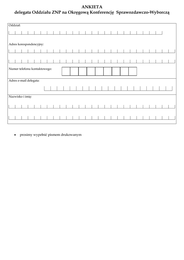 ANKIETA delegata Oddziału ZNP na Okręgową Konferencję Sprawozdawczo-Wyborczą Oddział: Adres korespondencyjny: Numer telefonu kontaktowego: Adres e-mail delegata: Nazwisko i imię: prosimy wypełnić pismem drukowanym