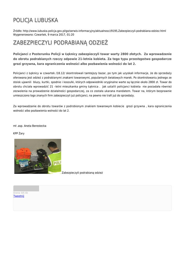 POLICJA LUBUSKA Źródło: http://www.lubuska.policja.gov.pl/go/serwis-informacyjny/aktualnosci/9195,Zabezpieczyli-podrabiana-odziez.html Wygenerowano: Czwartek, 9 marca 2017, 01:20 ZABEZPIECZYLI PODRABIANĄ ODZIEŻ Policjanci z Posterunku Policji w Łęknicy zabezpieczyli towar warty 2800 złotych. Za wprowadzenie do obrotu podrabianych rzeczy odpowie 21-letnia kobieta. Za tego typu przestępstwo gospodarcze grozi grzywna, kara ograniczenia wolności albo pozbawienia wolności do lat 2. Policjanci z Łęknicy w czwartek /18.12/ skontrolowali tamtejszy bazar, po tym jak uzyskali informacje, że do sprzedaży oferowana jest odzież z podrabianymi znakami towarowymi, popularnych światowych marek. Po skontrolowaniu jednego ze stoisk ujawnili bluzy, kurtki, spodnie i koszulki, których odpowiedniki oryginalne warte są łącznie około 2800 zł. Towar do obrotu chciała wprowadzić 21 –letni mieszkanka gminy Łęknica . Jak ustalili policjanci kobieta nie posiadała również zezwolenia na prowadzenie działalności gospodarczej, za co została ukarana mandatem. Towar na, którym bezprawnie umieszczono logo znanych firm zabezpieczyli już policjanci, na pewno nie trafi już do sprzedaży. Za wprowadzanie do obrotu towarów z podrobionym znakiem towarowym kobiecie grozi grzywna , kara ograniczenia wolności albo pozbawienia wolności do lat 2. mł .asp. Aneta Berestecka KPP Żary Zabezpieczyli podrabianą odzież Ocena: 0/5 (0) Tweetnij