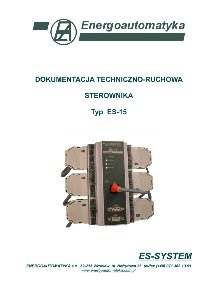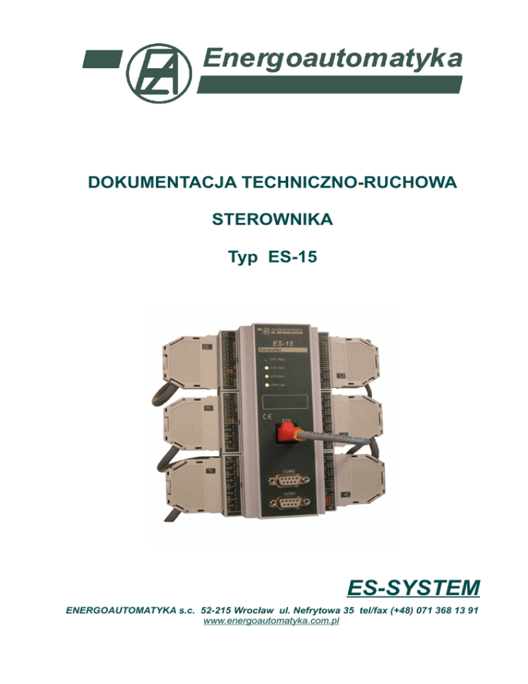DOKUMENTACJA TECHNICZNO-RUCHOWA STEROWNIKA Typ ES-15 ES-SYSTEM ENERGOAUTOMATYKA s.c. 52-215 Wrocław ul. Nefrytowa 35 tel/fax (+48) 071 368 13 91 www.energoautomatyka.com.pl DTR Sterownik ES-15 2 12 1. ZASTOSOWANIE Sterownik ES-15 jest elementem systemu ES-SYSTEM. Jest uniwersalnym sterownikiem mikroprocesorowym przeznaczonym do zadań sterowniczo - regulacyjnych o algorytmie ustalanym przez zapisanie programu użytkowego do pamięci sterownika. Sterownik posiada: 8 wejść analogowych, 16 wejść dwustanowych, 3 wejścia impulsowe, 6 wyjść analogowych, 12 wyjść dwustanowych, 2 kanały RS oraz łącze sieciowe ETHERNET IEEE802.3 Sterownik poprzez kanały RS może na poziomie procesowym wymieniać informacje z innymi sterownikami lub koncentratorami danych. Zapis programu użytkowego, zmiany programu i nastaw oraz bieżący podgląd działania sterownika odbywa się poprzez łącze szeregowe lub sieć ze standardowego komputera osobistego. Sterownik udostępnia zmienne analogowe i dwustanowe w dwóch sieciach komunikacyjnych COM1 i COM2 (RS-485 lub RS-422). Dane udostępniane są w standardzie MODBUS – RTU. 2. DANE O KOMPLETNOŚCI Razem ze sterownikiem dostarcza się: - Kartę gwarancyjną - Świadectwo kontroli jakości Do każdej partii sterowników dostarcza się: - Dokumentację Techniczno-Ruchową ES-15 - Kabel serwisowy RS-232 - tylko wtedy gdy został podany w zamówieniu. 3. OPIS TECHNICZNY 3.1. DANE TECHNICZNE 3.1.1. Zasilanie 3.1.2. Wejścia analogowe XA - ilość wejść - nominalny zakres sygnałów wejściowych - rozdzielczość przetwarzania A/C - dokładność przetwarzania wejść - błędy dodatkowe przetwarzania (w tym temperatura otoczenia) - maksymalny spadek napięcia w obwodzie wejścia - separacja galwaniczna między wejściami i od części centralnej sterownika: - - wytrzymałość elektryczna - - oporność izolacji 21 ÷ 27 VDC / 0.2A max 4 lub 8 4 ÷ 20 mA 12 bitów 0,1 % +/- 0,1 % zakresu 3V 500 V / 50 Hz / 1min ≥ 20 MΩ 3.1.3. Wejścia dwustanowe XB - ilość wejść 16 - napięcie zasilania inicjatorów (zewnętrzne) 19 ÷ 30 V - prąd przez zamknięty obwód inicjatora 4 ÷ 7 mA - separacja galwaniczna między grupami wejść po 8 i od części centralnej sterownika - - wytrzymałość elektryczna 500 V / 50Hz / 1min - - oporność izolacji ≥ 20 MΩ 3.1.4. Wejścia impulsowe XBI - ilość wejść - rodzaj wejść (ustalany zworami wg zamówienia) - parametry sygnału napięciowego - - poziom wysoki - - poziom niski 3 prądowe lub napięciowe > 15 V < 4,5 V DTR Sterownik ES-15 3 12 -parametry sygnału prądowego - - poziom wysoki - - poziom niski - separacja galwaniczna między wejściami i od części centralnej sterownika: - - wytrzymałość elektryczna - - oporność izolacji 3.1.5. Wyjścia dwustanowe YB - ilość wyjść - rodzaj wyjść - poziomy sygnałów wyjściowych - - rezystancja przy załączeniu - - maksymalne napięcie na wyjściu przy wyłączeniu - - obciążalność prądowa wyjść - separacja galwaniczna między wyjściami i od części centralnej sterownika: - - wytrzymałość elektryczna - - oporność izolacji 3.1.6. Wyjścia analogowe YA - ilość wyjść - nominalny zakres sygnałów wyjściowych - rozdzielczość przetwarzania C/A - dokładność przetwarzania wyjść - błędy dodatkowe przetwarzania (w tym temperatura otoczenia) - maksymalne obciążenie każdego z wyjść -separacja galwaniczna od części centralnej sterownika: - - wytrzymałość elektryczna - - oporność izolacji 3.1.7. Łącze sieciowe ETH: kanał transmisji sieciowej - ETHERNET IEEE 802.3 10BASE-T - procesor sieciowy - - prędkość transmisji - separacja galwaniczna od części centralnej sterownika: - - wytrzymałość elektryczna - - oporność izolacji > 12 mA < 7 mA 500 V / 50 Hz / 1min ≥ 20 MΩ 12 uniwersalne AC/DC ≤ 24 Ω 300 V ≤ 100 mA 500 V / 50 Hz / 1min ≥ 20 MΩ 3 lub 6 0 ÷ 2,5 V 12 bitów 0,1 % +/- 0,1 % zakresu 500 Ω 500 V / 50 Hz / 1min ≥ 20 MΩ CS8900A firmy CIRRUS LOGIC 10 Mbodów 2000 V (RMS) ≥ 20 MΩ 3.1.8. Łącza szeregowe COM1, COM2: - ilość łączy szeregowych 2 - typ łącza RS 422, RS-485 lub RS-232 bez możliwości jednoczesnego nadawania i odbioru, - maksymalna szybkość transmisji 115200 bit/s (BPS) - długość znaku 8 bit - kontrola parzystości parzystość - separacja galwaniczna między łączami i od pozostałych obwodów sterownika - - wytrzymałość elektryczna 500 V / 50 Hz / 1min - - oporność izolacji ≥ 20 MΩ - protokóły komunikacyjne: COM1 - MODBUS-RTU –SLAVE oraz protokół specjalny z oprogramowaniem narzędziowym COM2 - MODBUS-RTU – MASTER lub MODBUS-RTU-SLAVE oraz protokół specjalny z oprogramowaniem narzędziowym 3.1.9. Parametry programowe - oprogramowanie użytkowe struktura graficzna - katalog procedur wg „ES15.LIB – Katalog procedur” - czas obiegu programu zależny od długości programu użytkowego - czas wykonania 100 procedur testowych ok. 5 ms - maksymalna długość programu użytkowego (ok. 1000 procedur) 8 KB DTR Sterownik ES-15 4 12 3.1.10. Warunki eksploatacji - temperatura otoczenia - wilgotność względna - wibracje sinusoidalne - poziom zakłóceń 0 ÷ 50°C ≤ 75 % 10 ÷ 55 Hz / 0,15 mm poziom N 3.1.11. Wymiary [wysokość * szerokość * głębokość] 160 * 90 * 58 mm 3.1.12. Ciężar ok. 0,5 kg 3.2. OPIS DZIAŁANIA Sterownik ES-15 oparty jest na ultra niskiej mocy mikrokontrolerach serii MSP430 firmy Texas Instruments. Zawiera dwa mikrokontrolery typu MSP430F1611, jeden zbiera informacje zewnętrzne przetwarza je wg algorytmu zawartego w zapisanym programie użytkowy oraz obsługuje kanały transmisji szeregowej, drugi obsługuje komunikację sieciową poprzez kontroler ethernetu. Mikrokontrolery połączone są bezpośrednio bardzo wydajną magistralą równoległą zorganizowaną na portach mikrokontrolerów. Użyte mikrokontrolery to 16 bitowe procesory o architekturze typu RISC zawierające wewnętrzne pamięci typu RAM i Flash oraz rozbudo