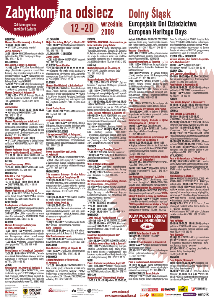 Zab ytkom na odsiecz Szlakiem grodów zamków i twierdz 12 -20 BiEruT ów Muzeum Ziemi Bier utowskiej, pl. Kościelny 2 19-20.09|15.00-18.00 wySTawa „Zamki, grody, twierdze” ZSP, pl. Kościelny 2 20.09|15.00KoncErT w wykonaniu młodzieży bierutowskiej, PoKaZ turnieju rycerskiego TEl.: 071 314 62 41 BolESławiEc MBP, galeria „Format”, ul. Sądowa 8 14. 09|12.00wyKłaD dr. romualda łuczyńskiego „Dolnośląskie rezydencje w czasach Polski ludowej – losy arystokratycznych siedzib w nowej rzeczywistości” 13.00rozstrzygnięcie konkursu fotograficznego „grody, zamki i twierdze Dolnego Śląska” oraz wErniSaż 14-30.09wySTawa fotografii konkursowych 15.09|11.00„Magia dolnośląskich zamków” – spotkanie z J. lamparską. TEl.: 075 732 44 19 Muzeum ceramiki, ul. Kutuzowa 14 17.09|14.00wyKłaD andrzeja olejniczaka „Twierdze śląskie w kampanii w latach 1806– 1807. Zaopatrzenie” TEl.: 075 644 22 00 BolKów Zamek Bolków 12 .0 9 | 12. 0 0-18 .0 0| 13 .0 9| 11.0 0 -15 .0 0 XVii-wieczny PiKniK HiSTorycZny TEl.: 075 741 32 97 BySTrZyca KłoDZKa Muzeum Filumenist yczne, Mały rynek 1 12.09|16.00wErniSaż „architektura rezydencjonalna ziemi kłodzkiej” i spotkanie z Markiem StadnickimlEKcJE MuZEalnE dla grup zorganizowanych „Średniowieczne zamki ziemi kłodzkiej”. TEl.: 074 811 06 37 BPMig pl. wolności 17 13.09|17.00 wySTawa „Pałace i dwory w gminie Bystrzyca Kłodzka” KoorDynaTor: tel. 074 811 76 73 cHoJnów Muzeum regionalne (Baszta Tkaczy, zamek Piastów legnicko-brzeskich), pl. Zamkowy 3 12 i 19 .09| 11.0 0-16.00ZwiEDZaniE muzeum, wejście na Basztę Tkaczy TEl.: 076 818 83 53 cZErna Zamek renesansowy z 1558 r. 12-13.09| 10.00-18.00ZwiEDZaniE zamku z przewodnikiem. TEl.: 076 831 44 56 DoBroSZycE Pałac XVii w., Park Przypałacowy ul. wojska Polskiego 25 12, 13, 19, 20.09|10.00, 12.00, 14.00 Dni oTwarTE. TEl.: 071 314 14 85 DuSZniKi ZDróJ Muzeum Papiernictwa, ul. Kłodzka 42 13.09|9.30PrElEKcJa dr. Bogdana czechowicza „Zamek Homole”. wyciEcZKa do ruin zamku Homole. TEl.: 074 866 92 48, wew. 26 DZiErżoniów izba regionalna, ul. Świdnicka 30 19.09|11.00„Zamki średniowiecznego Dzierżoniowa” – KonFErEncJa, PoKaZ multimedialny 20.0 9|11.00„gilów – grodzisko na terenie ziemi dzierżoniowskiej” – KonFErEncJa, PoKaZ multimedialny. TEl.: 502 31 87 36 głogów Muzeum archeologiczno-His tor yczne ul. Brama Brzostowska 1 12.09|16.00-17.00 wyKłaD „Znaczenie badań archeologiczno-architektonicznych w odbudowie historycznego układu przestrzennego zabudowy oraz zabytków architektury głogowa” 17.00-18.00 wyKłaD „Siedziby szlacheckie ziemi głogowskiej” TEl.: 076 834 10 81 HEnryKów Dawny klasztor oo. cys tersów, pl. cys tersów 1 12-20.09|9.00-18.00wySTawa „Z klasztoru na zamek. Przekształcenie dawnego klasztoru cysterskiego w Henrykowie w rezydencję książęcą” TEl.: 074 810 50 50 Jawor gimnazjum nr 1 w Jawor ze ul. Moniuszki 4 15-19.09|8.00-13.00EKSPoZycJa „Jawor średniowieczny gród“wySTawa prac uczniowskich promująca relikty fortyfikacji miejskich JaworawyKłaD uzasadniający sens i potrzebę ochrony dziedzictwa kulturowego TEl.:603939006 D ol n y Ślą s k w r z e ś n i a E u r o pe j s k ie D n i D z i ed z i ct w a E u r o pe a n H e r i t ag e D a y s 2 00 9 JElEnia góra raDKów niedziela 11.00-16.00BEZPłaTnE ZwiEDZaniE cornu cervi Kopaniec)PoKaZy Husyckiej roty Miejski Dom Kultur y „Muflon”, ul. cieplicka 172 w yciEcZKa rowErowa szlakiem zamków, pa- wystawy „Zamki, grody, twierdze polskie na walo- PieszejPrEZEnTacJa efektów realizacji prorach filatelistycznych. Znaczki, karty, koperty oraz jektu młodzieżowego „legenda Bolczowa”pre19.09|11.00wErniSaż wystawy poplenero- łaców i kościołów gminy radków wej „Szlakiem zamków, grodów i twierdz” 19.09| 10.00wyJaZD z Tłumaczowa.Trasa: ich projekty 1931-2003” TEl.: 071 346 95 84 zentacja materiałów historycznych nt. Zamku Bolczów wieczorny SPEKTaKl przygotowany TEl.: 075 755 37 70 Tłumaczów, Ścinawka g., Ścinawka Śr., Ścinawka wrocław – Stare Miasto D., radków, zakończenie w wambierzycach. na tra- 19.09|9.00SPacEr nad fosą szlakiem murów przez tancerzy ognia. TEl.: 605 05 95 52 JElEnia góra – SoBiESZów sie przejazdu możliwość zobaczenia obiektów obronnych wrocławia, spotkanie przed rotundą Pa- JElEnia góra – JagniąTKów Zamek chojnik Muzeum Miejskie „Dom gerhar ta Hauptman14.09|10.00-17.00wSTęP wolny na zamek w Sarnach, Kapitanowie oraz w ratnie Dolnym noramy racławickiej TEl.: 607440178 ZgłoSZEnia Do 15.09 TEl.:/fax 074 8712 270 Muzeum Etnograficzne, ul. Traugutta 111/113 na”ul. Michałowicka 32 TEl.: 075 752 36 27 13.09|11.00wyKłaD mgr. Jerzego czyżyckie- 12.09|17.00KoncErT oPErowy SoBóTKa KlicZKów Zamek Kliczków go „warmątowice – olszewski – Sienkiewicz. Za- willa łąkowy Kamień TEl.: 075 755 32 86 12-13,19-20.09|12.30, 13.30, 15.00, 16.30 Muzeum Ślężańskie, ul. Św. Jakuba 18 pis testamentowy” JElEnia góra BEZPłaTnE ZwiEDZaniE Zamku Kliczków oraz wySTawa „Z dziejów zamku na Ślęży” 19.09|11.00wyKłaD dr Danuty nespiak Dwór czarne w Jeleniej górze otaczającego go zabytkowego parku, zaprojekto- TEl.: 071 316 26 22 „Zamki, twierdze, pałace i i ii rzeczypospolitej 12-13.09, 19-20.09|od 10.00ZwiEDZaniE wanego przez Eduarda Petzolda (grupy maks. Syców na Kresach” TEl.: 071 344 88 93 dworu z prezentacją koncepcji „wszechnicy Dwór do 25 osób) TEl.: 071 341 93 83 Muzeum regionalne, Plac wolności 7 11.09|17.00oTwarciE wySTawy „Były so- 17.09|18.00oTwarciE wySTawy „Zamki czarne” TEl.:/fax. 075 649 53 61 KłoDZKo gór skie – hi sto ria i le gen da” ze zbio rów Dzia łu Muzeum Ziemi Kłodzkiej, ul. łukasiewicza 4 bie zamki…” (czynna do 30.09 oprócz poniedział- grafiki Muzeum narodowego. TEl.: 071 343 07 27 Pałac Paulinum, ul. nowowiejska 62 12-13.09, 19-20 .09|10.00-14.00 (o pełnych 22.09|17.00wyKłaD dr. romualda łuczyń- ków, w godz. 9.00–