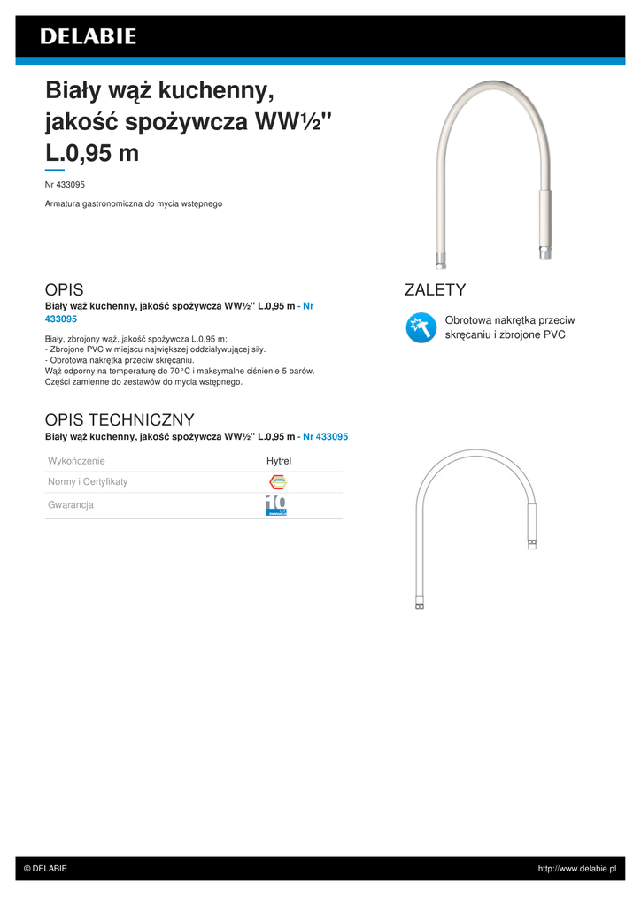 Biały wąż kuchenny, jakość spożywcza WW½" L.0,95 m Nr 433095 Armatura gastronomiczna do mycia wstępnego OPIS ZALETY Biały wąż kuchenny, jakość spożywcza WW½" L.0,95 m - Nr 433095 Biały, zbrojony wąż, jakość spożywcza L.0,95 m: - Zbrojone PVC w miejscu największej oddziaływującej siły. - Obrotowa nakrętka przeciw skręcaniu. Wąż odporny na temperaturę do 70°C i maksymalne ciśnienie 5 barów. Części zamienne do zestawów do mycia wstępnego. Obrotowa nakrętka przeciw skręcaniu i zbrojone PVC OPIS TECHNICZNY Biały wąż kuchenny, jakość spożywcza WW½" L.0,95 m - Nr 433095 Wykończenie Hytrel Normy i Certyfikaty Gwarancja © DELABIE http://www.delabie.pl