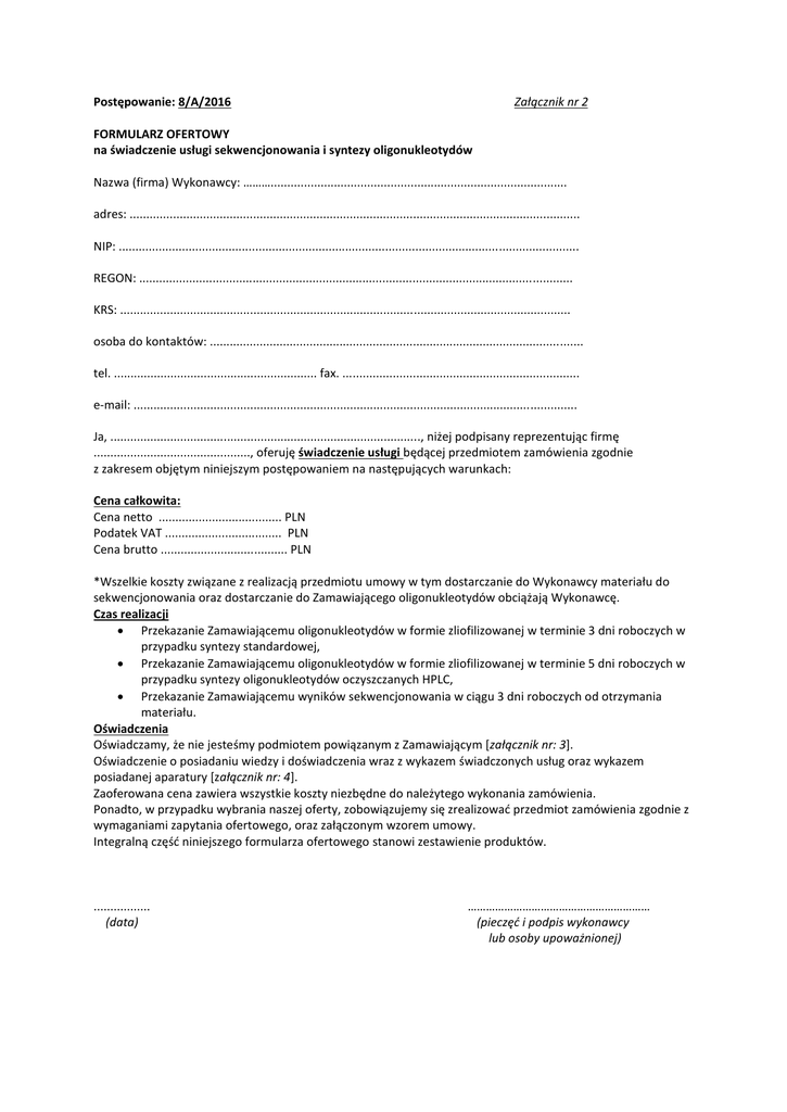 Postępowanie: 8/A/2016 Załącznik nr 2 FORMULARZ OFERTOWY na świadczenie usługi sekwencjonowania i syntezy oligonukleotydów Nazwa (firma) Wykonawcy: ………......................................................................................... adres: ....................................................................................................................................... NIP: .......................................................................................................................................... REGON: .................................................................................................................................. KRS: ....................................................................................................................................... osoba do kontaktów: ................................................................................................................ tel. ............................................................. fax. ....................................................................... e-mail: ..................................................................................................................................... Ja, ............................................................................................., niżej podpisany reprezentując firmę ..............................................., oferuję świadczenie usługi będącej przedmiotem zamówienia zgodnie z zakresem objętym niniejszym postępowaniem na następujących warunkach: Cena całkowita: Cena netto ..................................... PLN Podatek VAT ................................... PLN Cena brutto ...................................... PLN *Wszelkie koszty związane z realizacją przedmiotu umowy w tym dostarczanie do Wykonawcy materiału do sekwencjonowania oraz dostarczanie do Zamawiającego oligonukleotydów obciążają Wykonawcę. Czas realizacji Przekazanie Zamawiającemu oligonukleotydów w formie zliofilizowanej w terminie 3 dni roboczych w przypadku syntezy standardowej, Przekazanie Zamawiającemu oligonukleotydów w formie zliofilizowanej w terminie 5 dni roboczych w przypadku syntezy oligonukleotydów oczyszczanych HPLC, Przekazanie Zamawiającemu wyników sekwencjonowania w ciągu 3 dni roboczych od otrzymania materiału. Oświadczenia Oświadczamy, że nie jesteśmy podmiotem powiązanym z Zamawiającym [załącznik nr: 3]. Oświadczenie o posiadaniu wiedzy i doświadczenia wraz z wykazem świadczonych usług oraz wykazem posiadanej aparatury [załącznik nr: 4]. Zaoferowana cena zawiera wszystkie koszty niezbędne do należytego wykonania zamówienia. Ponadto, w przypadku wybrania naszej oferty, zobowiązujemy się zrealizować przedmiot zamówienia zgodnie z wymaganiami zapytania ofertowego, oraz załączonym wzorem umowy. Integralną część niniejszego formularza ofertowego stanowi zestawienie produktów. ................. (data) …………………………………………………… (pieczęć i podpis wykonawcy lub osoby upoważnionej) Zestawienie stanowiące część formularza ofertowego [Załącznik nr 2 ] Część: 1 usługa wykonania sekwencjonowania. Lp. Usługa Jednostka Cena netto PLN za jednostkę Ilość szacunkowa roczna 1 sekwencjonowanie standardowe - serwis podstawowy: usługa obejmuje przygotowanie reakcji z użyciem starterów dostarczonych przez klienta, lub starterów uniwersalnych dostarczanych bezpłatnie przez Wykonawcę [należy podać wykaz starterów]. Wyniki przedstawione są w formie dokumentu tekstowego zawierajacego sekwencję oraz fluorogramu w formacie .pdf i .abi lub .ab1 (otwieranych przez program FinchTV lub Chromas ). Gwarantowana długość odczytu to minimum: 500 nukleotydów. reakcja 3000 2 sekwencjonowanie - trudne matryce: Usługa obejmuje sekwencjonowanie matryc wymagających specjalnych protokołów lub specjalnych zestawów odczynników. Są to matryce zawierające struktury typu szpilki do włosów, matryce bogate w pary GC oraz zawierające motywy repetytywne i ciągi pojedynczych zasad. Usługa jest realizowana po konsultacji z klientem, gdy sekwencjonowanie podstawowe nie dało zadowalającego rezultatu. reakcja 500 3 sekwencjonowanie - Extra long run: usługa taka jak w serwisie podstawowym, reakcje odczytywane na dłuższych kapilarach umożliwiają uzyskanie wyniku w granicach 1000-1100 nukleotydów. reakcja 10 4 odczytanie reakcji przygotowanej przez klienta: [należy ustalić rodzaj KIT-u wykorzystywanego do reakcji] reakcja 100 5 Oczyszczanie matrycy: usługa obejmuje oczyszczenie produktu PCR z nadmiaru starterów lub dNTpów pozostałych po reakcji PCR. reakcja 500 Uwagi: Wykonawca uzupełnia rubrykę "cena za jednostkę". Część: 2 usługa syntezy oligonukleotydów standardowych. Lp. Usługa Cena za zasadę netto PLN Gwarantowana wydajność OD(260)* Szacunkowa liczba roczna 1 synteza oligonukleotydów o długości: 15-80 nt, oczyszczane Standard [odsalane przez precypitację etanolem, stopień czystości wystarczający do standardowych zastosowań (reakcja PCR i sekwencjonowanie)],skala syntezy 20 nmoli 3 960 2 synteza oligonukleotydów o długości: 15-80 nt, oczyszczane Standard [odsalane przez precypitację etanolem, stopień czystości wystarczający do standardowych zastosowań (reakcja PCR i sekwencjonowanie)], skala syntezy 40 nmoli 5 2220 3 synteza oligonukleotydów o długości: 15-80 nt, oczyszczane HPLC, skala syntezy 40 nmoli 2,5 100 *Gwarantowane wydajności odnoszą się do 20-meru +/- 20%. Dla oligonukleotydów >33 zasad - nie wymagana gwarantowana ilość. Uwagi: Wykonawca uzupełnia rubryki "cena za zasadę netto".