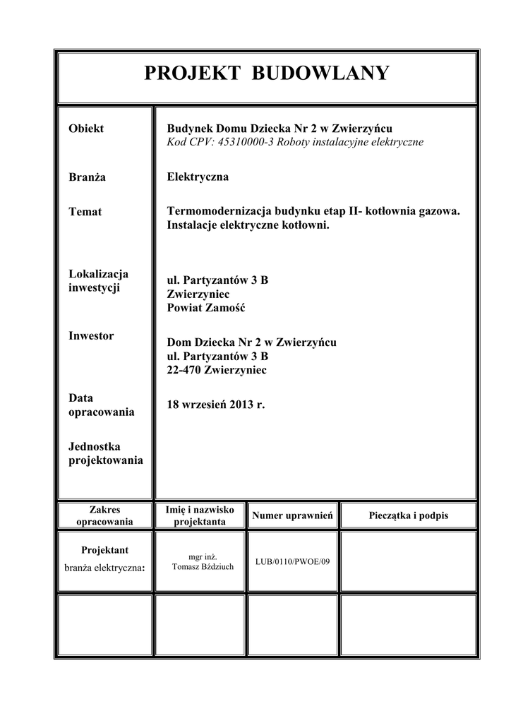 PROJEKT BUDOWLANY Obiekt Budynek Domu Dziecka Nr 2 w Zwierzyńcu Kod CPV: 45310000-3 Roboty instalacyjne elektryczne Branża Elektryczna Temat Termomodernizacja budynku etap II- kotłownia gazowa. Instalacje elektryczne kotłowni. Lokalizacja inwestycji Inwestor Data opracowania ul. Partyzantów 3 B Zwierzyniec Powiat Zamość Dom Dziecka Nr 2 w Zwierzyńcu ul. Partyzantów 3 B 22-470 Zwierzyniec 18 wrzesień 2013 r. Jednostka projektowania Zakres opracowania Projektant branża elektryczna: Imię i nazwisko projektanta mgr inż. Tomasz Bździuch Numer uprawnień LUB/0110/PWOE/09 Pieczątka i podpis SPIS ZAWARTOŚCI PROJEKTU Lp. 1 Wyszczególnienie 2 Str. lub nr rys. 4 1. Uprawnienia budowlane wraz z zaświadczeniem – projektant. Zał. nr 1 2. Opis techniczny 3. Rysunki 1-7 E1-E6 Spis treści INFORMACJA O PLANIE BEZPIECZEŃSTWA I OCHRONY ZDROWIA........................................3 1 Opis Techniczny....................................................................................................................................5 1.1 Zakres opracowania.......................................................................................................................5 1.2 Podstawa opracowania..................................................................................................................5 1.3 Dane energetyczne.........................................................................................................................5 1.4 Doprowadzenie i pomiar energii energii.......................................................................................5 1.5 Tablice rozdzielcze i WLZ............................................................................................................5 1.6 Instalacje elektryczne.....................................................................................................................5 1.7 Ochrona od porażeń.......................................................................................................................6 1.8 Ochrona przepięciowa...................................................................................................................6 1.9 System detekcji gazu.....................................................................................................................6 2 Bilans mocy...........................................................................................................................................7 Uwagi końcowe:........................................................................................................................................7 Stosowanie materiałów:............................................................................................................................7 Spis rysunków E1- Rzut piwnic- inwentaryzacja instalacji elektrycznej............................................................................ E2- Rzut piwnic- instalacja oświetleniowa................................................................................................. E3- Rzut piwnic- instalacja gniazdowa....................................................................................................... E4- Rzut piwnic- koryta kablowe i zasilania urządzeń kotłowni................................................................ E5- Rzut piwnic- system detekcji gazu....................................................................................................... E6- Schemat ideowy i widok rozdzielnicy RK........................................................................................... 1 OŚWIADCZENIE Niniejszym oświadczam, że opracowany projekt budowlany: Obiekt: Budynek Domu Dziecka nr 2 w Zwierzyńcu Kody CPV: 45310000-3 Roboty instalacyjne elektryczne Branża: Elektryczna Temat: Termomodernizacja budynku etap II- kotłownia gazowa. Instalacje elektryczne kotłowni. Lokalizacja: ul. Partyzantów 3B 22-470 Zwierzyniec Powiat Zamość Inwestor: Dom Dziecka nr 2 w Zwierzyńcu ul. Partyzantów 3B 22-470 Zwierzyniec Data opracowania: 18 wrzesień 2013 r. jest sporządzony zgodnie z obowiązującymi przepisami oraz zasadami wiedzy technicznej („Prawo Budowlane” - art. 20.1. ust. 4) i kompletny w rozumieniu ustawy z dnia 07.07.1994r. „Prawo Budowlane” (Dz. U. 2010r. Nr 243 poz. 1623) oraz Rozporządzenia Ministra Transportu, Budownictwa i Gospodarki Morskiej z dnia 25 kwietnia 2012 r. w sprawie szczegółowego zakresu i formy projektu budowlanego. Projektant ... ......................................................... (podpis/pieczęć) 2 INFORMACJA O PLANIE BEZPIECZEŃSTWA I OCHRONY ZDROWIA (INFORMACJA BIOZ) BRANŻA ELEKTRYCZNA Obiekt: Budynek Domu Dziecka nr 2 w Zwierzyńcu Kody CPV: 45310000-3 Roboty instalacyjne elektryczne Branża: Elektryczna Temat: Termomodernizacja budynku etap II- kotłownia gazowa. Instalacje elektryczne kotłowni. Lokalizacja: ul. Partyzantów 3B 22-470 Zwierzyniec Powiat Zamość Inwestor: Dom Dziecka nr 2 w Zwierzyńcu ul. Partyzantów 3B 22-470 Zwierzyniec Data opracowania: 18 wrzesień 2013 r. Projektant ... ......................................................... (podpis/pieczęć) 3 Część opisowa wg § 2.1. rozporządzenia Ministra Infrastruktury z dnia 23 czerwca 2004r. w sprawie informacji dotyczącej bezpieczeństwa i ochrony zdrowia oraz planu bezpieczeństwa i ochrony zdrowia (Dz.U.03.120.1126). 1. Zakres robót: a) według przedmiaru robót planowanej inwestycji. 2. Kolejność realizacji poszczególnych obiektów: a) według harmonogramu sporządzonego przez wykonawcę. 3. Wykaz istniejących obiektów budowlanych: a) według planu zagospodarowania inwestycji. 4. Elementy zagospodarowania działki lub terenu, które mogą stwarzać zagrożenie bezpieczeństwa i zdrowia ludzi: a) brak. 5. Przewidywane zagrożenia występujące podczas realizacji robót budowlanych: a) prace na wysokości ponad 5m. b) roboty elektryczne pomiarowe i rozruchowe. 6. Wskazanie sposobu prowadzenia in