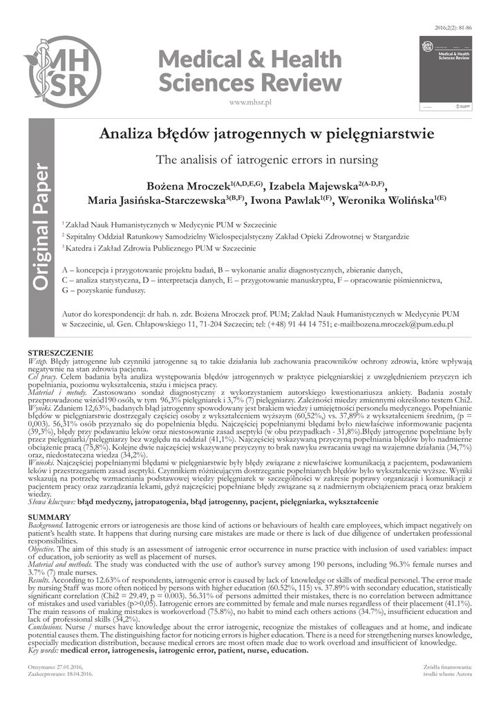 2016;2(2): 81-86 e-ISSN 2450-1670 Volume 2 Issue 2 Medical & Health Sciences Review www.mhsr.pl www.mhsr.pl Original Paper Analiza błędów jatrogennych w pielęgniarstwie The analisis of iatrogenic errors in nursing Bożena Mroczek1(A,D,E,G), Izabela Majewska2(A-D,F), Maria Jasińska-Starczewska3(B,F), Iwona Pawlak1(F), Weronika Wolińska1(E) Zakład Nauk Humanistycznych w Medycynie PUM w Szczecinie Szpitalny Oddział Ratunkowy Samodzielny Wielospecjalstyczny Zakład Opieki Zdrowotnej w Stargardzie 3 Katedra i Zakład Zdrowia Publicznego PUM w Szczecinie 1 2 A – koncepcja i przygotowanie projektu badań, B – wykonanie analiz diagnostycznych, zbieranie danych, C – analiza statystyczna, D – interpretacja danych, E – przygotowanie manuskryptu, F – opracowanie piśmiennictwa, G – pozyskanie funduszy. Autor do korespondencji: dr hab. n. zdr. Bożena Mroczek prof. PUM; Zakład Nauk Humanistycznych w Medycynie PUM w Szczecinie, ul. Gen. Chłapowskiego 11, 71-204 Szczecin; tel: (+48) 91 44 14 751; e-mail:[email protected] STRESZCZENIE Wstęp. Błędy jatrogenne lub czynniki jatrogenne są to takie działania lub zachowania pracowników ochrony zdrowia, które wpływają negatywnie na stan zdrowia pacjenta. Cel pracy. Celem badania była analiza występowania błędów jatrogennych w praktyce pielęgniarskiej z uwzględnieniem przyczyn ich popełniania, poziomu wykształcenia, stażu i miejsca pracy. Materiał i metody. Zastosowano sondaż diagnostyczny z wykorzystaniem autorskiego kwestionariusza ankiety. Badania zostały przeprowadzone wśród190 osób, w tym 96,3% pielęgniarek i 3,7% (7) pielęgniarzy. Zależności miedzy zmiennymi określono testem Chi2. Wyniki. Zdaniem 12,63%, badanych błąd jatrogenny spowodowany jest brakiem wiedzy i umiejętności personelu medycznego. Popełnianie błędów w pielęgniarstwie dostrzegały częściej osoby z wykształceniem wyższym (60,52%,) vs. 37,89% z wykształceniem średnim, (p = 0,003). 56,31% osób przyznało się do popełnienia błędu. Najczęściej popełnianymi błędami było niewłaściwe informowanie pacjenta (39,3%), błędy przy podawaniu leków oraz niestosowanie zasad aseptyki (w obu przypadkach - 31,8%).Błędy jatrogenne popełniane były przez pielęgniarki/pielęgniarzy bez względu na oddział (41,1%). Najczęściej wskazywaną przyczyną popełniania błędów było nadmierne obciążenie pracą (75,8%). Kolejne dwie najczęściej wskazywane przyczyny to brak nawyku zwracania uwagi na wzajemne działania (34,7%) oraz, niedostateczna wiedza (34,2%). Wnioski. Najczęściej popełnianymi błędami w pielęgniarstwie były błędy związane z niewłaściwe komunikacją z pacjentem, podawaniem leków i przestrzeganiem zasad aseptyki. Czynnikiem różnicującym dostrzeganie popełnianych błędów było wykształcenie wyższe. Wyniki wskazują na potrzebę wzmacniania podstawowej wiedzy pielęgniarek w szczególności w zakresie poprawy organizacji i komunikacji z pacjentem pracy oraz zarządzania lekami, gdyż najczęściej popełniane błędy związane są z nadmiernym obciążeniem pracą oraz brakiem wiedzy. Słowa kluczowe: błąd medyczny, jatropatogenia, błąd jatrogenny, pacjent, pielęgniarka, wykształcenie SUMMARY Background. Iatrogenic errors or iatrogenesis are those kind of actions or behaviours of health care employees, which impact negatively on patient’s health state. It happens that during nursing care mistakes are made or there is lack of due diligence of undertaken professional responsibilities. Objective. The aim of this study is an assessment of iatrogenic error occurrence in nurse practice with inclusion of used variables: impact of education, job seniority as well as placement of nurses. Material and methods. The study was conducted with the use of author’s survey among 190 persons, including 96.3% female nurses and 3.7% (7) male nurses. Results. According to 12.63% of respondents, iatrogenic error is caused by lack of knowledge or skills of medical personel. The error made by nursing Staff was more often noticed by persons with higher education (60.52%, 115) vs. 37.89% with secondary education, statistically significant correlation (Chi2 = 29.49, p = 0.003). 56.31% of persons admitted their mistakes, there is no correlation between admittance of mistakes and used variables (p>0,05). Iatrogenic errors are committed by female and male nurses regardless of their placement (41.1%). The main reasons of making mistakes is workoverload (75.8%), no habit to mind each others actions (34.7%), insufficient education and lack of professional skills (34,2%). Conclusions. Nurse / nurses have knowledge about the error iatrogenic, recognize the mistakes of colleagues and at home, and indicate potential causes them. The distinguishing factor for noticing errors is higher education. There is a need for strengthening nurses knowledge, especially medication distribution, because medical errors are most often made due to work overload and insufficient of knowledge. Key words: medical error, iatrogenesis, iatrogenic error, patient, nurse, education. Otrzymano: 27.01.2016, Zaakceptowano: 18.04.2016. Źródła finansowania: środki własne Autora Bożena Mroczek, Izabela Majewska, Maria Jasińska-Starczewska, Iwona Pawlak, Weronika Wolińska Analiza błędów jatrogennych w pielęgniarstwie WSTĘP Błędy medyczne, do których należą błędy jatrogenne stanowią poważny problem w Europie, tak uważa 78% Europejczyków, według badań w krajach Unii Europejskiej nawet w przypadku 10% wszystkich hospitalizacji może dochodzić do błędów medycznych. W roku 2012 - 91% Polaków uważało, że jest to istotny problem w naszym kraju [1]. W 2014 roku 41% badanych Polaków doświadczyło błędów medycznych, natomiast 15% wskazało, że ofiarami błędów były dzieci [2]. Dla przykładu w Norwegii w roku 2013 zdarzenia niepożądane jakimi były błędy w leczeniu, stanowiły 19% wszystkich zgłoszonych zdarzeń 