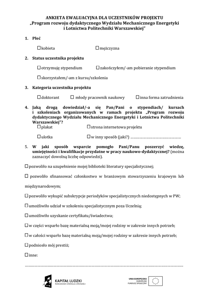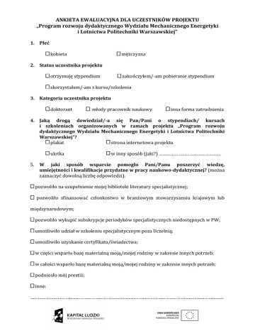 ANKIETA EWALUACYJNA DLA UCZESTNIKÓW PROJEKTU „Program rozwoju dydaktycznego Wydziału Mechanicznego Energetyki i Lotnictwa Politechniki Warszawskiej” 1. Płeć kobieta mężczyzna 2. Status uczestnika projektu otrzymuję stypendium zakończyłem/-am pobieranie stypendium skorzystałem/-am z kursu/szkolenia 3. Kategoria uczestnika projektu doktorant młody pracownik naukowy inna forma zatrudnienia 4. Jaką drogą dowiedział/-a się Pan/Pani o stypendiach/ kursach i szkoleniach organizowanych w ramach projektu „Program rozwoju dydaktycznego Wydziału Mechanicznego Energetyki i Lotnictwa Politechniki Warszawskiej”? plakat strona internetowa projektu ulotka 5. w inny sposób (jaki?) ………………………………………… W jaki sposób wsparcie pomogło Pani/Panu poszerzyć wiedzę, umiejętności i kwalifikacje przydatne w pracy naukowo-dydaktycznej? (można zaznaczyć dowolną liczbę odpowiedzi). pozwoliło na uzupełnienie mojej biblioteki literatury specjalistycznej; pozwoliło sfinansować członkostwo w branżowym stowarzyszeniu krajowym lub międzynarodowym; pozwoliło wykupić subskrypcje periodyków specjalistycznych niedostępnych w PW; umożliwiło udział w szkoleniu specjalistycznym poza Uczelnią; umożliwiło uzyskanie certyfikatu/świadectwa; w części wsparło bazę materialną moją/mojej rodziny w zakresie innych potrzeb; w całości wsparło bazę materialną moją/mojej rodziny w zakresie innych potrzeb; podniosło mój prestiż; inne: …………………………………………………………………………………………………………………………………… 6. Czy wsparcie otrzymane w ramach projektu „Program rozwoju dydaktycznego Wydziału Mechanicznego Energetyki i Lotnictwa Politechniki Warszawskiej” pomogło Pani/Panu w przygotowaniach rozprawy doktorskiej/ habilitacyjnej? zdecydowanie tak tak średnio nie zdecydowanie nie nie dotyczy (w jaki sposób pomogło lub nie? Proszę o podanie przykładu) …………………………………………………………………………………………………………………………………… …………………………………………………………………………………………………………………………………… 7. Czy długość okresu wsparcia okazała się adekwatna do potrzeb wynikających z bieżących zadań w pracy naukowej? (dotyczy stypendiów) Czy okres wsparcia okazał się adekwatny do Pani/Pana potrzeb wynikających z bieżących zadań w pracy naukowej? zdecydowanie tak tak (w sam raz) nie (był za krótki) zdecydowanie nie nie dotyczy 8. Proszę o wybranie stwierdzenia, które najlepiej opisuje Pani/Pana sytuację: (dotyczy stypendiów) w trakcie stypendium nie podejmowałem/-łam dodatkowych zajęć zarobkowych; stypendium pozwoliło całkowicie zaniechać podejmowania dodatkowych zajęć zarobkowych; stypendium pozwoliło w znacznym stopniu zaniechać podejmowania dodatkowych zajęć zarobkowych; stypendium pozwoliło częściowo zaniechać podejmowania dodatkowych zajęć zarobkowych; w trakcie pobierania stypendium nie mogłem/-łam zrezygnować z podejmowania dodatkowych zajęć zarobkowych, mimo przyznanego wsparcia; nie dotyczy 9. Czy dofinansowanie Państwa pracy badawczej w ramach projektu „Program rozwoju dydaktycznego Wydziału Mechanicznego Energetyki i Lotnictwa Politechniki Warszawskiej” jest/było wystarczające? tak nie Jeśli NIE, proszę o podanie realnej wysokości wsparcia, które według Pani/Pana byłoby satysfakcjonujące i wystarczające. ……..……PLN (stypendium) ……..……PLN (inna forma wsparcia) 10. Czy w przypadku braku dofinansowania szkolenia/kursu w ramach projektu „Program rozwoju dydaktycznego Wydziału Mechanicznego Energetyki i Lotnictwa Politechniki Warszawskiej”, sfinansowałby/sfinansowałaby Pan/Pani go ze środków własnych? tak nie 11. Proszę ocenić czy Pani/ Pana zdaniem udział w projekcie przyczynia się do podwyższenia jakości kształcenia na Wydziale Mechanicznym Energetyki i Lotnictwa Politechniki Warszawskiej? tak nie Każdą z odpowiedzi proszę uzasadnić. …………………………………………………………………………………………………………………………………… …………………………………………………………………………………………………………………………………… 12. Jakie są Pani/Pana plany po zakończeniu pobierania stypendium? kontynuacja studiów doktoranckich praca naukowo-dydaktyczna w szkolnictwie wyższym praca naukowo-badawcza w instytucie PAN bądź jednostce resortowej praca naukowo-badawcza w laboratorium przemysłowym samodzielna działalność gospodarcza praca w sektorze budżetowym wyjazd zarobkowy do innego kraju Unii Europejskiej wyjazd zarobkowy poza UE poszukiwanie pracy w woj. mazowieckim poszukiwanie pracy w innym regionie kraju poświęcenie rodzinie brak sprecyzowanych planów inne ___________________ 13. Co Pana/Pani zdaniem należałoby zmienić/ulepszyć w kolejnych latach realizacji projektu „Program rozwoju dydaktycznego Wydziału Mechanicznego Energetyki i Lotnictwa Politechniki Warszawskiej”? …………………………………………………………………………………………………………………………………… …………………………………………………………………………………………………………………………………… …………………………………………………………………………………………………………………………………… …………………………………………………………………………………………………………………………………… 14. Czy Pani/Pana zdaniem realizacja projektu „Program rozwoju dydaktycznego Wydziału Mechanicznego Energetyki i Lotnictwa Politechniki W