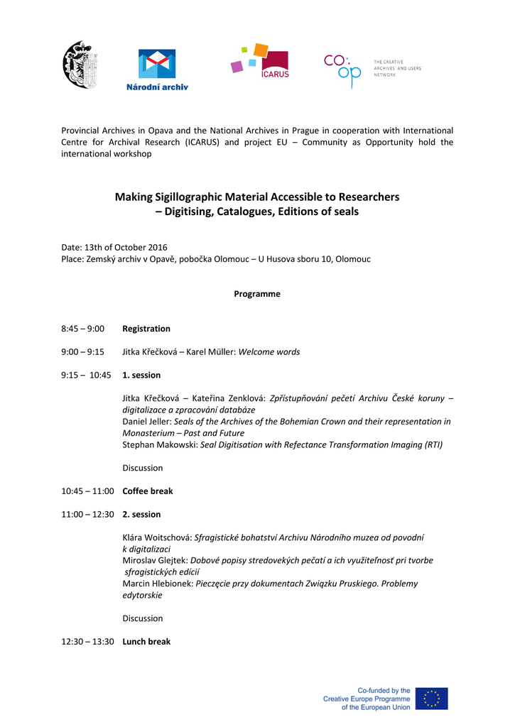 Provincial Archives in Opava and the National Archives in Prague in cooperation with International Centre for Archival Research (ICARUS) and project EU – Community as Opportunity hold the international workshop Making Sigillographic Material Accessible to Researchers – Digitising, Catalogues, Editions of seals Date: 13th of October 2016 Place: Zemský archiv v Opavě, pobočka Olomouc – U Husova sboru 10, Olomouc Programme 8:45 – 9:00 Registration 9:00 – 9:15 Jitka Křečková – Karel Müller: Welcome words 9:15 – 10:45 1. session Jitka Křečková – Kateřina Zenklová: Zpřístupňování pečetí Archivu České koruny – digitalizace a zpracování databáze Daniel Jeller: Seals of the Archives of the Bohemian Crown and their representation in Monasterium – Past and Future Stephan Makowski: Seal Digitisation with Refectance Transformation Imaging (RTI) Discussion 10:45 – 11:00 Coffee break 11:00 – 12:30 2. session Klára Woitschová: Sfragistické bohatství Archivu Národního muzea od povodní k digitalizaci Miroslav Glejtek: Dobové popisy stredovekých pečatí a ich využiteľnosť pri tvorbe sfragistických edícií Marcin Hlebionek: Pieczęcie przy dokumentach Związku Pruskiego. Problemy edytorskie Discussion 12:30 – 13:30 Lunch break 13:30 – 15:00 3. session Piotr Pokora: Uwagi i refleksje na marginesie prac nad edycją typariuszy z Archiwum Państwowego w Poznaniu Jiří L. Bílý: Novomoravští rodové – k edičnímu zpřístupnění jednoho olomouckého sfragistického pramene Karel Maráz: Korpus českých pečetí do nástupu Jana Lucemburského a aktuální fenomény evropské sfragistiky Discussion 15:00 – 15:30 Coffee break 15:30 – 17:30 4. session Ladislav Vrteľ: Představení mezinárodního sfragistického slovníku Martina Bolom-Kotari: Terminologické a metodologické problémy výzkumu novověkých pečetí Ilona Matejko-Peterka: Książęta, pieczęcie i władza. Studium ze sfragistyki Piastów legnicko-brzeskich Karel Müller – Jan Štěpán – Hana Seichterová: Archiv města Olomouce – katalog pečetí Final discussion 19:00 Dinner