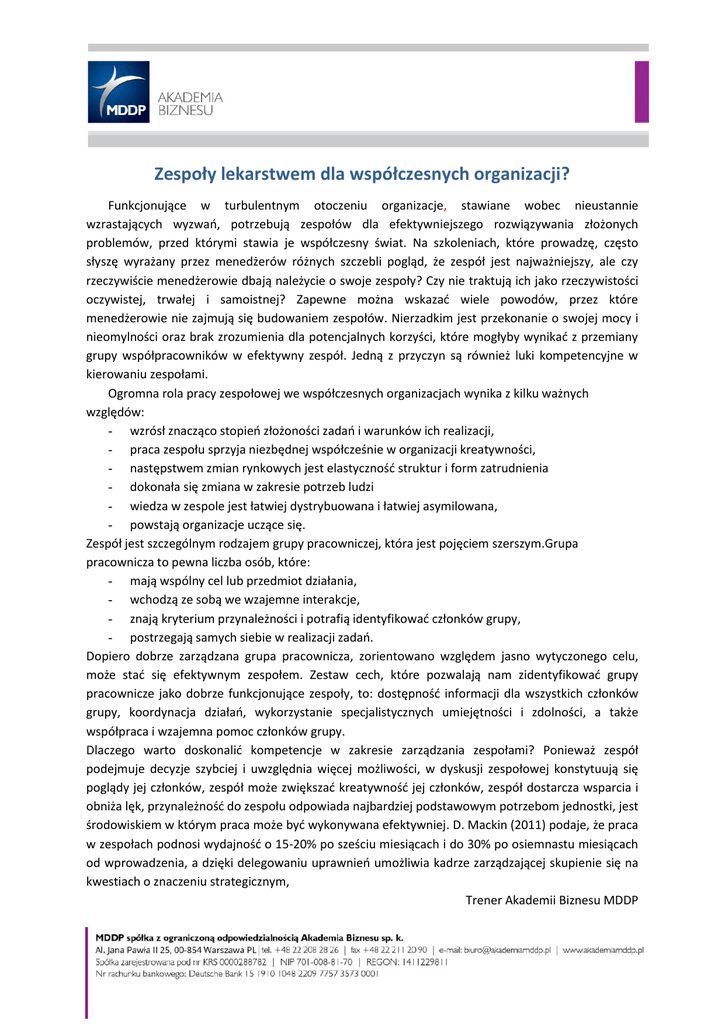 Zespoły lekarstwem dla współczesnych organizacji? Funkcjonujące w turbulentnym otoczeniu organizacje, stawiane wobec nieustannie wzrastających wyzwań, potrzebują zespołów dla efektywniejszego rozwiązywania złożonych problemów, przed którymi stawia je współczesny świat. Na szkoleniach, które prowadzę, często słyszę wyrażany przez menedżerów różnych szczebli pogląd, że zespół jest najważniejszy, ale czy rzeczywiście menedżerowie dbają należycie o swoje zespoły? Czy nie traktują ich jako rzeczywistości oczywistej, trwałej i samoistnej? Zapewne można wskazać wiele powodów, przez które menedżerowie nie zajmują się budowaniem zespołów. Nierzadkim jest przekonanie o swojej mocy i nieomylności oraz brak zrozumienia dla potencjalnych korzyści, które mogłyby wynikać z przemiany grupy współpracowników w efektywny zespół. Jedną z przyczyn są również luki kompetencyjne w kierowaniu zespołami. Ogromna rola pracy zespołowej we współczesnych organizacjach wynika z kilku ważnych względów: - wzrósł znacząco stopień złożoności zadań i warunków ich realizacji, - praca zespołu sprzyja niezbędnej współcześnie w organizacji kreatywności, - następstwem zmian rynkowych jest elastyczność struktur i form zatrudnienia - dokonała się zmiana w zakresie potrzeb ludzi - wiedza w zespole jest łatwiej dystrybuowana i łatwiej asymilowana, - powstają organizacje uczące się. Zespół jest szczególnym rodzajem grupy pracowniczej, która jest pojęciem szerszym.Grupa pracownicza to pewna liczba osób, które: - mają wspólny cel lub przedmiot działania, - wchodzą ze sobą we wzajemne interakcje, - znają kryterium przynależności i potrafią identyfikować członków grupy, - postrzegają samych siebie w realizacji zadań. Dopiero dobrze zarządzana grupa pracownicza, zorientowano względem jasno wytyczonego celu, może stać się efektywnym zespołem. Zestaw cech, które pozwalają nam zidentyfikować grupy pracownicze jako dobrze funkcjonujące zespoły, to: dostępność informacji dla wszystkich członków grupy, koordynacja działań, wykorzystanie specjalistycznych umiejętności i zdolności, a także współpraca i wzajemna pomoc członków grupy. Dlaczego warto doskonalić kompetencje w zakresie zarządzania zespołami? Ponieważ zespół podejmuje decyzje szybciej i uwzględnia więcej możliwości, w dyskusji zespołowej konstytuują się poglądy jej członków, zespół może zwiększać kreatywność jej członków, zespół dostarcza wsparcia i obniża lęk, przynależność do zespołu odpowiada najbardziej podstawowym potrzebom jednostki, jest środowiskiem w którym praca może być wykonywana efektywniej. D. Mackin (2011) podaje, że praca w zespołach podnosi wydajność o 15-20% po sześciu miesiącach i do 30% po osiemnastu miesiącach od wprowadzenia, a dzięki delegowaniu uprawnień umożliwia kadrze zarządzającej skupienie się na kwestiach o znaczeniu strategicznym, Trener Akademii Biznesu MDDP