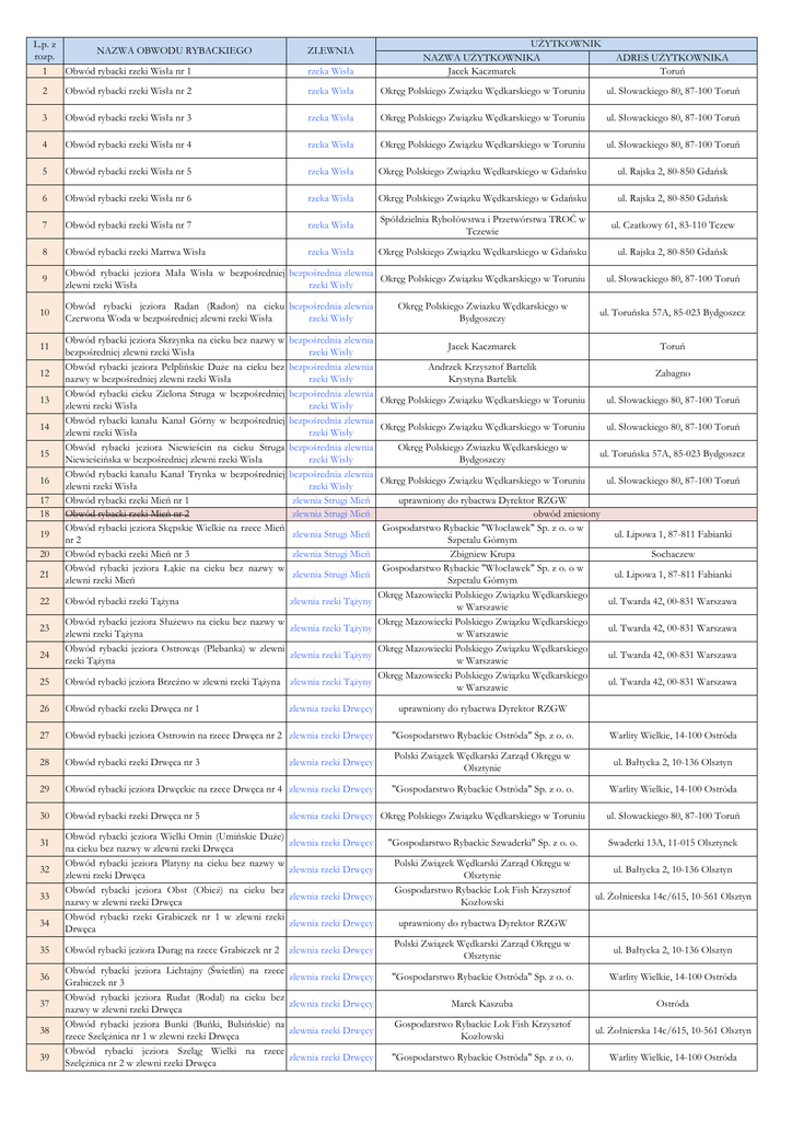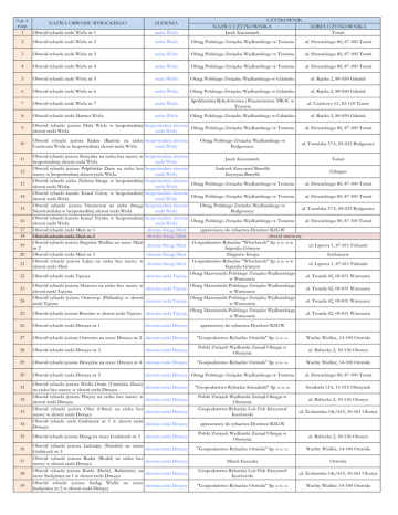 L.p. z NAZWA OBWODU RYBACKIEGO rozp. 1 Obwód rybacki rzeki Wisła nr 1 ZLEWNIA rzeka Wisła UŻYTKOWNIK NAZWA UŻYTKOWNIKA Jacek Kaczmarek ADRES UŻYTKOWNIKA Toruń 2 Obwód rybacki rzeki Wisła nr 2 rzeka Wisła Okręg Polskiego Związku Wędkarskiego w Toruniu ul. Słowackiego 80, 87-100 Toruń 3 Obwód rybacki rzeki Wisła nr 3 rzeka Wisła Okręg Polskiego Związku Wędkarskiego w Toruniu ul. Słowackiego 80, 87-100 Toruń 4 Obwód rybacki rzeki Wisła nr 4 rzeka Wisła Okręg Polskiego Związku Wędkarskiego w Toruniu ul. Słowackiego 80, 87-100 Toruń 5 Obwód rybacki rzeki Wisła nr 5 rzeka Wisła Okręg Polskiego Związku Wędkarskiego w Gdańsku ul. Rajska 2, 80-850 Gdańsk 6 Obwód rybacki rzeki Wisła nr 6 rzeka Wisła Okręg Polskiego Związku Wędkarskiego w Gdańsku ul. Rajska 2, 80-850 Gdańsk 7 Obwód rybacki rzeki Wisła nr 7 rzeka Wisła Spółdzielnia Rybołówstwa i Przetwórstwa TROĆ w Tczewie ul. Czatkowy 61, 83-110 Tczew 8 Obwód rybacki rzeki Martwa Wisła rzeka Wisła Okręg Polskiego Związku Wędkarskiego w Gdańsku ul. Rajska 2, 80-850 Gdańsk 9 Obwód rybacki jeziora Mała Wisła w bezpośredniej bezpośrednia zlewnia Okręg Polskiego Związku Wędkarskiego w Toruniu zlewni rzeki Wisła rzeki Wisły 10 Obwód rybacki jeziora Radan (Radon) na cieku bezpośrednia zlewnia rzeki Wisły Czerwona Woda w bezpośredniej zlewni rzeki Wisła 11 12 13 14 15 16 17 18 19 20 21 22 23 24 25 Okręg Polskiego Zwiazku Wędkarskiego w Bydgoszczy ul. Słowackiego 80, 87-100 Toruń ul. Toruńska 57A, 85-023 Bydgoszcz Obwód rybacki jeziora Skrzynka na cieku bez nazwy w bezpośredniej zlewni rzeki Wisła Obwód rybacki jeziora Pelplińskie Duże na cieku bez nazwy w bezpośredniej zlewni rzeki Wisła Obwód rybacki cieku Zielona Struga w bezpośredniej zlewni rzeki Wisła Obwód rybacki kanału Kanał Górny w bezpośredniej zlewni rzeki Wisła Obwód rybacki jeziora Niewieścin na cieku Struga Niewieścińska w bezpośredniej zlewni rzeki Wisła Obwód rybacki kanału Kanał Trynka w bezpośredniej zlewni rzeki Wisła Obwód rybacki rzeki Mień nr 1 Obwód rybacki rzeki Mień nr 2 Obwód rybacki jeziora Skępskie Wielkie na rzece Mień nr 2 Obwód rybacki rzeki Mień nr 3 Obwód rybacki jeziora Łąkie na cieku bez nazwy w zlewni rzeki Mień bezpośrednia zlewnia Jacek Kaczmarek Toruń rzeki Wisły bezpośrednia zlewnia Andrzek Krzysztof Bartelik Zabagno rzeki Wisły Krystyna Bartelik bezpośrednia zlewnia Okręg Polskiego Związku Wędkarskiego w Toruniu ul. Słowackiego 80, 87-100 Toruń rzeki Wisły bezpośrednia zlewnia Okręg Polskiego Związku Wędkarskiego w Toruniu ul. Słowackiego 80, 87-100 Toruń rzeki Wisły bezpośrednia zlewnia Okręg Polskiego Zwiazku Wędkarskiego w ul. Toruńska 57A, 85-023 Bydgoszcz rzeki Wisły Bydgoszczy bezpośrednia zlewnia Okręg Polskiego Związku Wędkarskiego w Toruniu ul. Słowackiego 80, 87-100 Toruń rzeki Wisły zlewnia Strugi Mień uprawniony do rybactwa Dyrektor RZGW obwód zniesiony zlewnia Strugi Mień Gospodarstwo Rybackie "Włocławek" Sp. z o. o w ul. Lipowa 1, 87-811 Fabianki zlewnia Strugi Mień Szpetalu Górnym zlewnia Strugi Mień Zbigniew Krupa Sochaczew Gospodarstwo Rybackie "Włocławek" Sp. z o. o w zlewnia Strugi Mień ul. Lipowa 1, 87-811 Fabianki Szpetalu Górnym Okręg Mazowiecki Polskiego Związku Wędkarskiego zlewnia rzeki Tążyny ul. Twarda 42, 00-831 Warszawa Obwód rybacki rzeki Tążyna w Warszawie Obwód rybacki jeziora Służewo na cieku bez nazwy w Okręg Mazowiecki Polskiego Związku Wędkarskiego zlewnia rzeki Tążyny ul. Twarda 42, 00-831 Warszawa zlewni rzeki Tążyna w Warszawie Obwód rybacki jeziora Ostrowąs (Plebanka) w zlewni Okręg Mazowiecki Polskiego Związku Wędkarskiego zlewnia rzeki Tążyny ul. Twarda 42, 00-831 Warszawa w Warszawie rzeki Tążyna Okręg Mazowiecki Polskiego Związku Wędkarskiego Obwód rybacki jeziora Brzeźno w zlewni rzeki Tążyna zlewnia rzeki Tążyny ul. Twarda 42, 00-831 Warszawa w Warszawie 26 Obwód rybacki rzeki Drwęca nr 1 27 Obwód rybacki jeziora Ostrowin na rzece Drwęca nr 2 zlewnia rzeki Drwęcy "Gospodarstwo Rybackie Ostróda" Sp. z o. o. Warlity Wielkie, 14-100 Ostróda 28 Obwód rybacki rzeki Drwęca nr 3 Polski Związek Wędkarski Zarząd Okręgu w Olsztynie ul. Bałtycka 2, 10-136 Olsztyn 29 Obwód rybacki jeziora Drwęckie na rzece Drwęca nr 4 zlewnia rzeki Drwęcy "Gospodarstwo Rybackie Ostróda" Sp. z o. o. Warlity Wielkie, 14-100 Ostróda 30 Obwód rybacki rzeki Drwęca nr 5 31 32 33 34 35 36 37 38 39 Obwód rybacki jeziora Wielki Omin (Umińskie Duże) na cieku bez nazwy w zlewni rzeki Drwęca Obwód rybacki jeziora Platyny na cieku bez nazwy w zlewni rzeki Drwęca Obwód rybacki jeziora Obst (Obież) na cieku bez nazwy w zlewni rzeki Drwęca Obwód rybacki rzeki Grabiczek nr 1 w zlewni rzeki Drwęca zlewnia rzeki Drwęcy zlewnia rzeki Drwęcy zlewnia rzeki Drwęcy Okręg Polskiego Związku Wędkarskiego w Toruniu ul. Słowackiego 80, 87-100 Toruń zlewnia rzeki Drwęcy Swaderki 13A, 11-015 Olsztynek zlewnia rzeki Drwęcy zlewnia rzeki Drwęcy zlewnia rzeki Drwęcy "Gospodarstwo Rybackie Szwaderki" Sp. z o. o. Polski Związek Wędkarski Zarząd Okręgu w Olsztynie Gospodarstwo Rybackie Lok Fish Krzysztof Kozłowski ul. Bałtycka 2, 10-136 Olsztyn ul. Żołnierska 14c/615, 10-561 Olsztyn uprawniony do rybactwa Dyrektor RZGW Polski Związek Wędkarski Zarząd Okręgu w Olsztynie ul. Bałtycka 2, 10-136 Olsztyn zlewnia rzeki Drwęcy "Gospodarstwo Rybackie Ostróda" Sp. z o. o. Warlity Wielkie, 14-100 Ostróda zlewnia rzeki Drwęcy Marek Kaszuba Ostróda zlewnia rzeki Drwęcy Gospodarstwo Rybackie Lok Fish Krzysztof Kozłowski ul. Żołnierska 14c/615, 10-561 Olsztyn zlewnia rzeki Drwęcy "Gospodarstwo Rybackie Ostróda" Sp. z o. o. Warlity Wielkie, 14-100 Ostróda Obwód rybacki jeziora Durąg na rzece Grabiczek nr 2 zlewnia rzeki Drwęcy Obwód rybacki jeziora Lichtajny (Świetlin) na rzece Grabiczek nr 3 Obwód rybacki jeziora Rudat (Roda