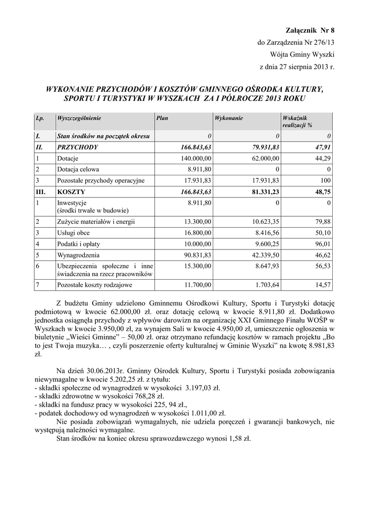 Załącznik Nr 8 do Zarządzenia Nr 276/13 Wójta Gminy Wyszki z dnia 27 sierpnia 2013 r. WYKONANIE PRZYCHODÓW I KOSZTÓW GMINNEGO OŚRODKA KULTURY, SPORTU I TURYSTYKI W WYSZKACH ZA I PÓŁROCZE 2013 ROKU Lp. Wyszczególnienie I. Stan środków na początek okresu II. Plan Wykonanie Wskaźnik realizacji % 0 0 0 PRZYCHODY 166.843,63 79.931,83 47,91 1 Dotacje 140.000,00 62.000,00 44,29 2 Dotacja celowa 8.911,80 0 0 3 Pozostałe przychody operacyjne 17.931,83 17.931,83 100 III. KOSZTY 166.843,63 81.331,23 48,75 1 Inwestycje (środki trwałe w budowie) 8.911,80 0 0 2 Zużycie materiałów i energii 13.300,00 10.623,35 79,88 3 Usługi obce 16.800,00 8.416,56 50,10 4 Podatki i opłaty 10.000,00 9.600,25 96,01 5 Wynagrodzenia 90.831,83 42.339,50 46,62 6 Ubezpieczenia społeczne i inne świadczenia na rzecz pracowników 15.300,00 8.647,93 56,53 7 Pozostałe koszty rodzajowe 11.700,00 1.703,64 14,57 Z budżetu Gminy udzielono Gminnemu Ośrodkowi Kultury, Sportu i Turystyki dotację podmiotową w kwocie 62.000,00 zł. oraz dotację celową w kwocie 8.911,80 zł. Dodatkowo jednostka osiągnęła przychody z wpływów darowizn na organizację XXI Gminnego Finału WOŚP w Wyszkach w kwocie 3.950,00 zł, za wynajem Sali w kwocie 4.950,00 zł, umieszczenie ogłoszenia w biuletynie „Wieści Gminne” – 50,00 zł. oraz otrzymano refundację kosztów w ramach projektu „Bo to jest Twoja muzyka… , czyli poszerzenie oferty kulturalnej w Gminie Wyszki” na kwotę 8.981,83 zł. Na dzień 30.06.2013r. Gminny Ośrodek Kultury, Sportu i Turystyki posiada zobowiązania niewymagalne w kwocie 5.202,25 zł. z tytułu: - składki społeczne od wynagrodzeń w wysokości 3.197,03 zł. - składki zdrowotne w wysokości 768,28 zł. - składki na fundusz pracy w wysokości 225, 94 zł., - podatek dochodowy od wynagrodzeń w wysokości 1.011,00 zł. Nie posiada zobowiązań wymagalnych, nie udziela poręczeń i gwarancji bankowych, nie występują należności wymagalne. Stan środków na koniec okresu sprawozdawczego wynosi 1,58 zł. Informacja o pracy GOKSiT za I półrocze 2013 r. GOKSiT i GBP od 01.01.2009 r. są niezależnymi instytucjami kultury, które jednak w gminie Wyszki funkcjonują w zasadzie, jako jedna placówka, i taka nazwa będzie używana dla tych dwóch instytucji łącznie lub zamiennie. Mieszczą się one w budynku Zespołu Szkół w Wyszkach przy ul. Szkolnej 17 ponadto funkcjonuje Filia w Strabli, również w budynku szkolnym. I. Kadra pracownicza GOKSiT : - Dyrektor – ¾ etatu - Główny Księgowy – ¼ etatu - organizator czasu wolnego (biomasażysta) – ½ etatu, do 30.11.2013 r., stanowisko utworzone w ramach projektu „Gminna rehabilitacja, współfinansowanego z funduszy unijnych, - stażysta (biomasażysta) – ½ etatu, do 07 maja 2013 r. - od 20.02 zatrudniony stażysta (PUP) – 1 etat do 19.08.2013 r. II. Godziny pracy: WYSZKI poniedziałek, środa: 8.00 – 16.00 wtorek, czwartek, piątek: 11.00 – 19.00 sobota: 13.00 – 19.00 Filia w STRABLI poniedziałek, środa, czwartek: 7.00 – 15.00 wtorek, piątek: 11.00 – 17.00 Godziny ulegają zmianie, jeśli jest taka potrzeba (realizowane projekty, zajęcia stałe itd.). III. Stałe formy pracy. 1. Klub Seniora w Wyszkach – 10 osób, spotkania raz w miesiącu, w Strabli – 20 osoby oraz w Topczewie i Niewinie Borowym, spotkania w zależności od potrzeb środowiska i możliwości członków poszczególnych klubów. 2. Codziennie czynne Czytelnie z dostępem do internetu: w Wyszkach - przy 8 stanowiskach komputerowych, w Strabli – 5 stanowisk. Możliwość drukowania, nagrywania CD/DVD. 3. Pracownia rekreacyjno – widowiskowa w Wyszkach, do dyspozycji: bilard, stół tenisowy, gra piłkarzyki, rzutki, urządzenia fitness (rowerki, steppery, ławeczki); w okresie styczeń – kwiecień dwa razy w tygodniu czynna była siłownia i sala sportowa w Strabli. 4. Punkt biomasażu i masażu relaksacyjnego czynny codziennie (poniedziałek – sobota). IV. Pozostała działalność statutowa. 1. Konkursy – Krzyżówka z hasłem - nr 1/2013 i 2/2013 w „Wieściach Gminnych”, „Rodzinne puszczanie latawców”, „Posesja Twoją wizytówką”, „Magiczny Świat Jana Brzechwy”. Łącznie – 6 konkursów stałych, konkursy i zabawy w czasie imprez (pikników, festynów). 2. Imprezy okolicznościowe (organizacja i współorganizacja) – świąteczno - noworoczne spotkanie opłatkowe Klubu Seniora SENATOR w Niewinie Borowym, V Spotkanie Seniorów Gminy Wyszki, współorganizacja akcji „Bezpieczeństwo i zdrowie na wsi”, inscenizacja – „Kochanym rodzicom”. 3. Imprezy plenerowe, festyny, pikniki – Wielka Orkiestra Świątecznej, rozgrywki w paintball, międzyszkolne mistrzostwa gminy w piłce nożnej chłopców, IV Gminny Dzień Papieski, udział w ogólnopolskiej akcji „Polska biega”, piknik „Witajcie wakacje”, turniej dzikich drużyn w piłce nożnej. Łącznie – 3 stałe formy wpisane w kalendarz imprez. 4. Pozostałe: 1) w zakresie upowszechniania czytelnictwa w GBP wśród uczniów prowadzone były spotkania, na których dzieci zapoznawały się z biblioteką, jej pracą i księgozbiorem. Wykonywane były gazetki i wystawki tematyczne. Odbywały się konkursy czytelnicze np.: „Magiczny Świat Jana Brzechwy”, inscenizacja „Jasełek” oraz uroczyste pasowanie na czytelnika uczniów klasy I w SP Strabla. 2) powstało Koło Sprawnych Rąk działające przy GBP. Zrealizowane tematy zajęć: „Aktywny wypoczynek” - nauka gry w bilard, „Kwiatek dla mojej mamy” - nauka robienia kwiatów z bibuły, „W prezencie babci” – cd. nauki wykonywania kwiatów z bibuły, „Tata nie jest gorszy” – zdobienie puszek po napojach regeneracyjnych. W spotkaniach bierze udział 13 uczennic pod opieką bibliotekarza p. Katarzyny Borowskiej. 3) prowadzenie akcji „Mobilna biblioteka” – wypożyczenia książek w domach czytelników mających problemy z poruszaniem się. 4) działalność statutowa G